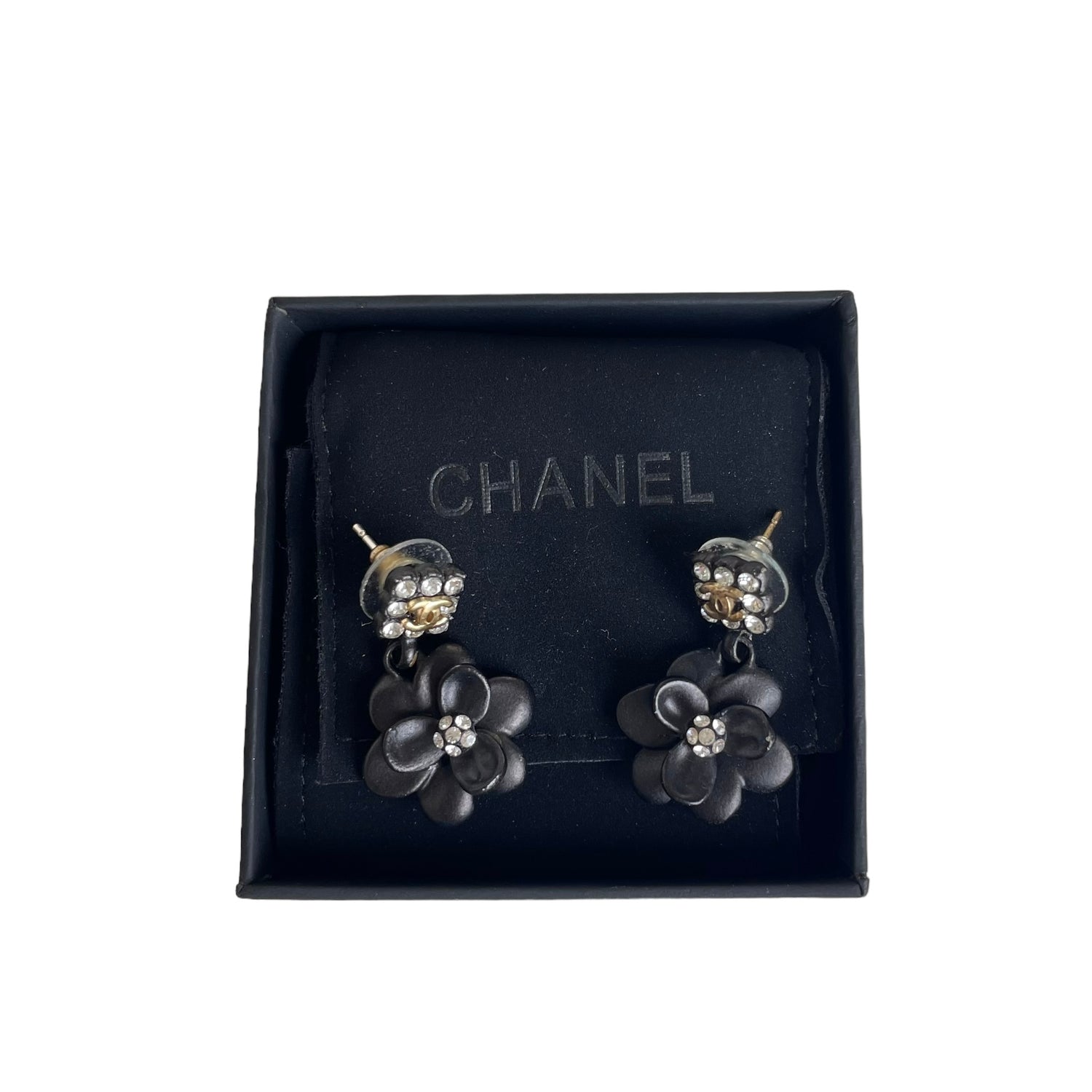 Chanel black flower drop earrings with gold logo and crystals. Comes with box.