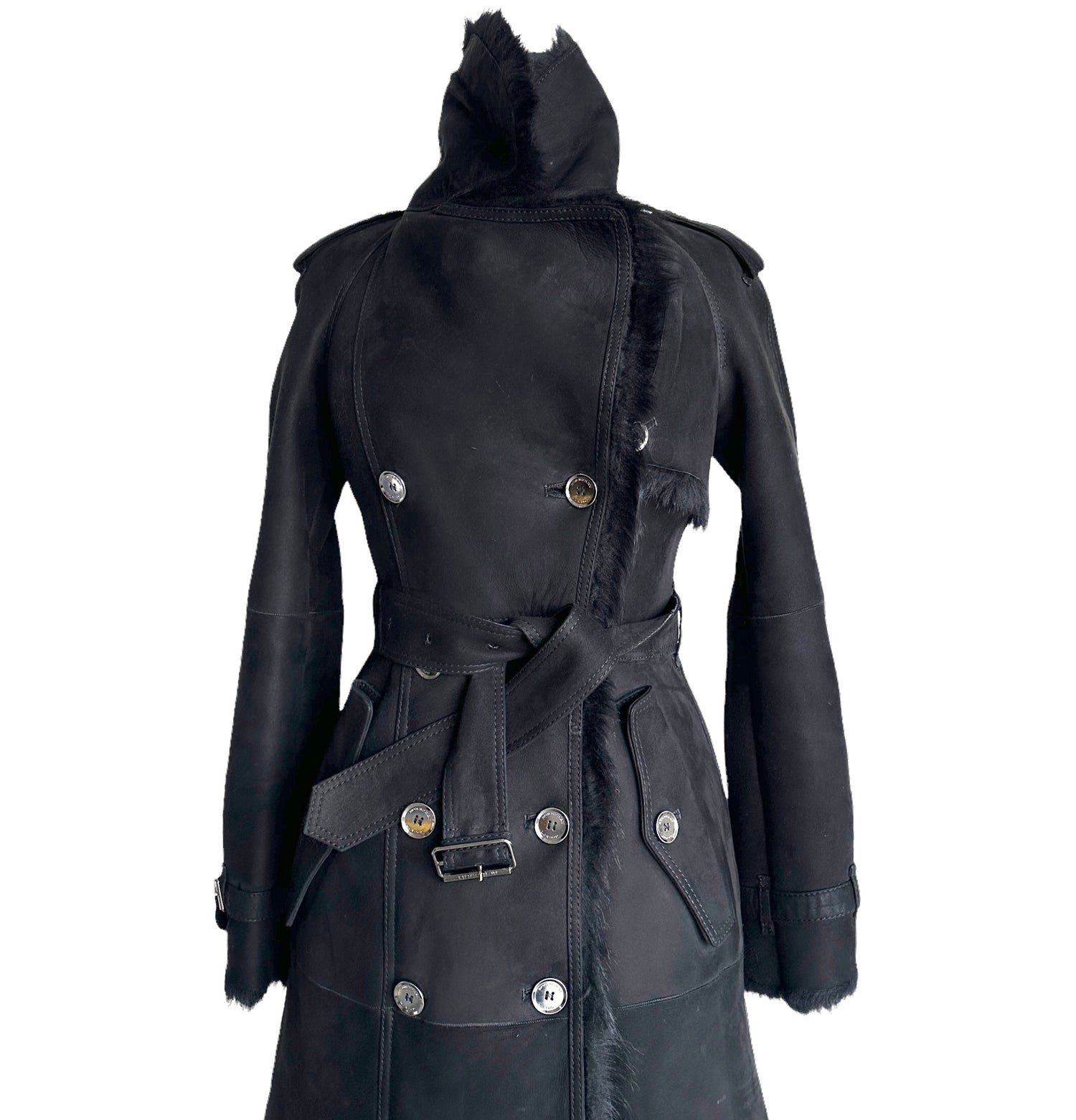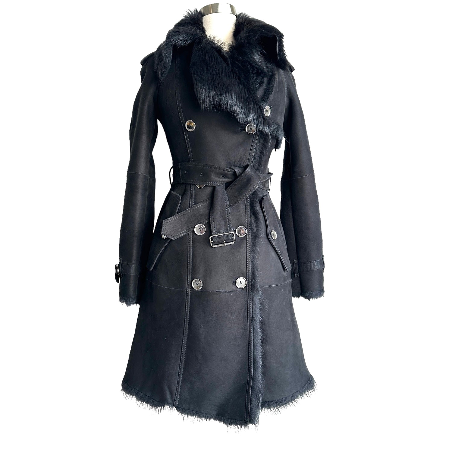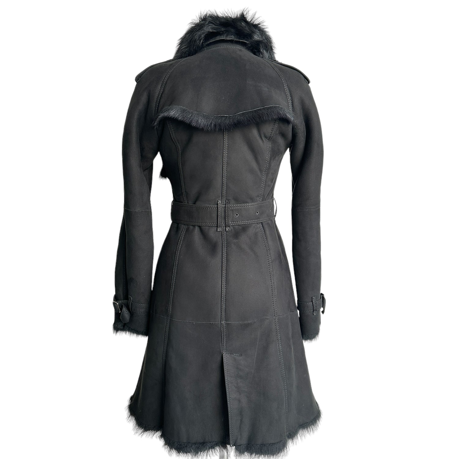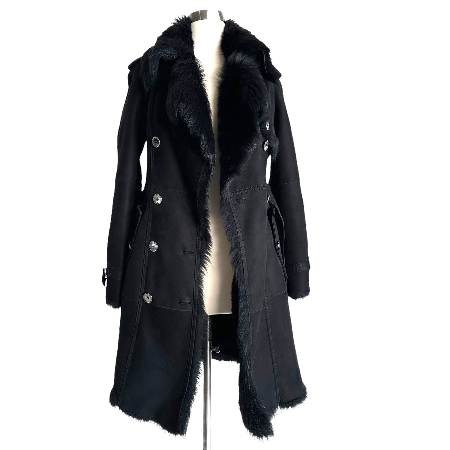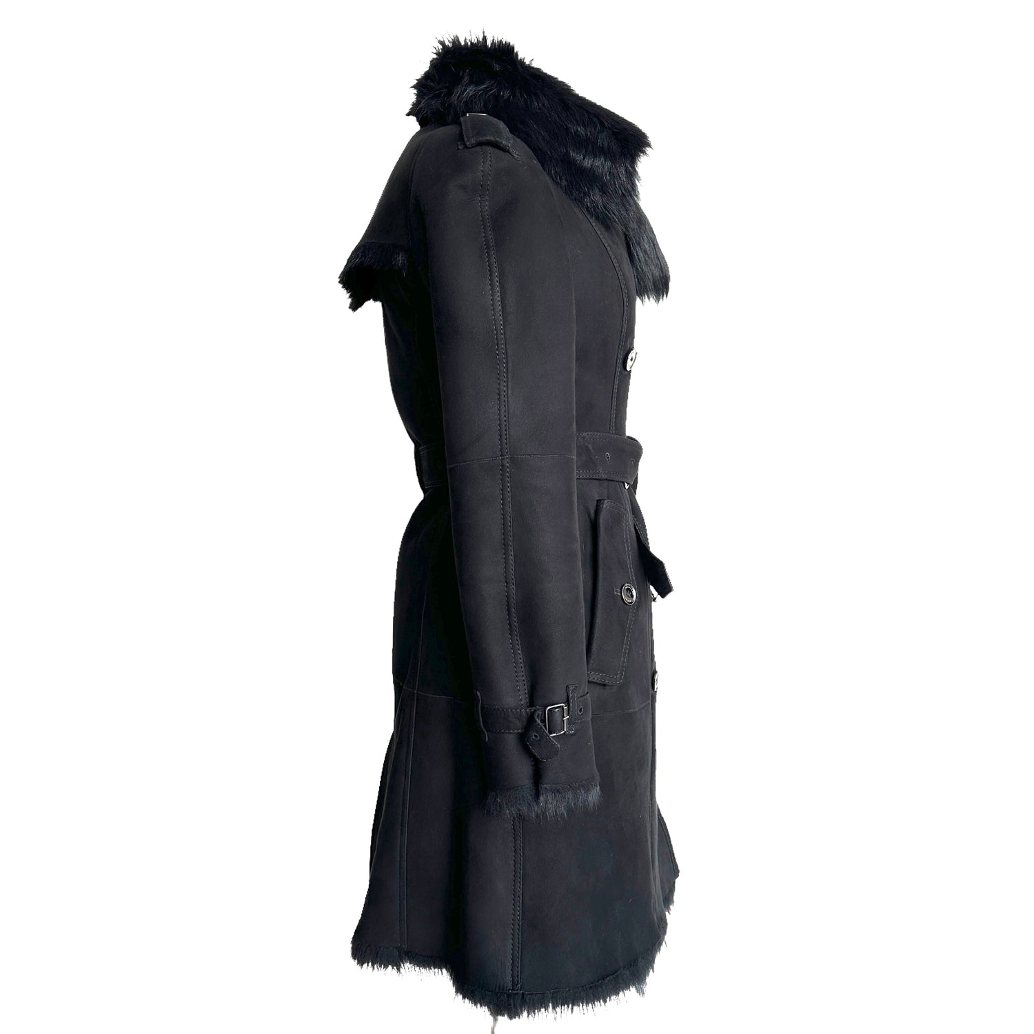 Burberry black fur coat. Trench style with black suede and fur interior. Pockets with buttons embellishments. Collar can be worn up or down. Button closure at front. Removable belt. Designer size 4.