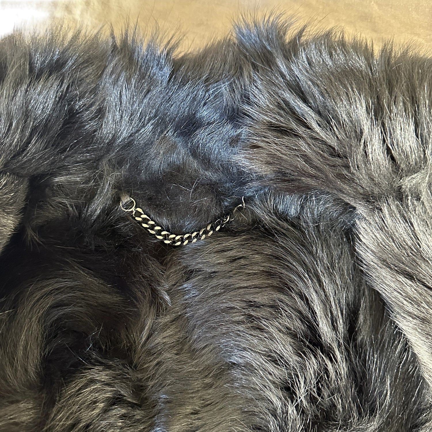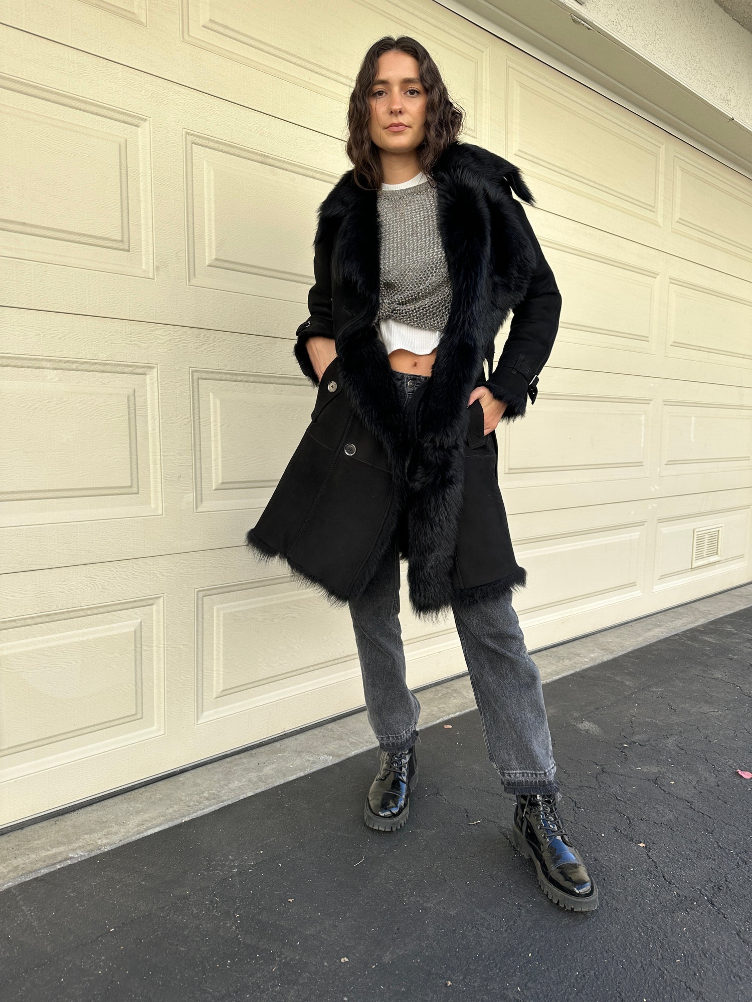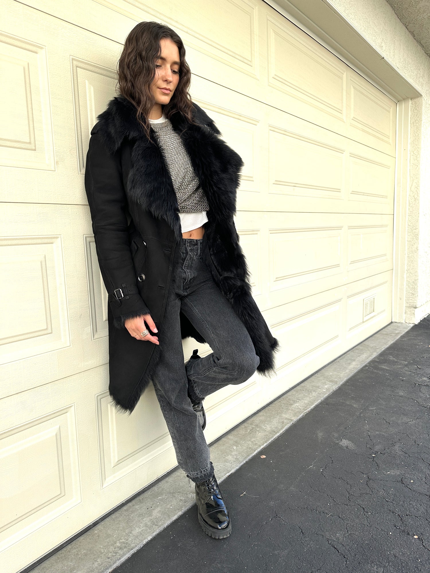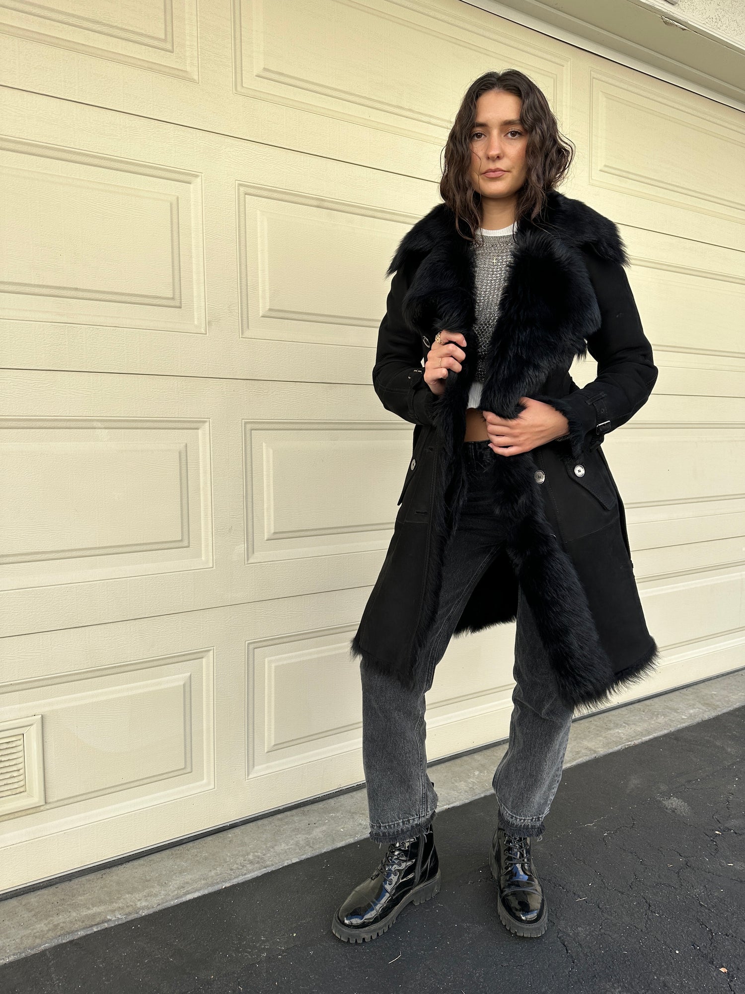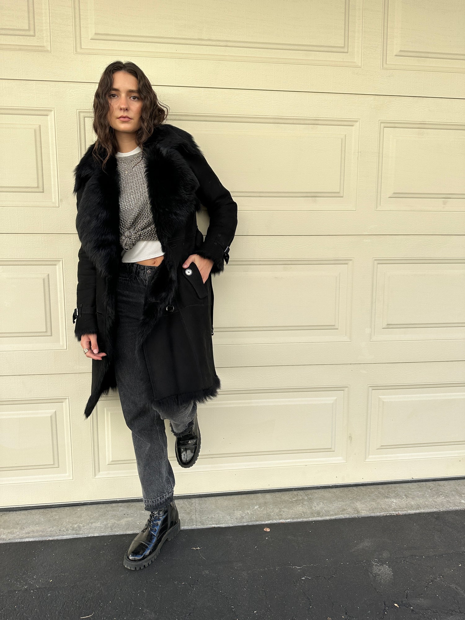 Burberry black fur coat. Trench style with black suede and fur interior. Pockets with buttons embellishments. Collar can be worn up or down. Button closure at front. Removable belt. Designer size 4.
