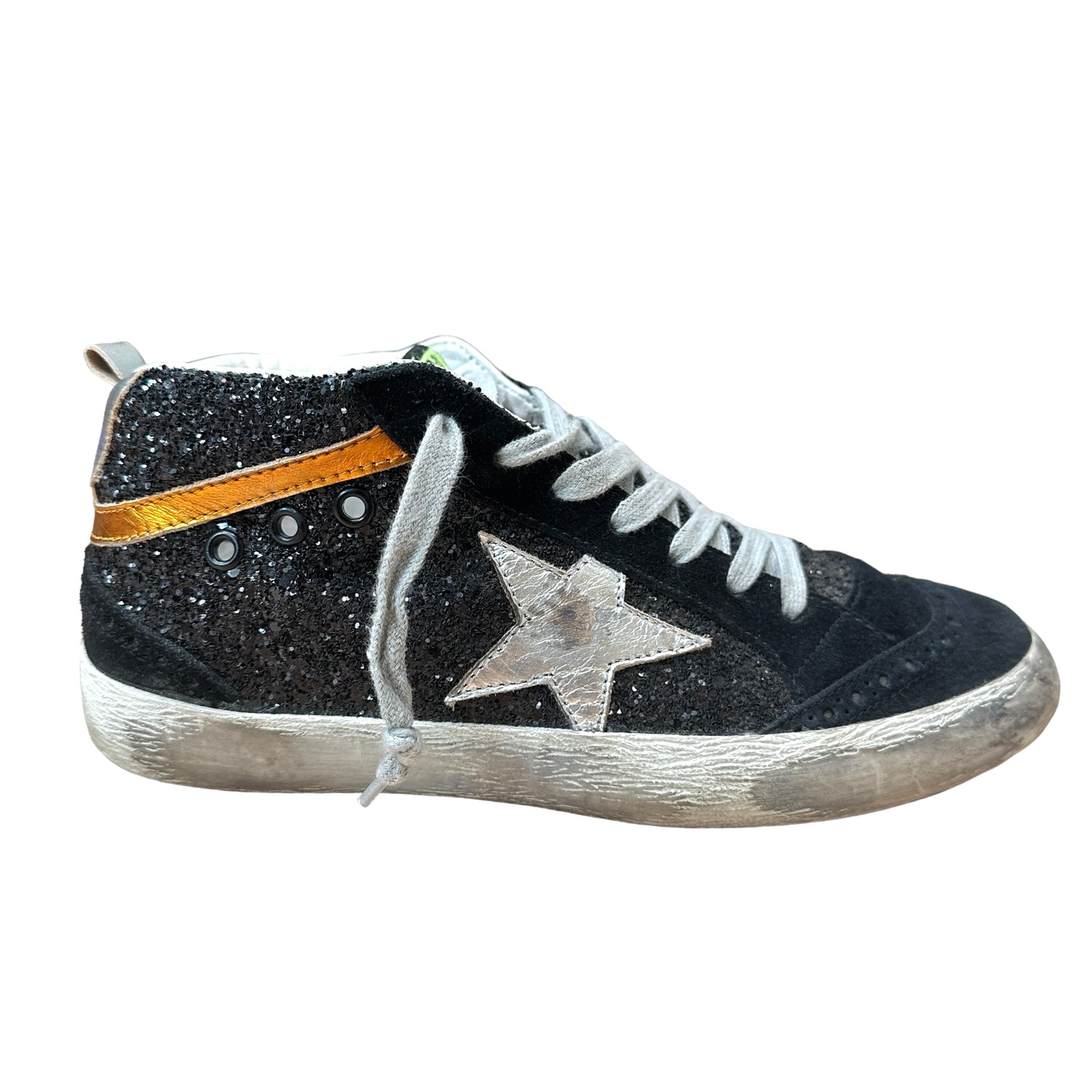 Golden Goose black glitter sneakers. Round toe. Grey laces at top. Orange stripes. Designer size 38.