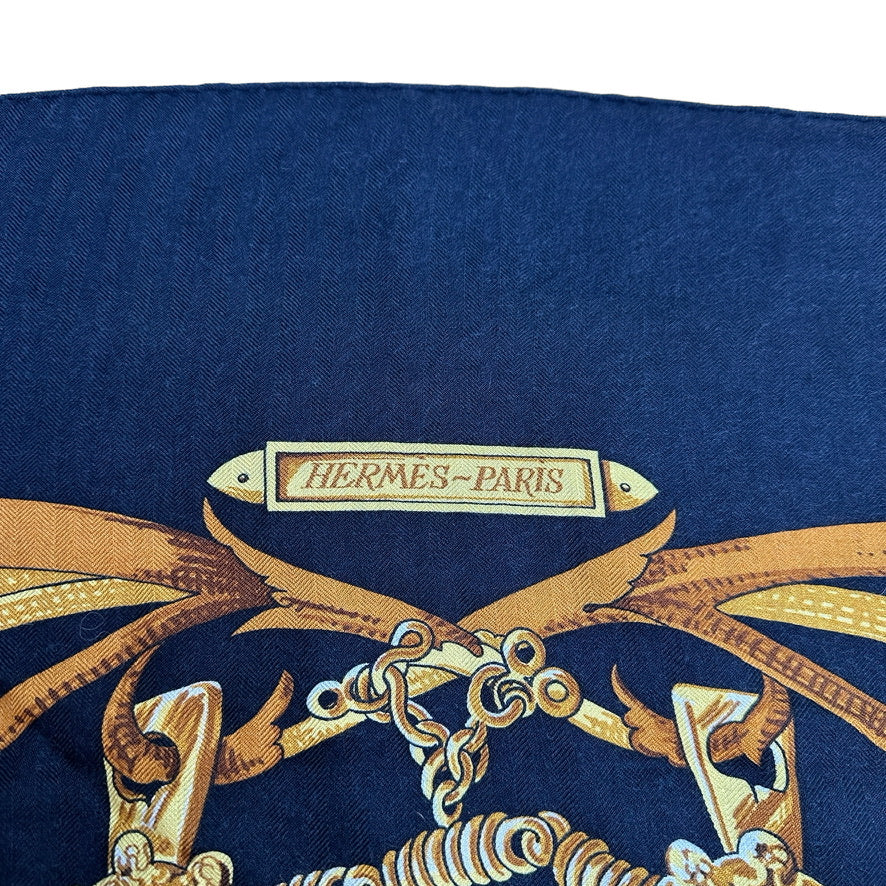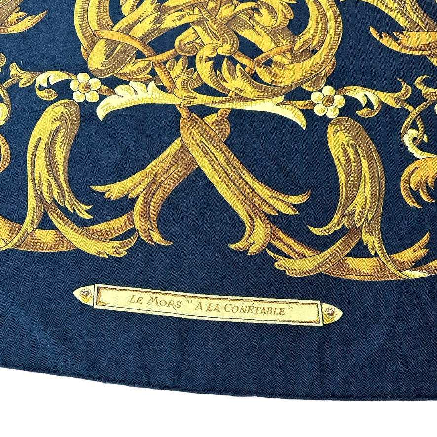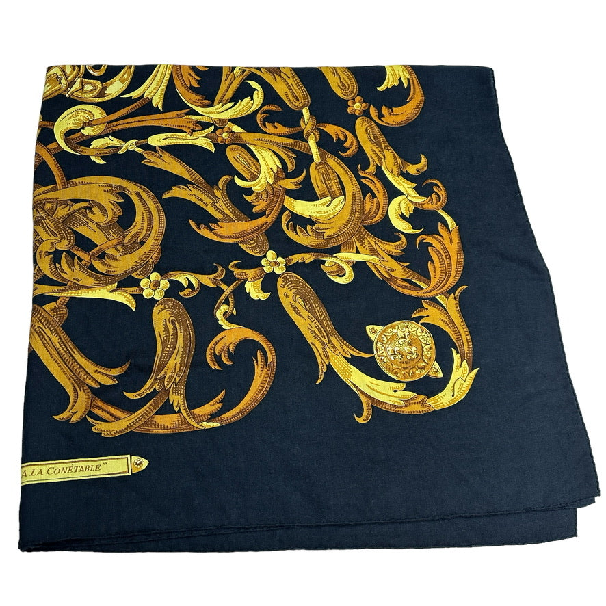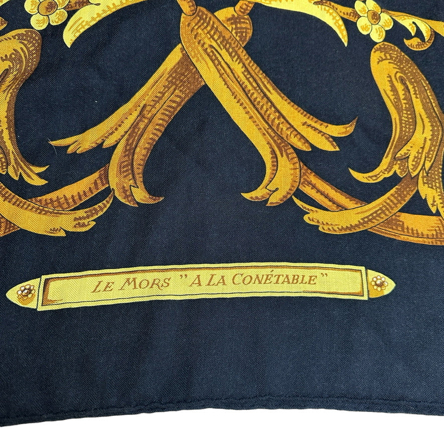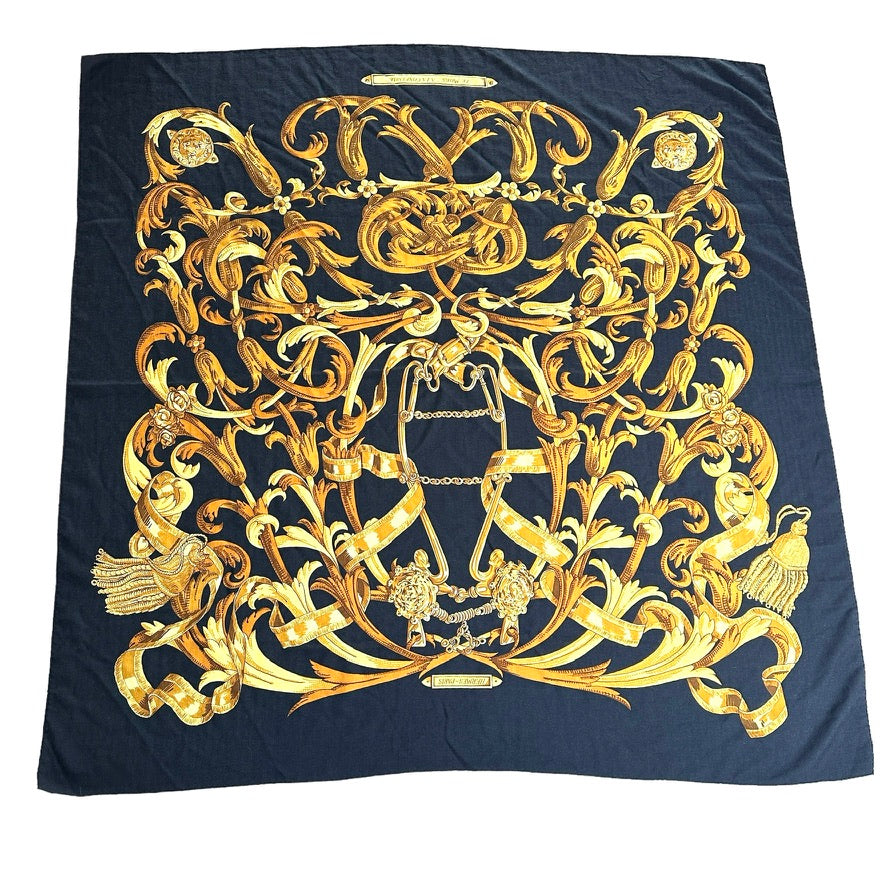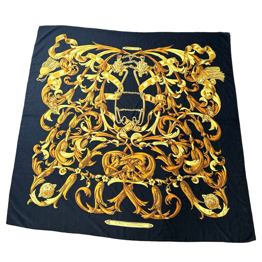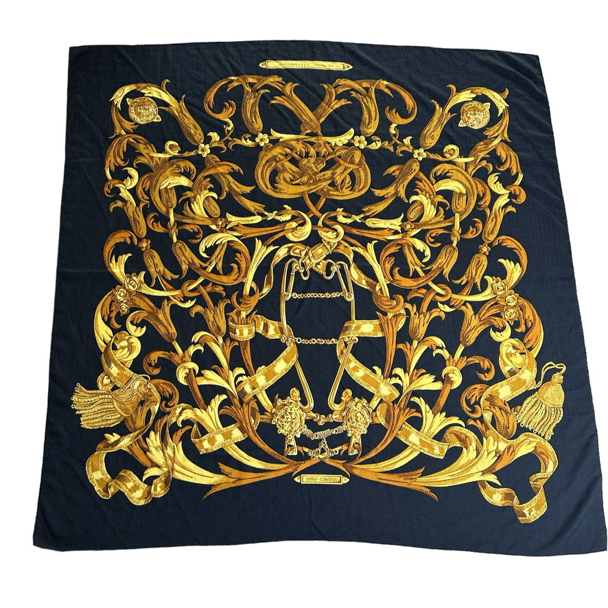 Hermes cashmere shawl. "Le Mors" a la Conetable theme. Square and extra large in black and gold colors.