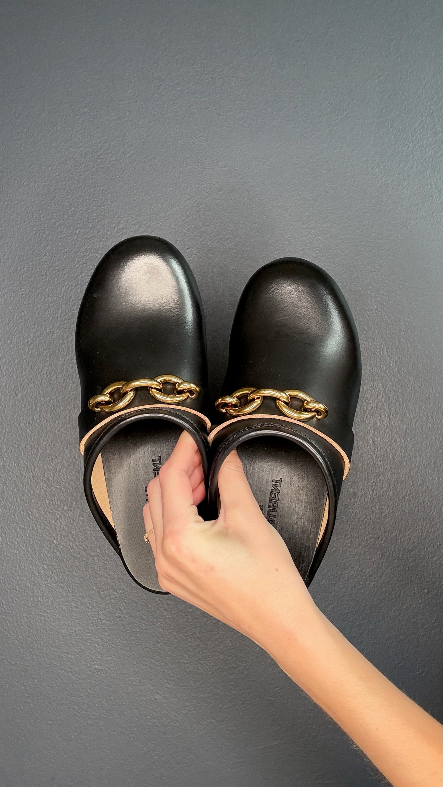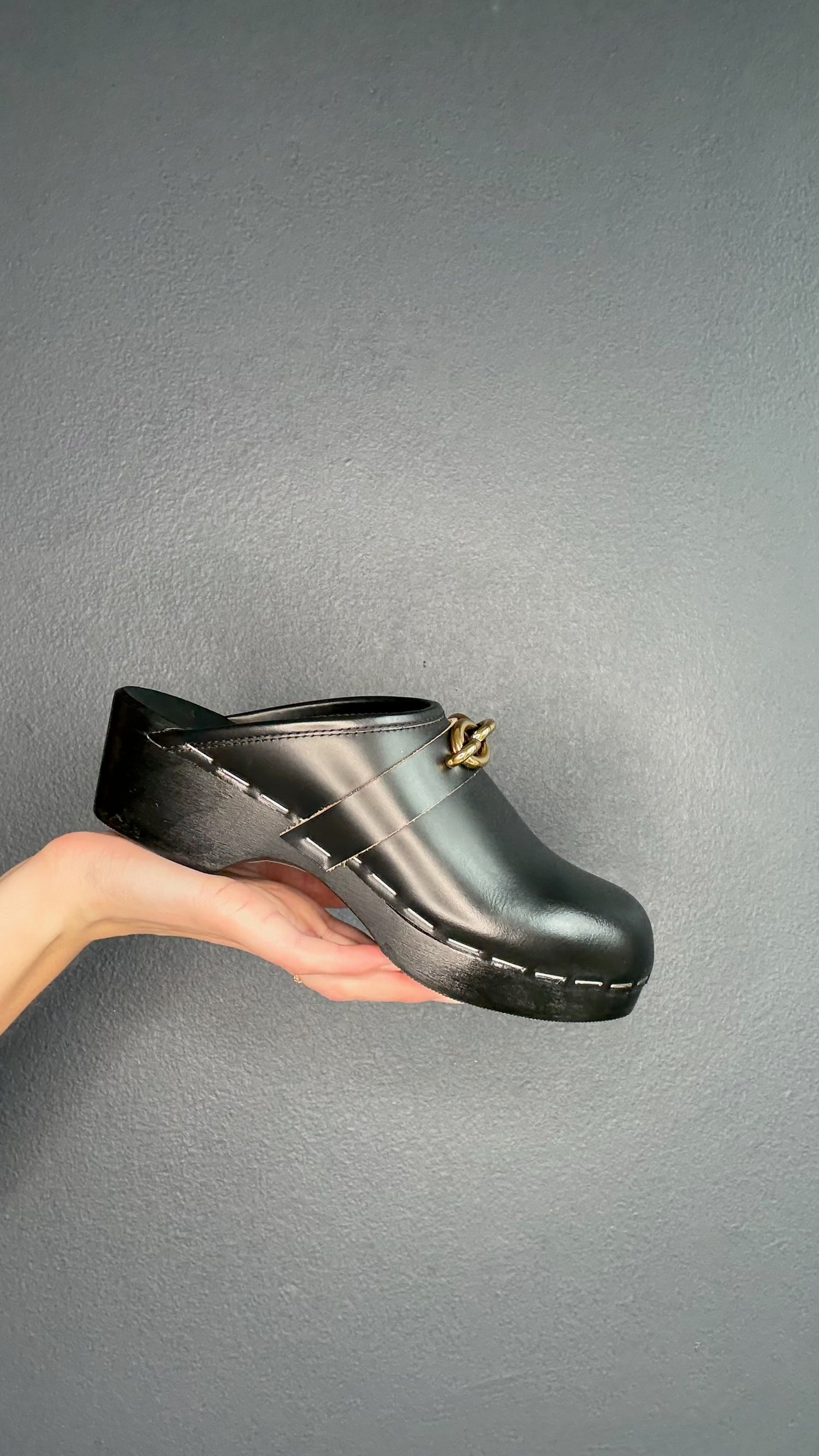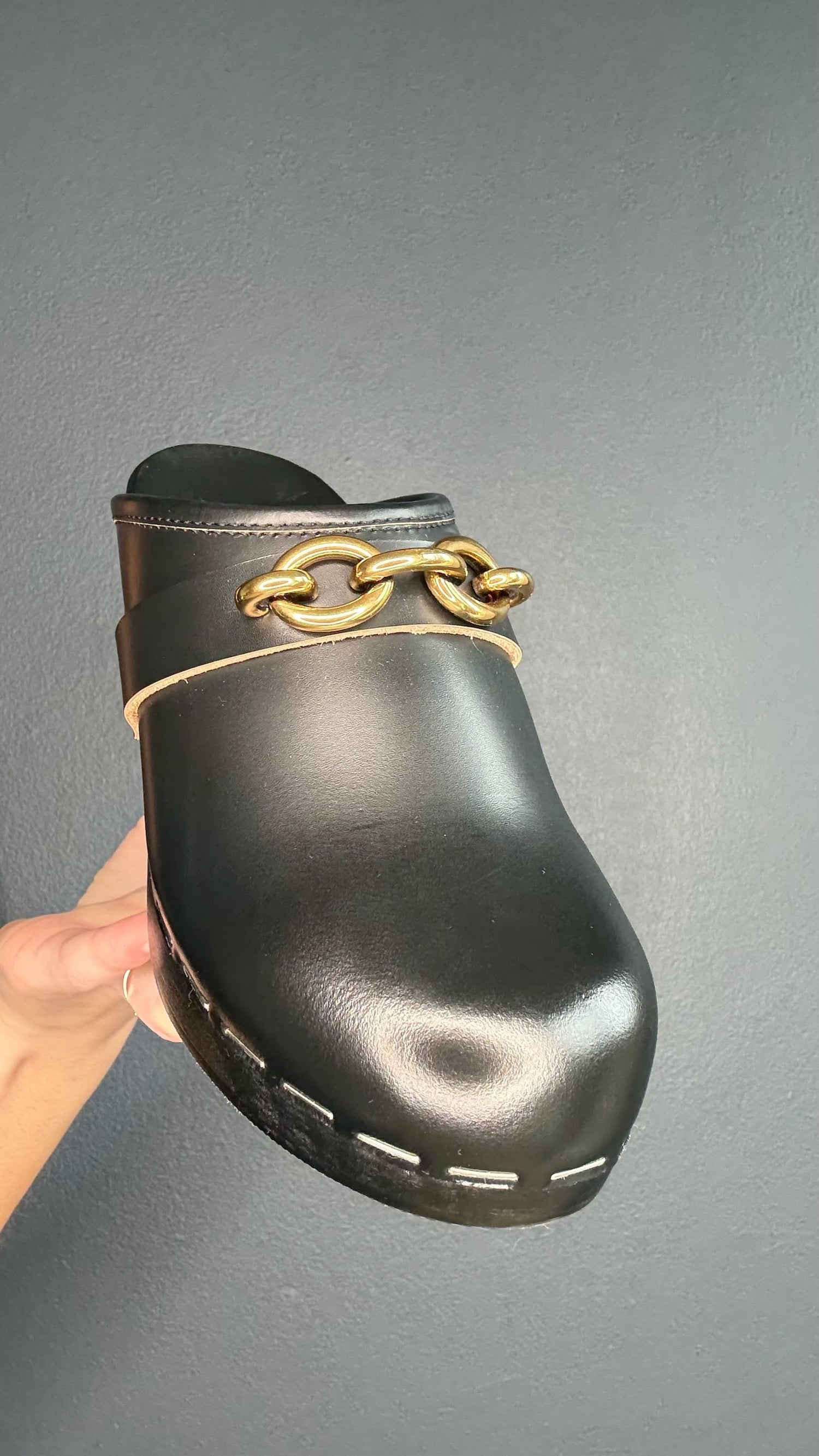 Saint Laurent black leather clogs with gold hardware. Designer size 37.5