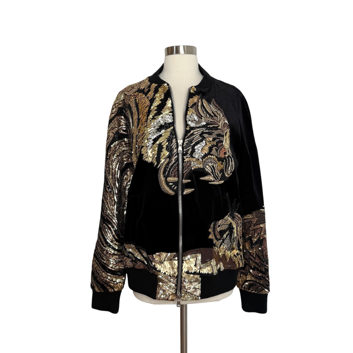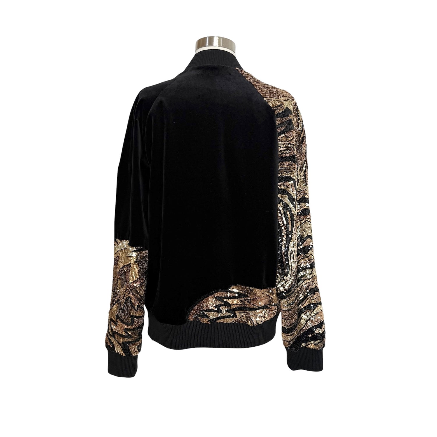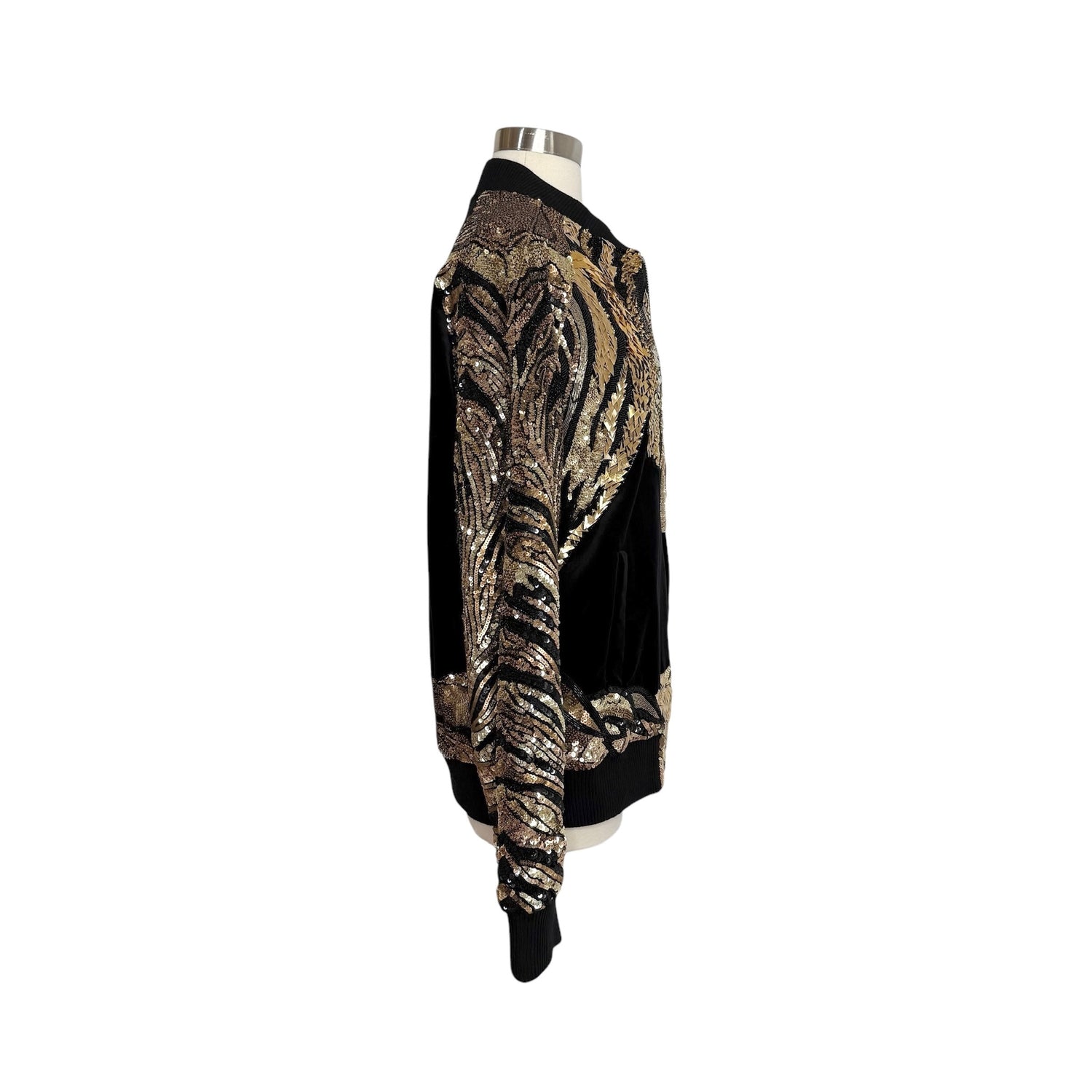 Balmain black velvet bomber jacket with gold sequins and embellishments. Unisex. Pockets. Zipper closure at front. Designer size 50.