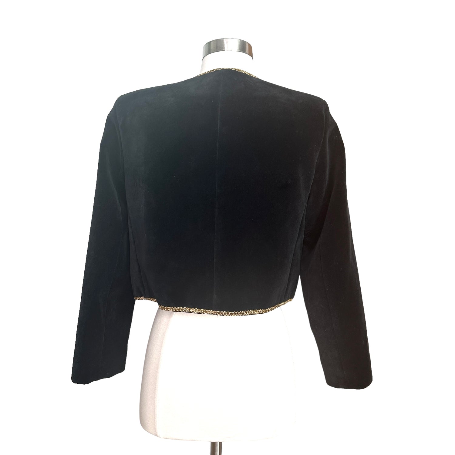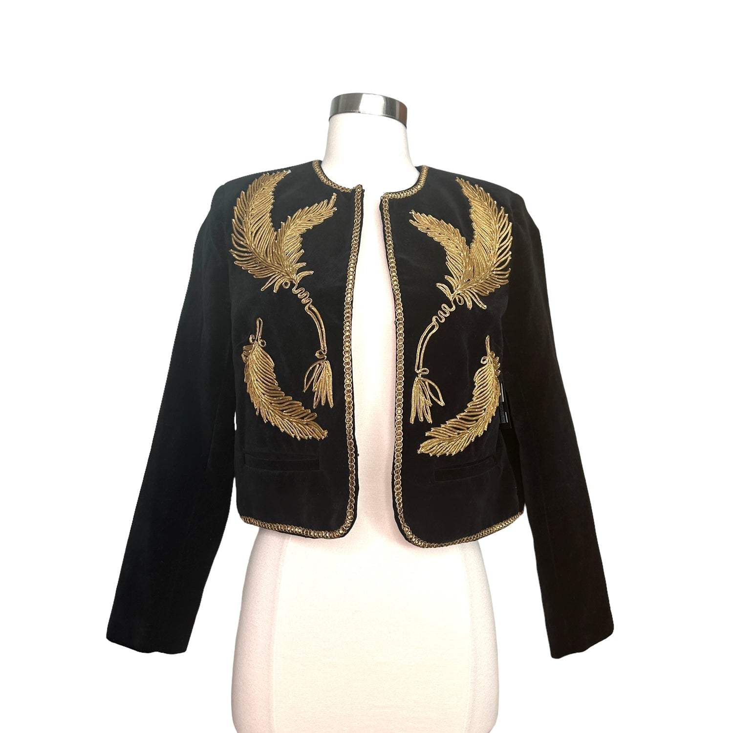 Nili Lotan evening jacket. Black with gold embroidery in a military jacket style. No collar. Slit pockets. Hooks closure at front. Designer size 6.