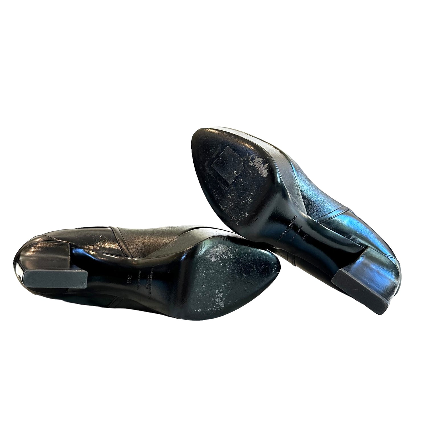 Saint Laurent black leather heeled boots. Buckle strap at side. Round pointed toe. Architectural heels. Platform for support and iconic style! Designer size 36.