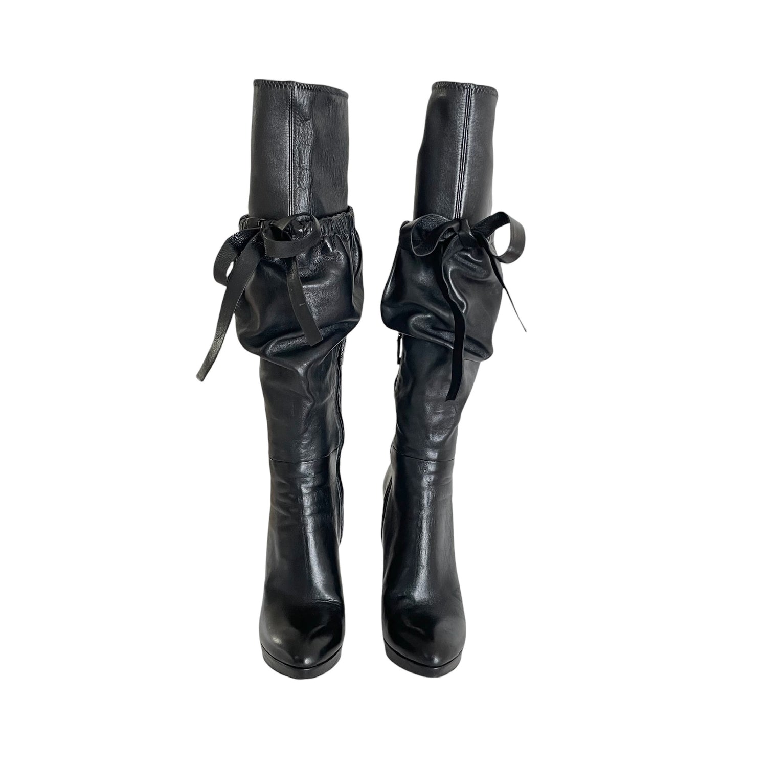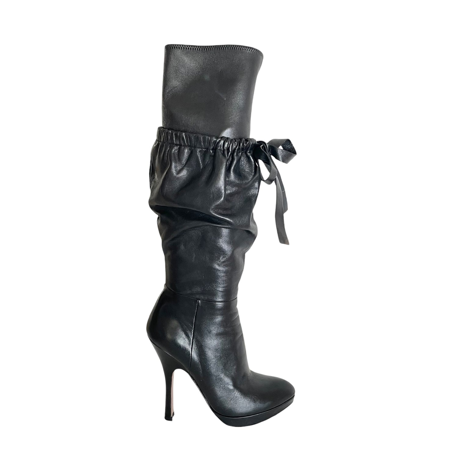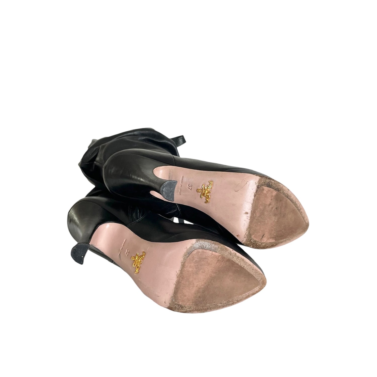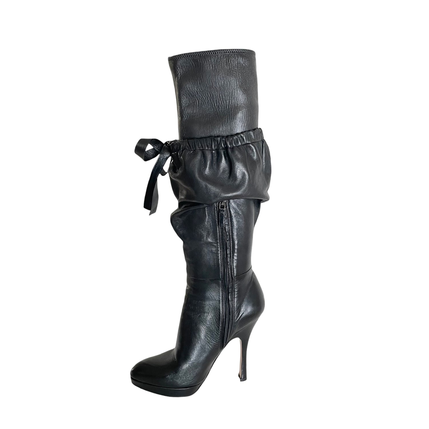 Prada black tall boots. Black leather. Slip on shoes with zipper at interior. Heels. Designer size 37.