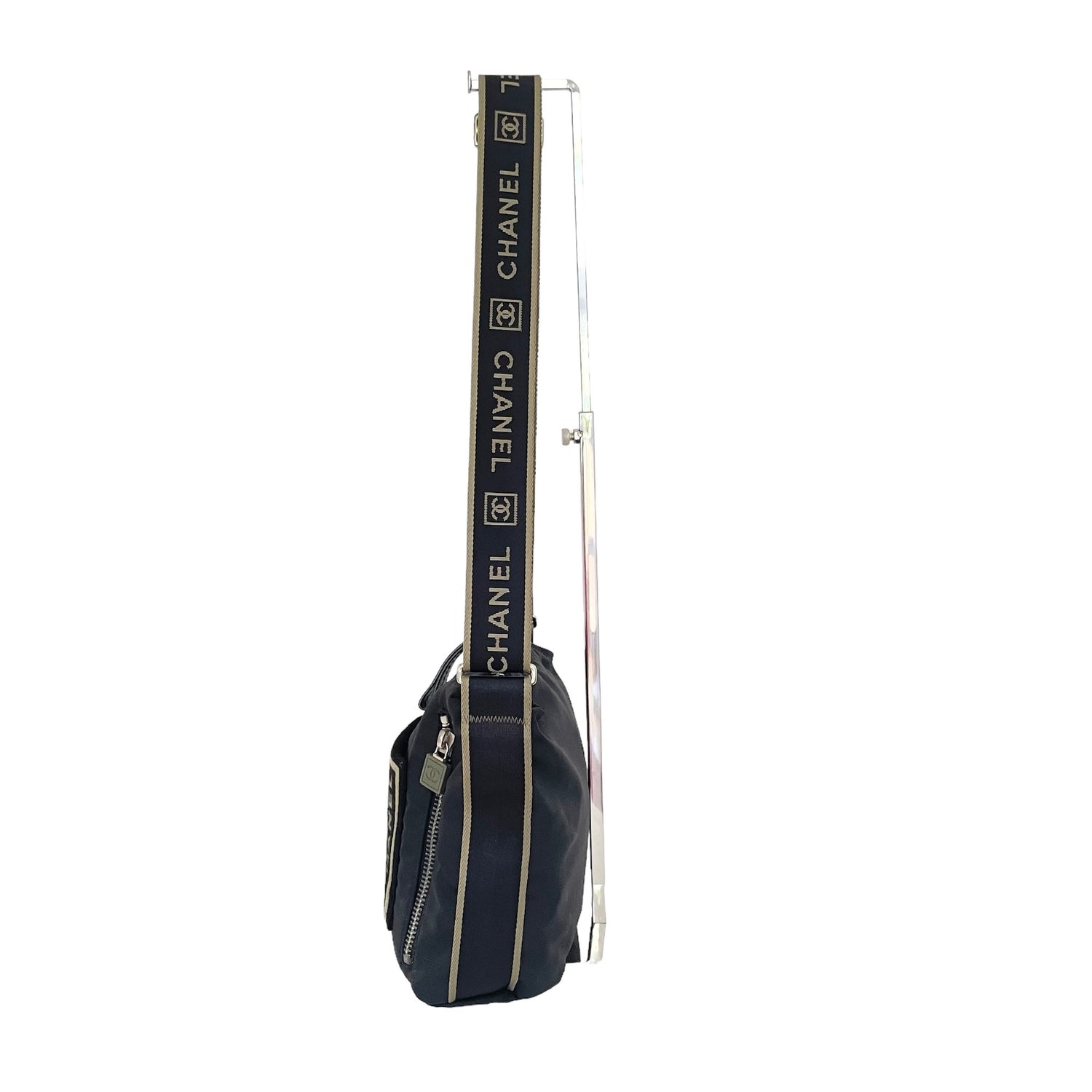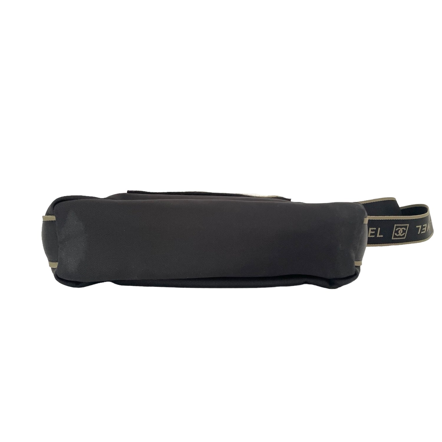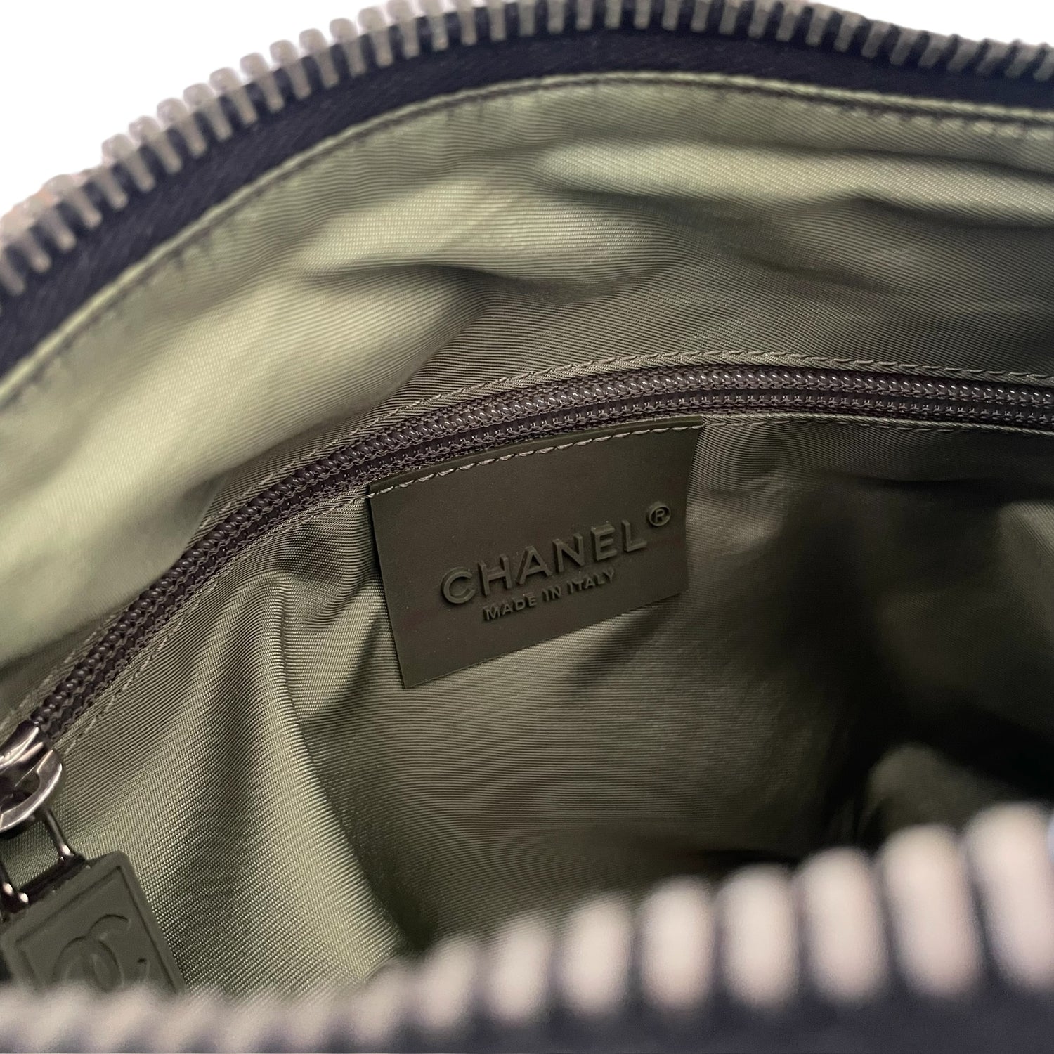 Chanel black and kaki nylon bag. 2006 collection by Karl Lagerfeld. CC Identification logo patch at front. Chanel logo throughout strap. Multiple zipper pockets.
