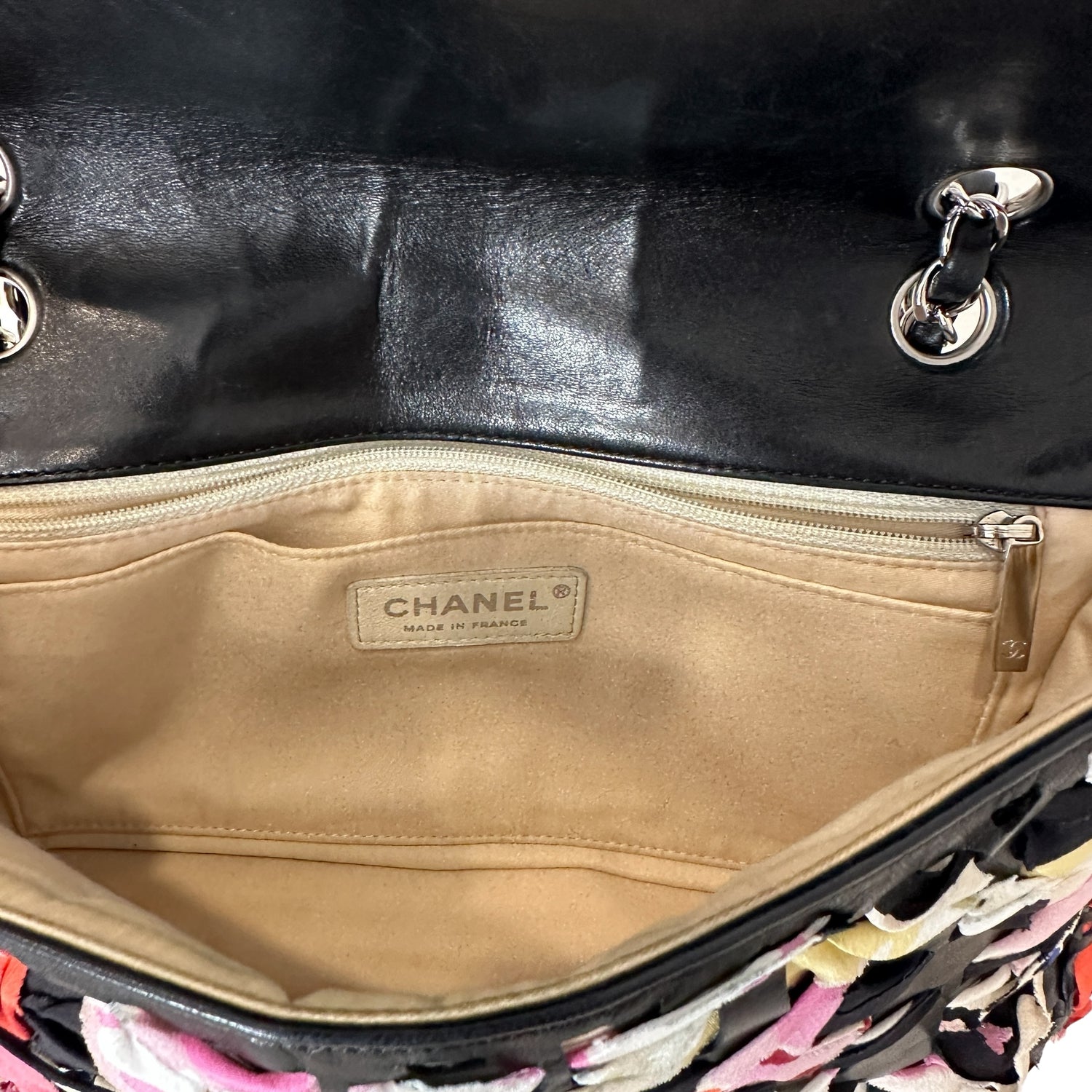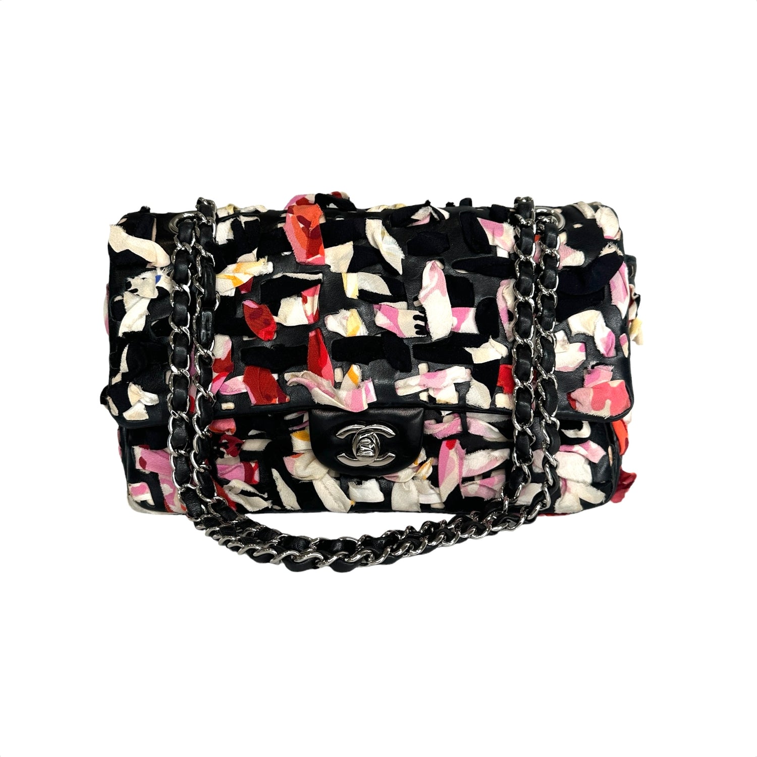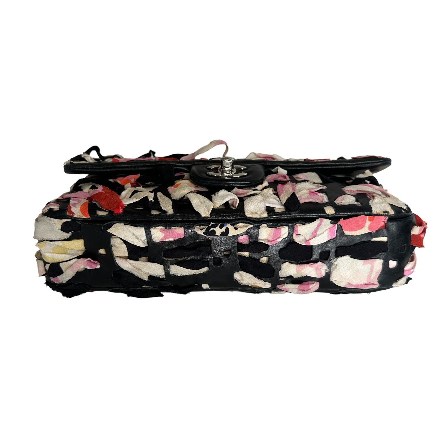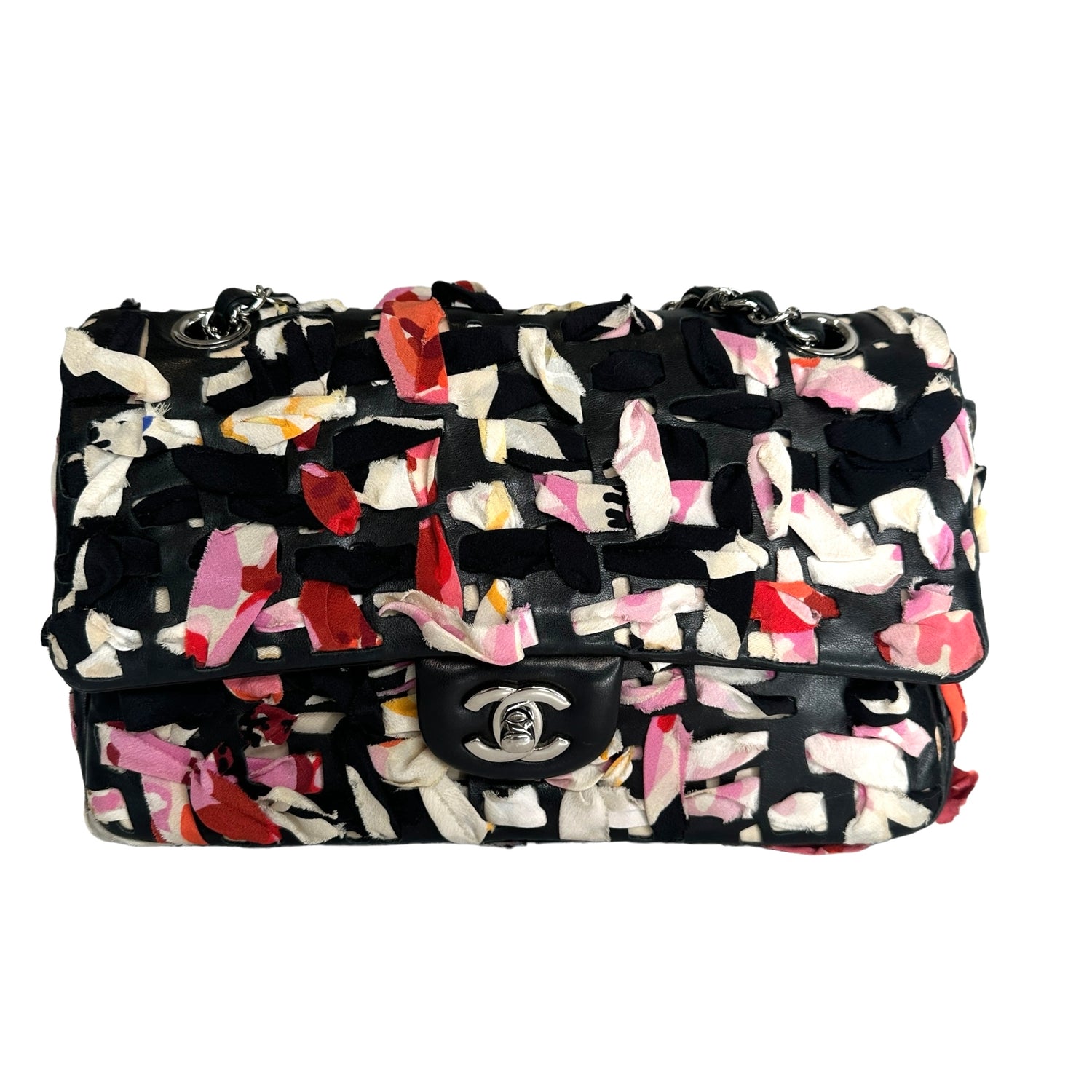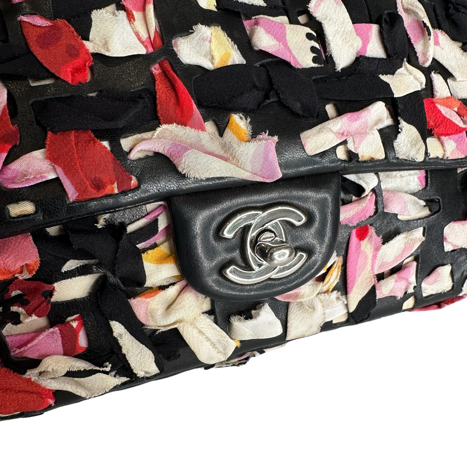 Chanel black lambskin single flap. 2011 collection by Karl Lagerfeld. Scarf weaving through black lambskin leather. Silver-tone CC turn-lock and chain hardware. Beige satin interior. One zipper interior pocket. One slit pocket.