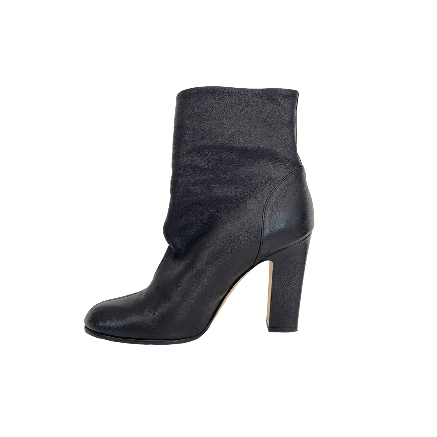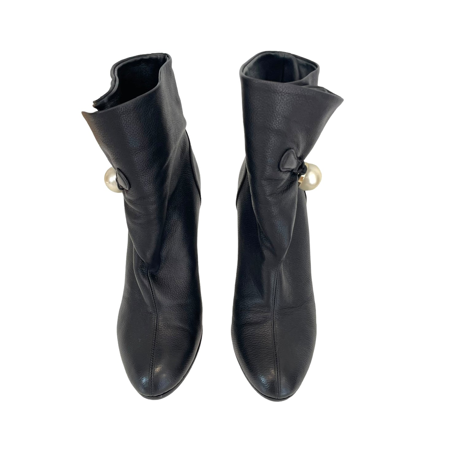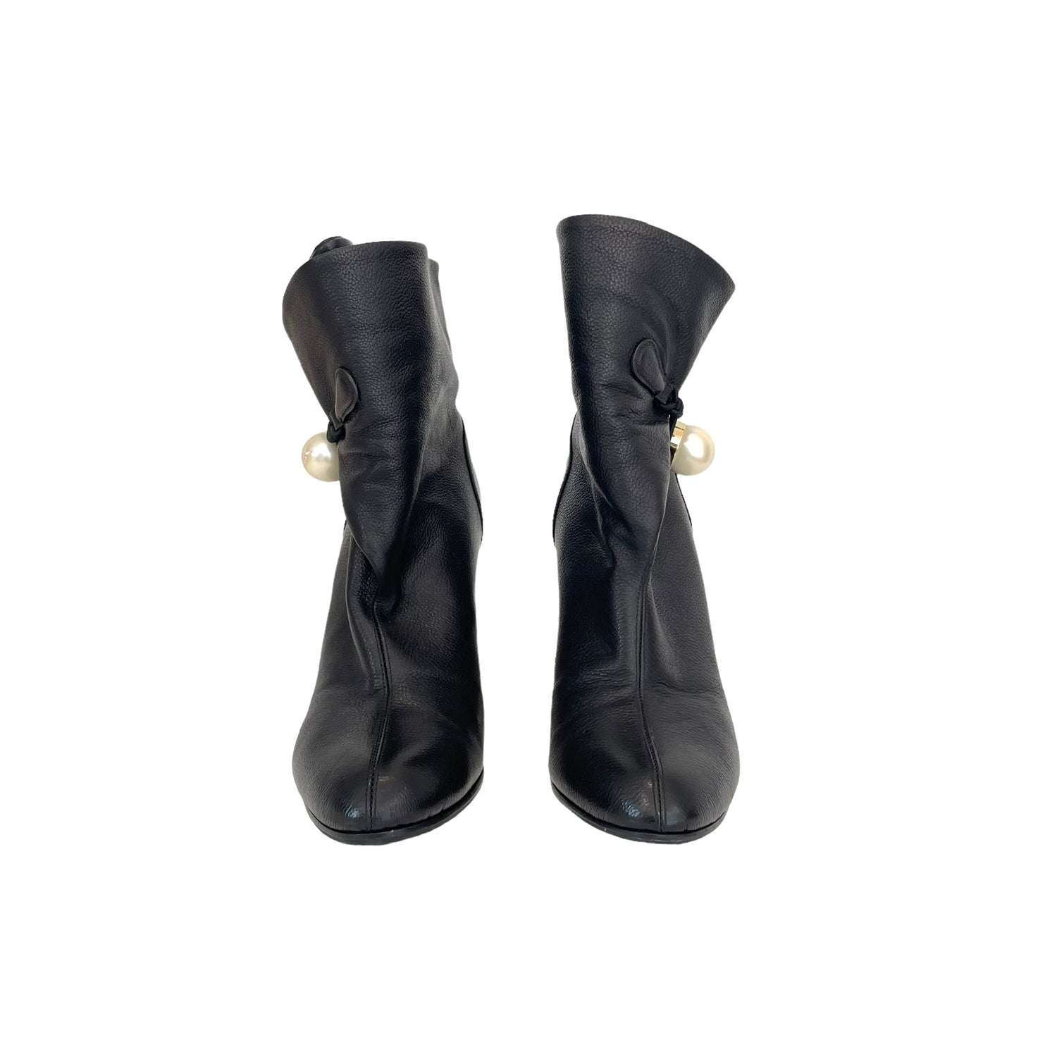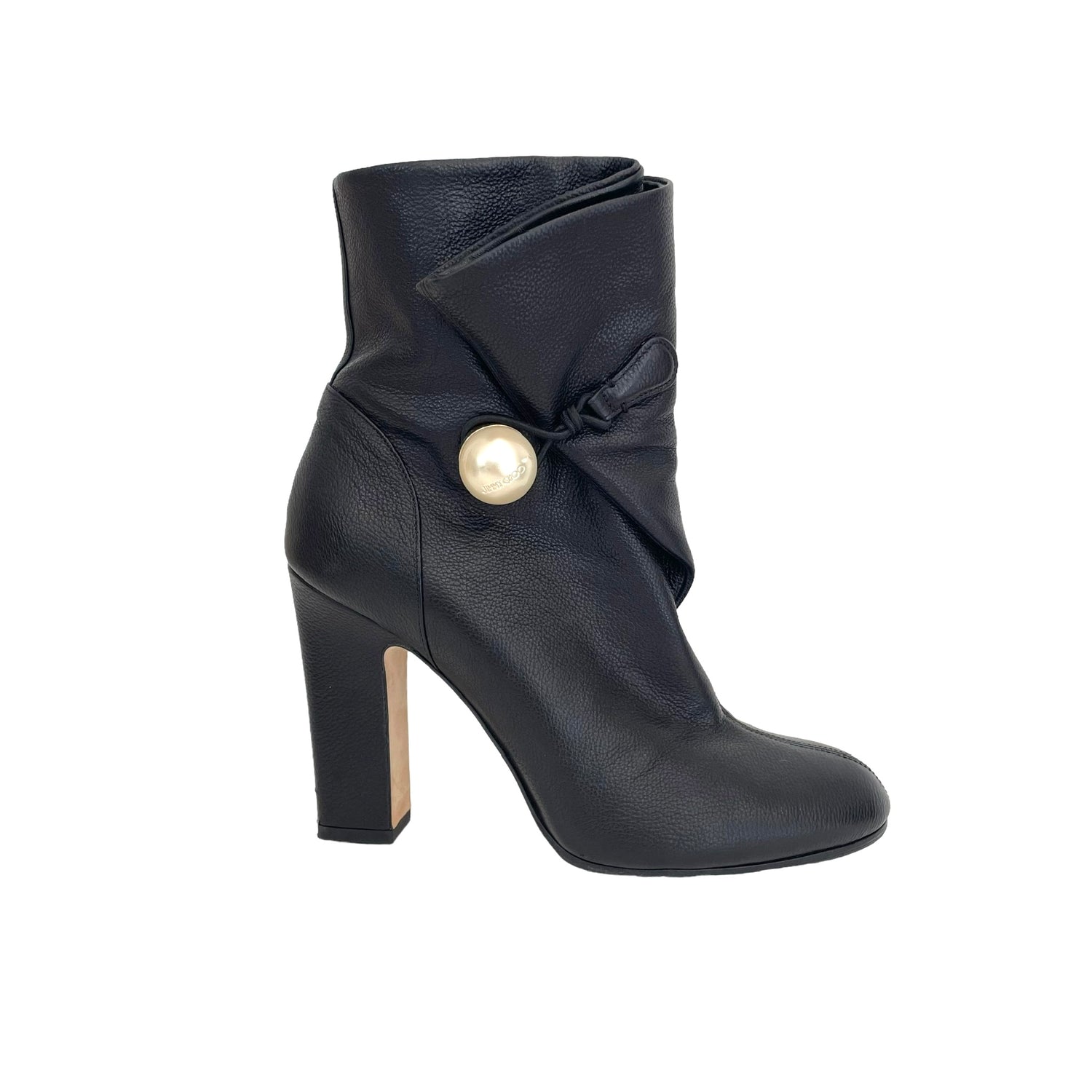 Jimmy Choo black heeled boots. Faux-pearl accent at side. Round toe. Designer size 37.5.