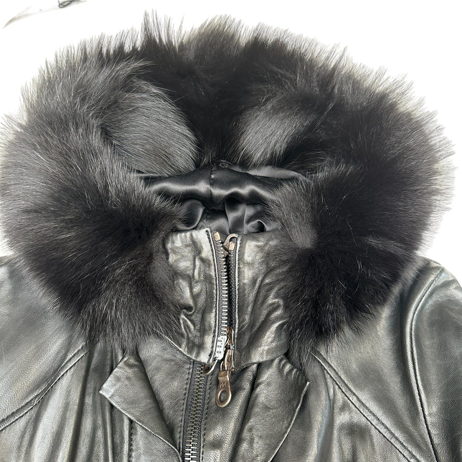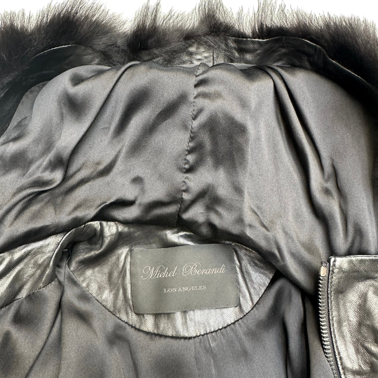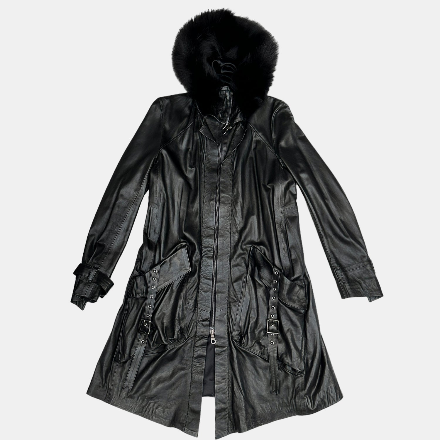 Michel Berandi black leather coat with fur hoodie. Extra large pockets with silver-tone detail belts. Zipper closure at front. This is one rock and roll piece. The leather is a very soft and buttery lambskin. Such a statement and forever piece! Designer size Small.