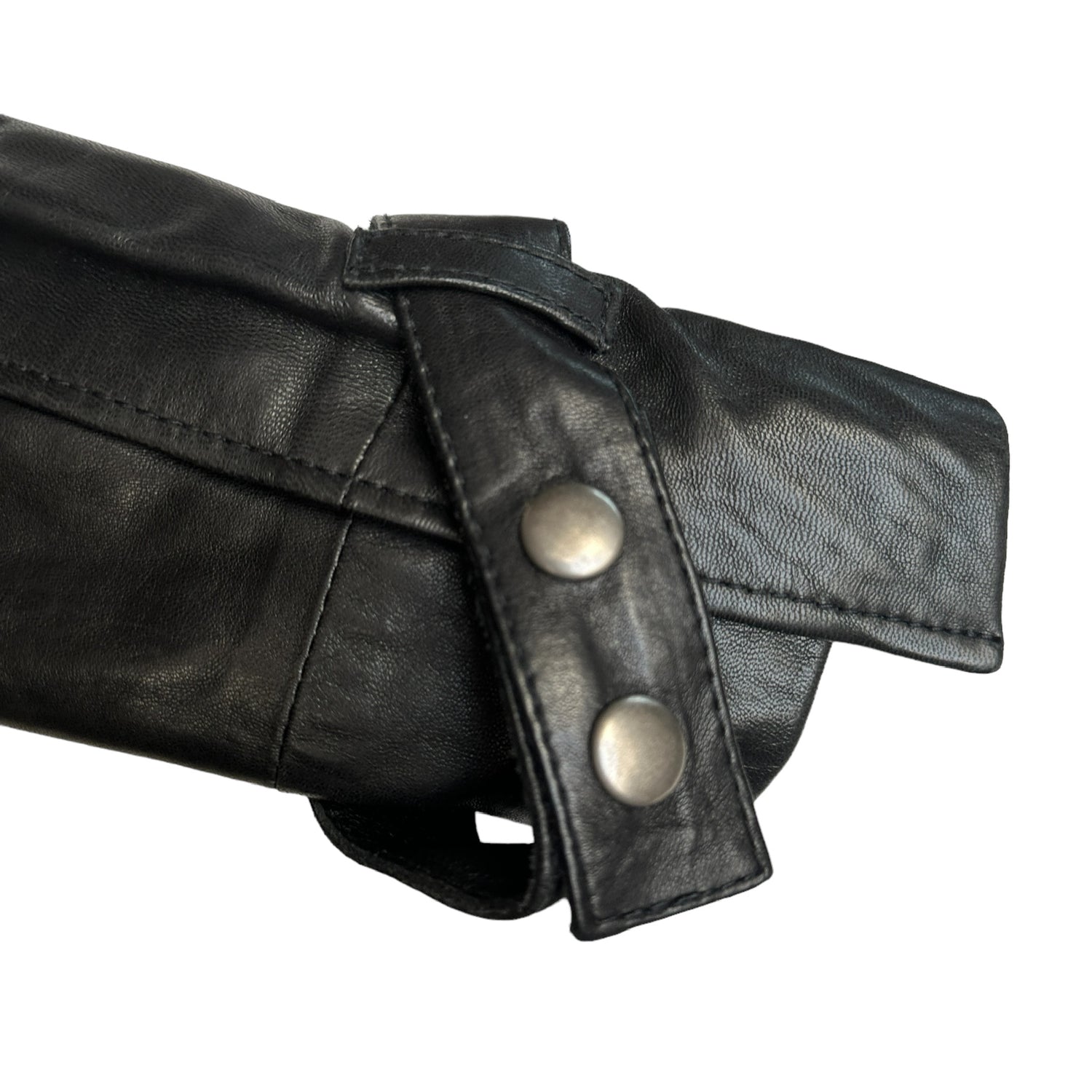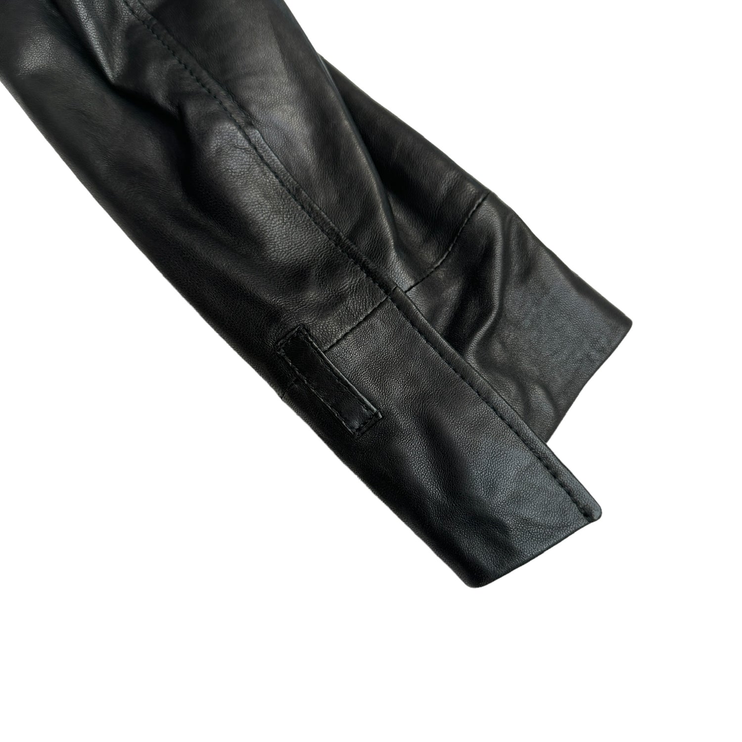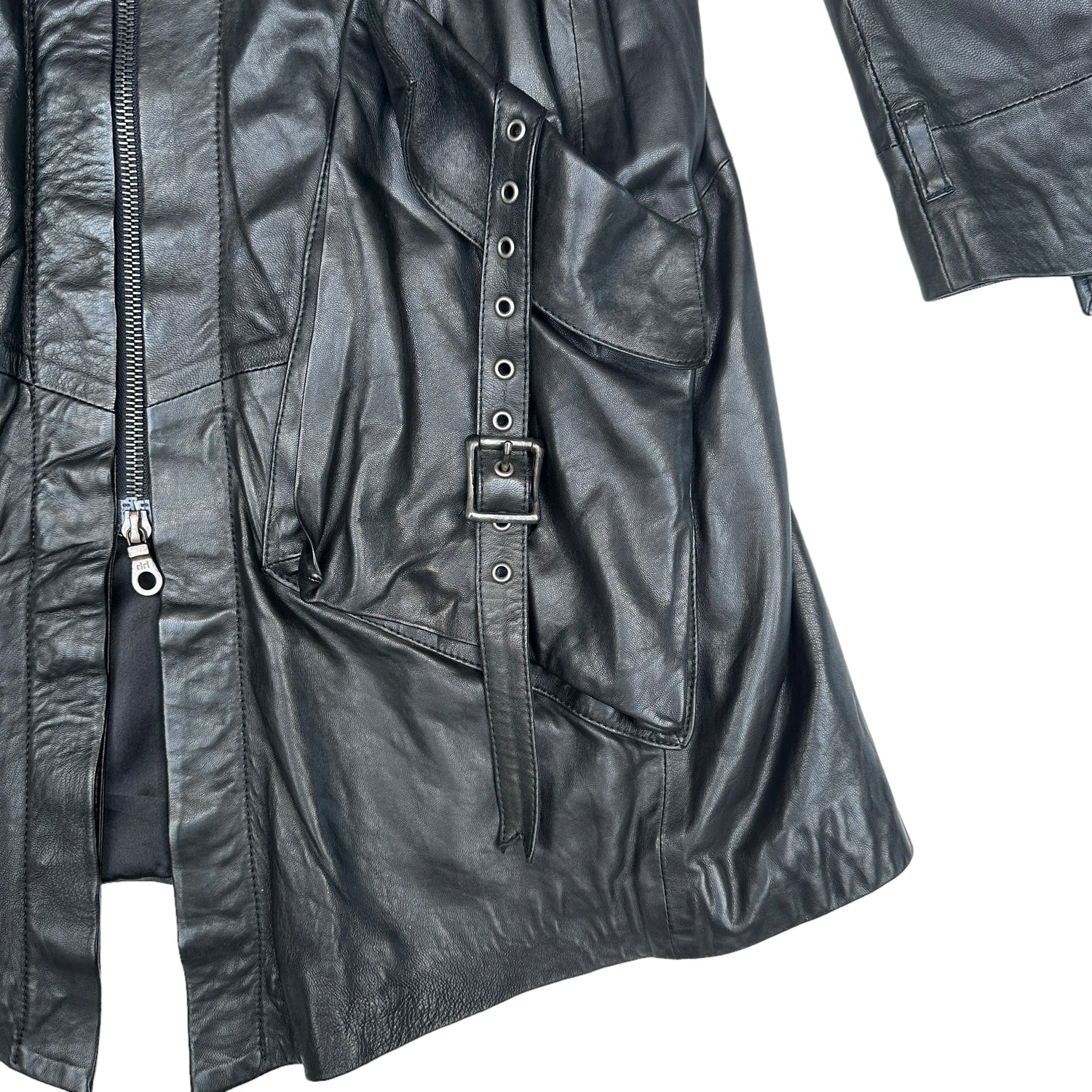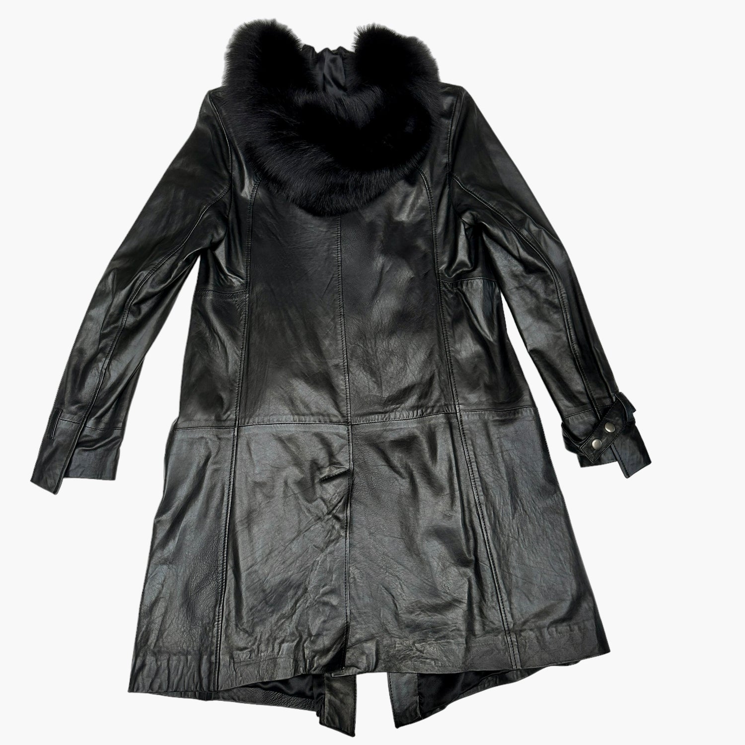 Michel Berandi black leather coat with fur hoodie. Extra large pockets with silver-tone detail belts. Zipper closure at front. This is one rock and roll piece. The leather is a very soft and buttery lambskin. Such a statement and forever piece! Designer size Small.