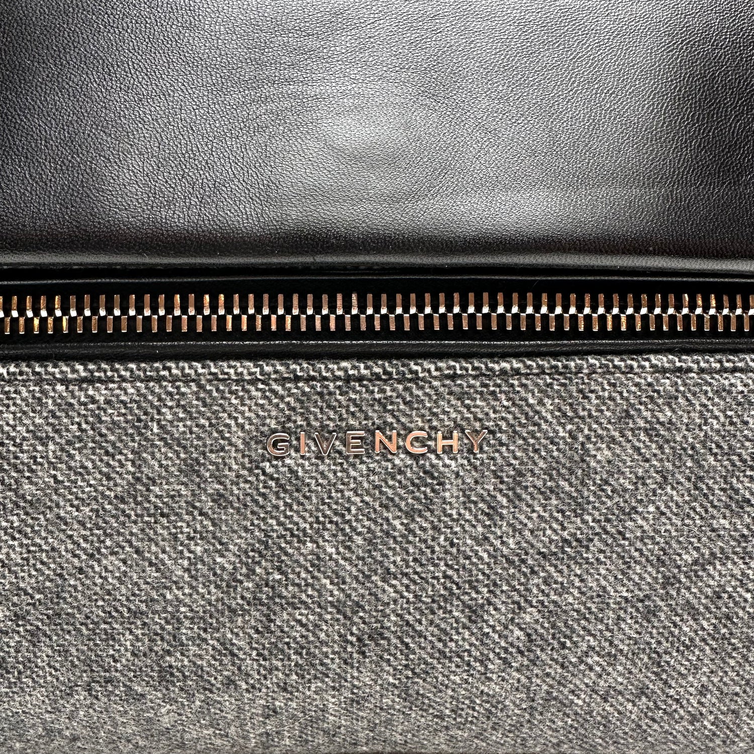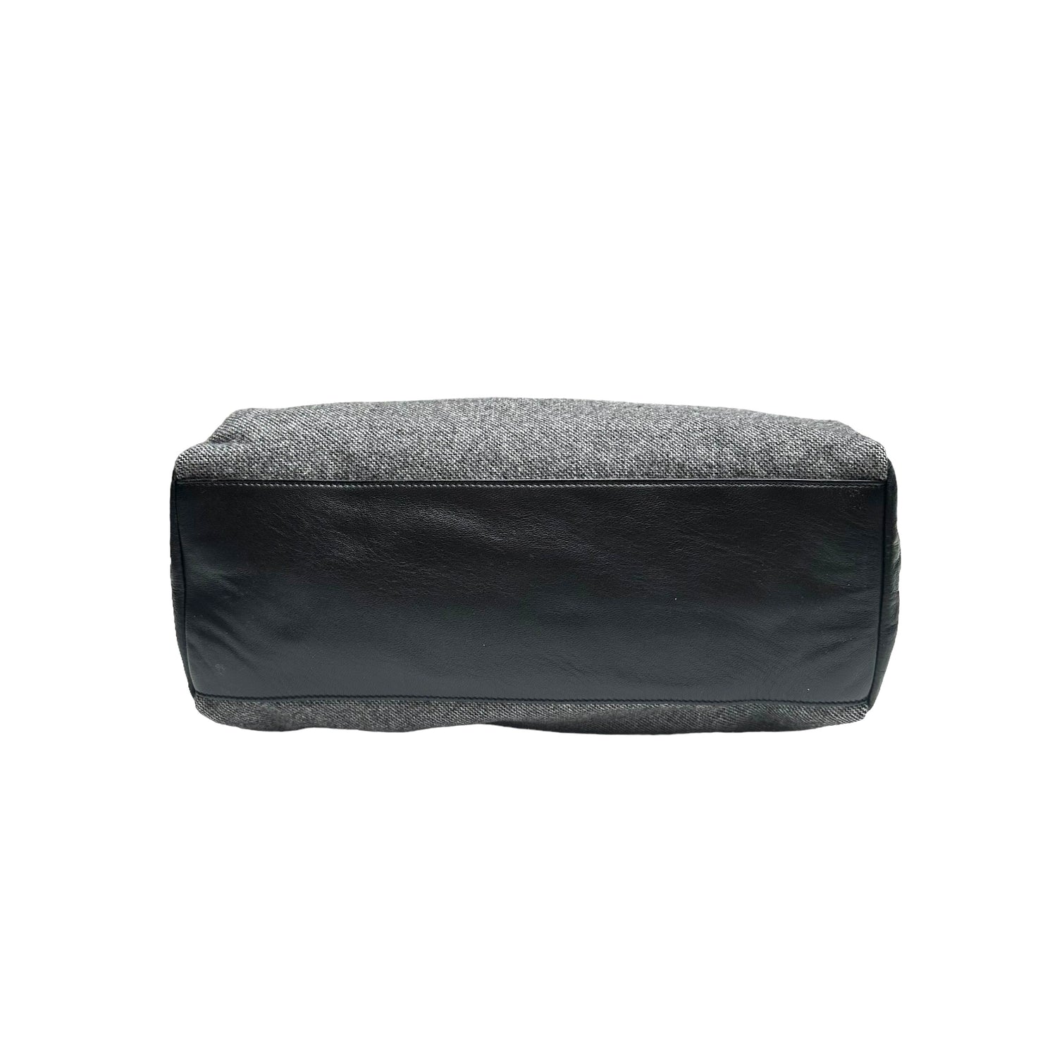 Givenchy large black leather and grey fabric bag. Zipper closure at top. One shoulder handle and one adjustable and removable leather strap. Silver-tone hardware. Perfect bag for work or travelling.