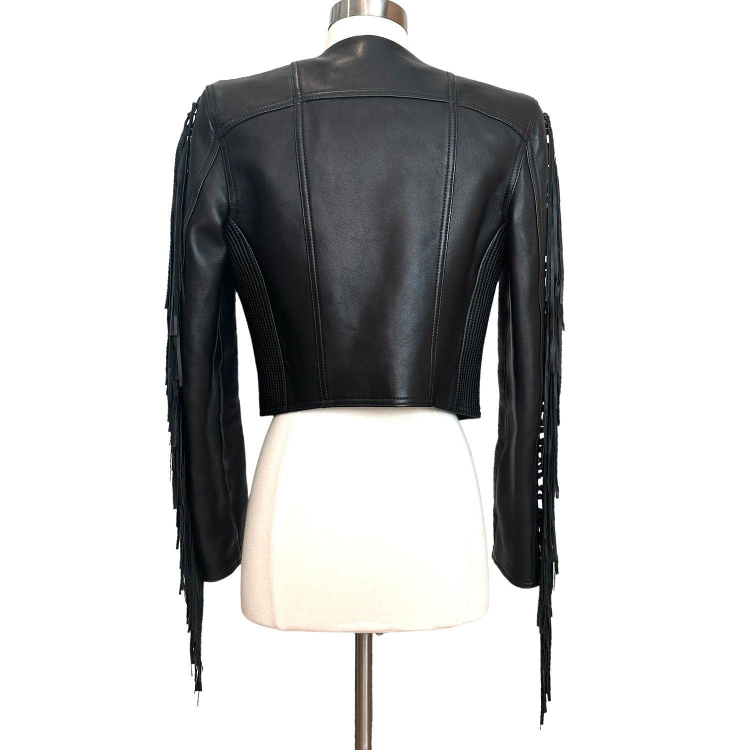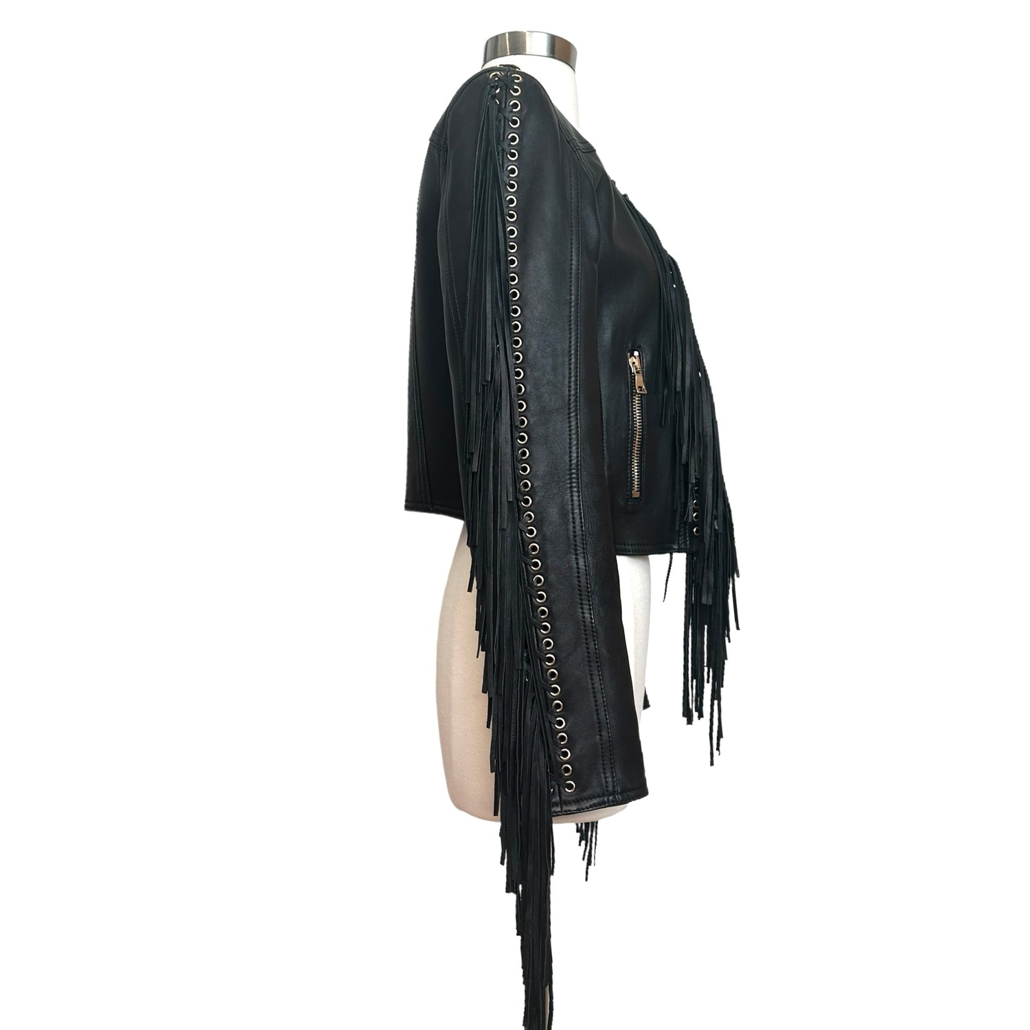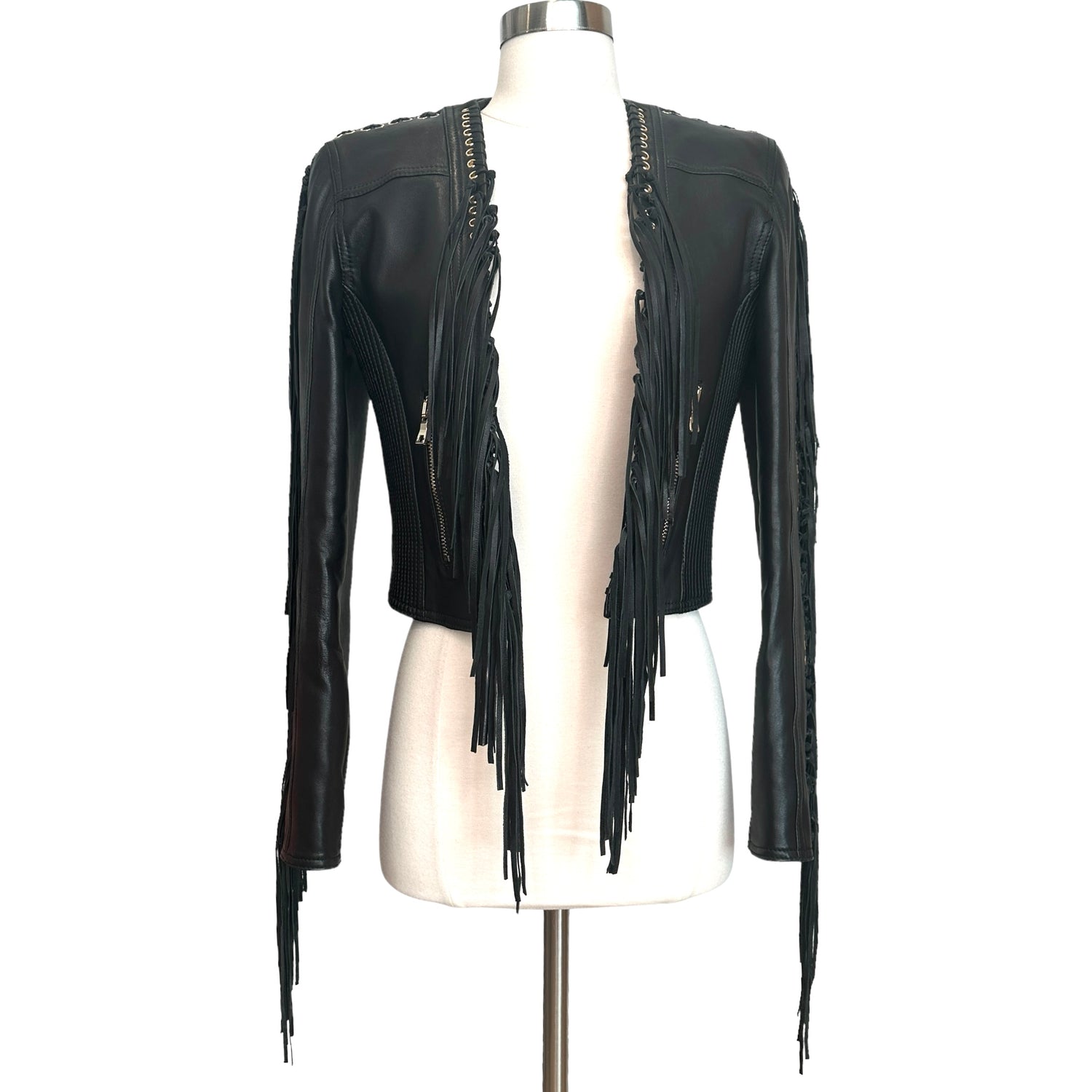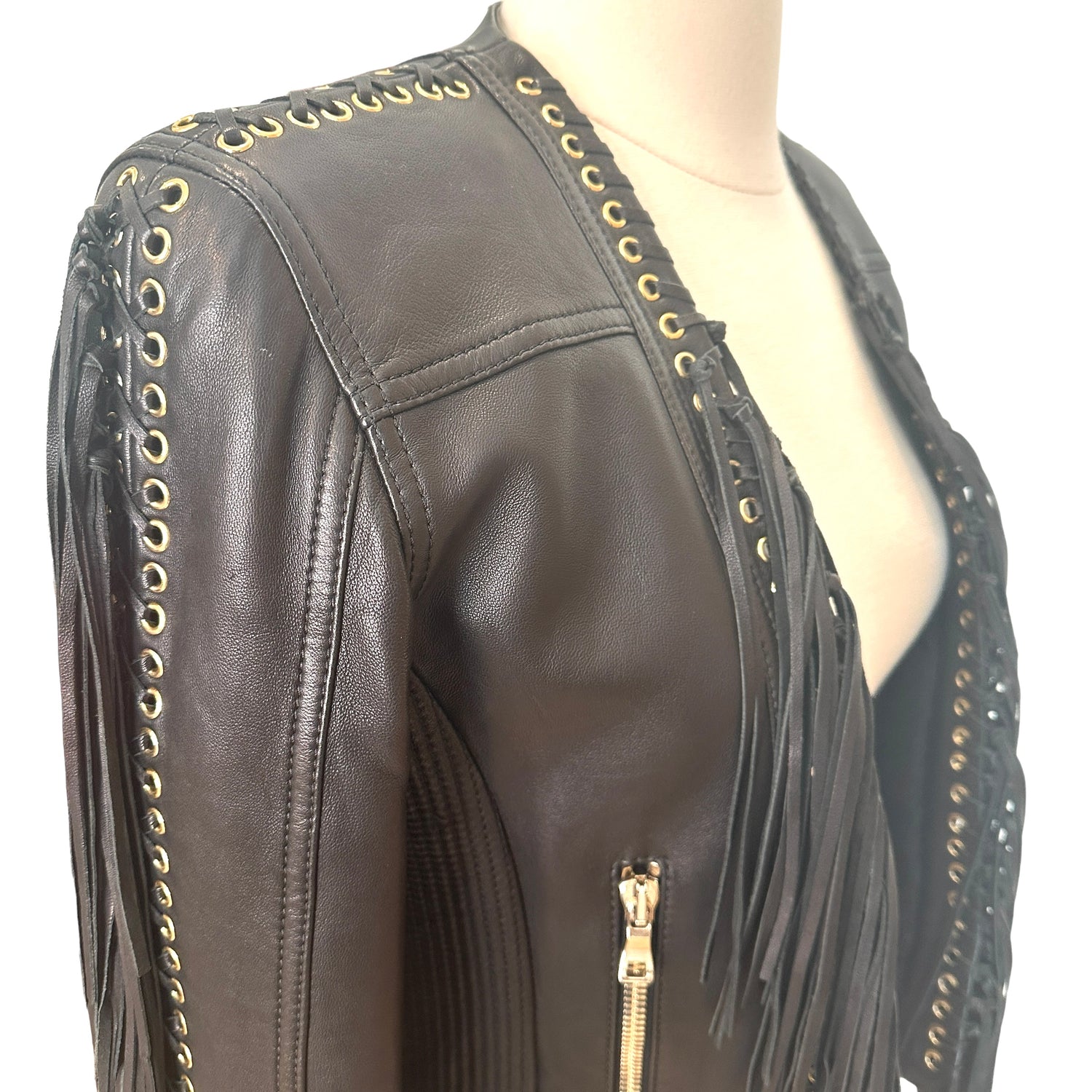 Balmain leather. Fringe details at opening and sleeves. Open front. Gold-tone eyelets and zipper pockets. Buttery soft leather. Designer size 38