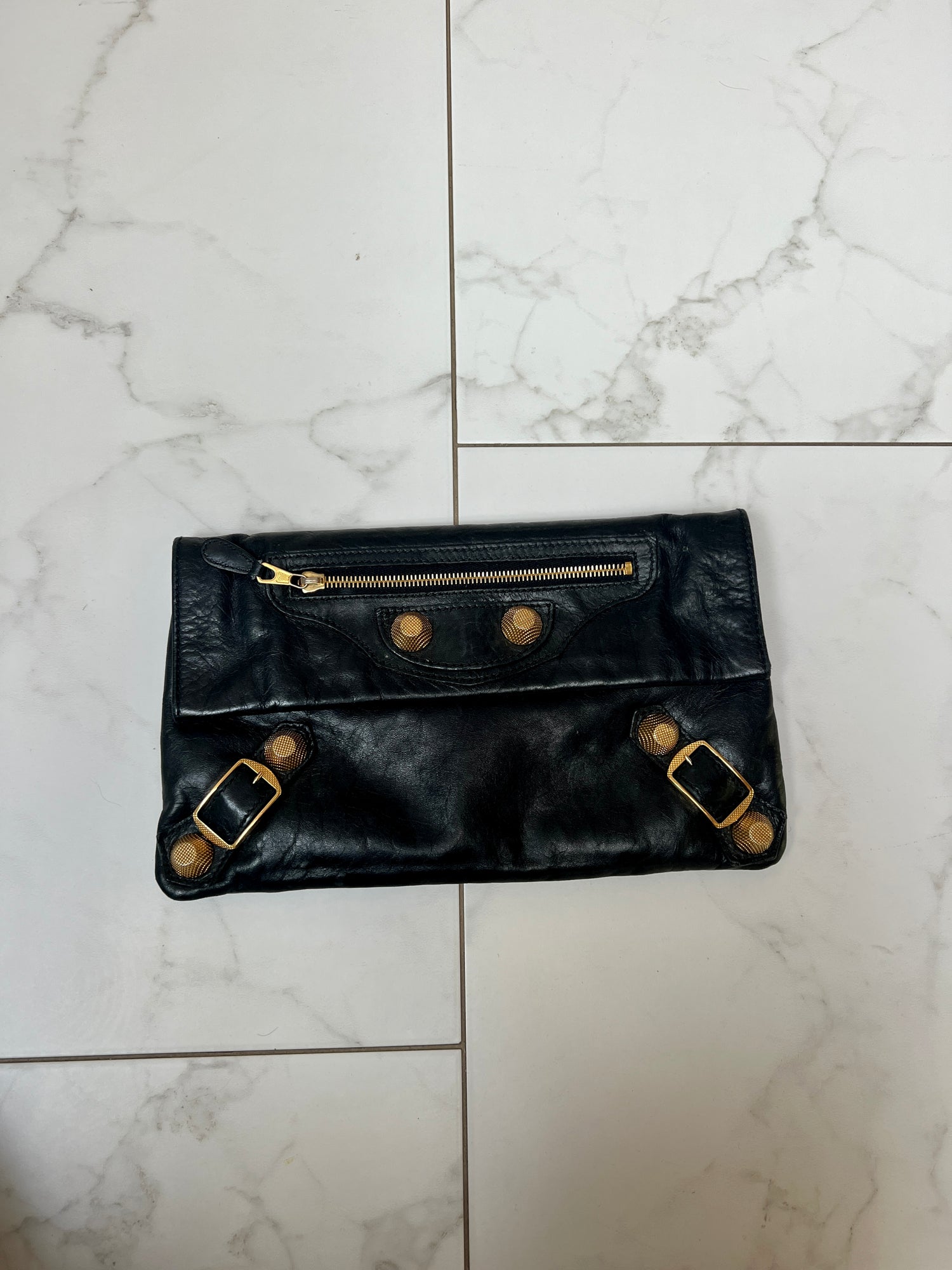 Beautiful Balenciaga Black Clutch from Giant City collection. Gold tone hardware. Black Leather. One zipper pocket on the exterior. Three compartments inside. Magnetic closure.
