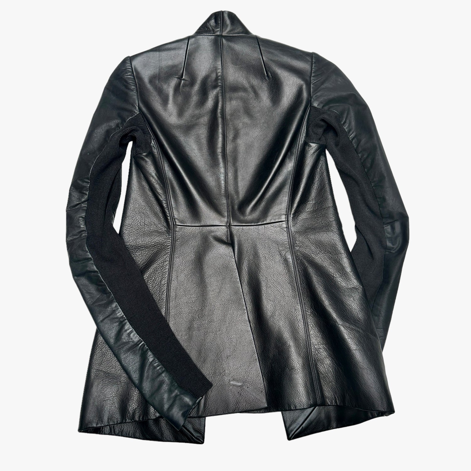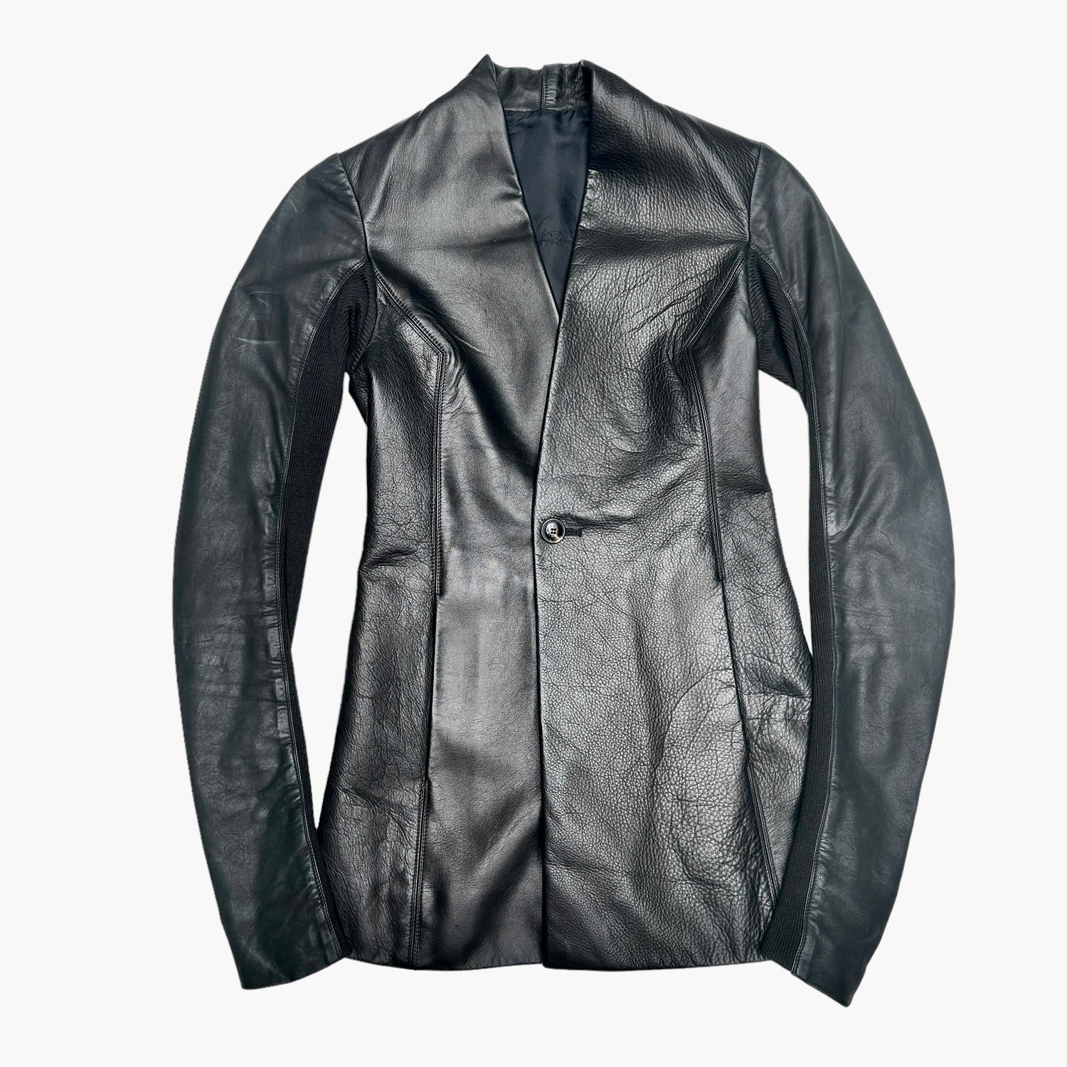 Rick Owens black leather jacket. This is a fantastic piece from the designer with rich and think lamb leather, extra long sleeves to create that iconic Rick Owens look. So good! One button closure at front. Two pockets. Designer size IT 38 / US 4.