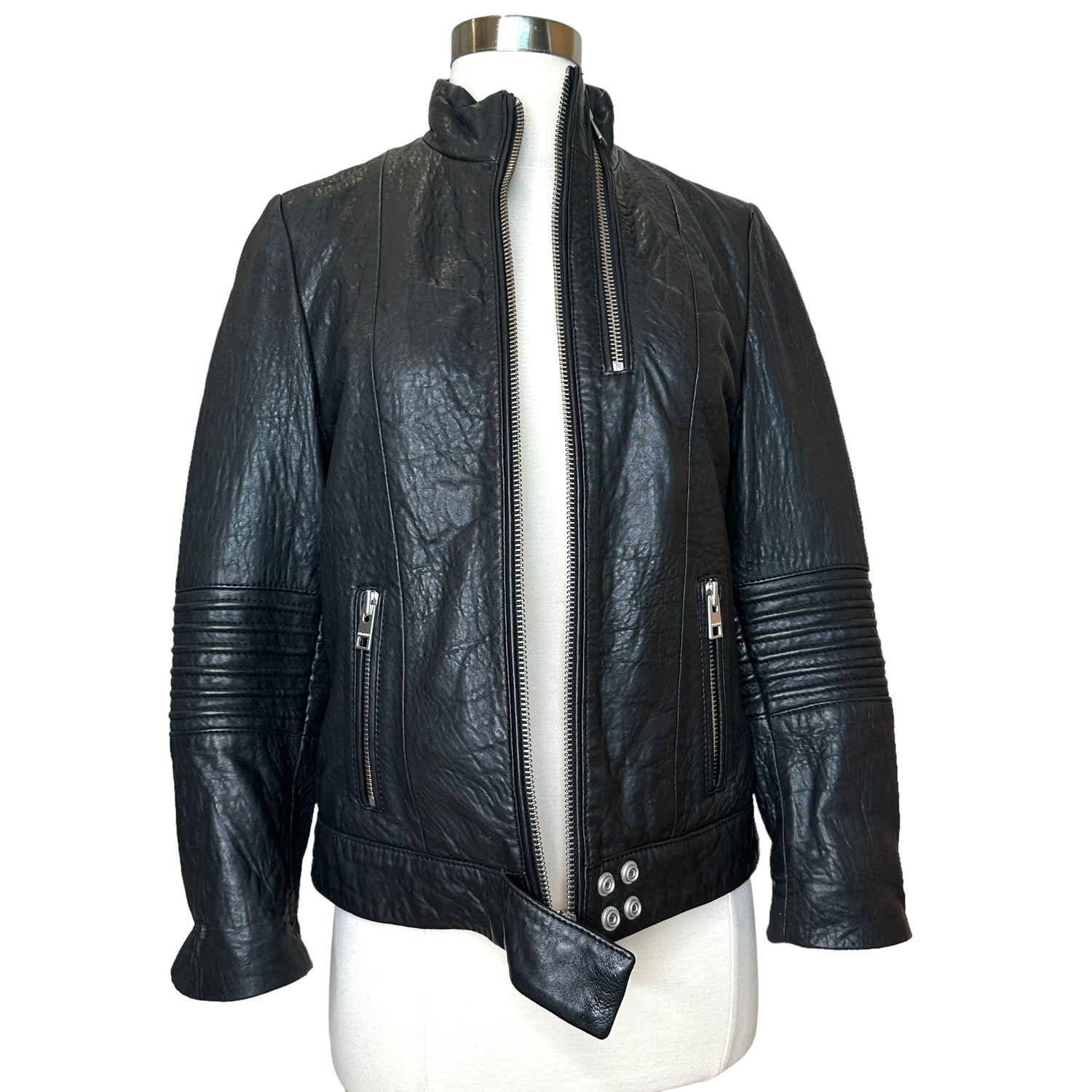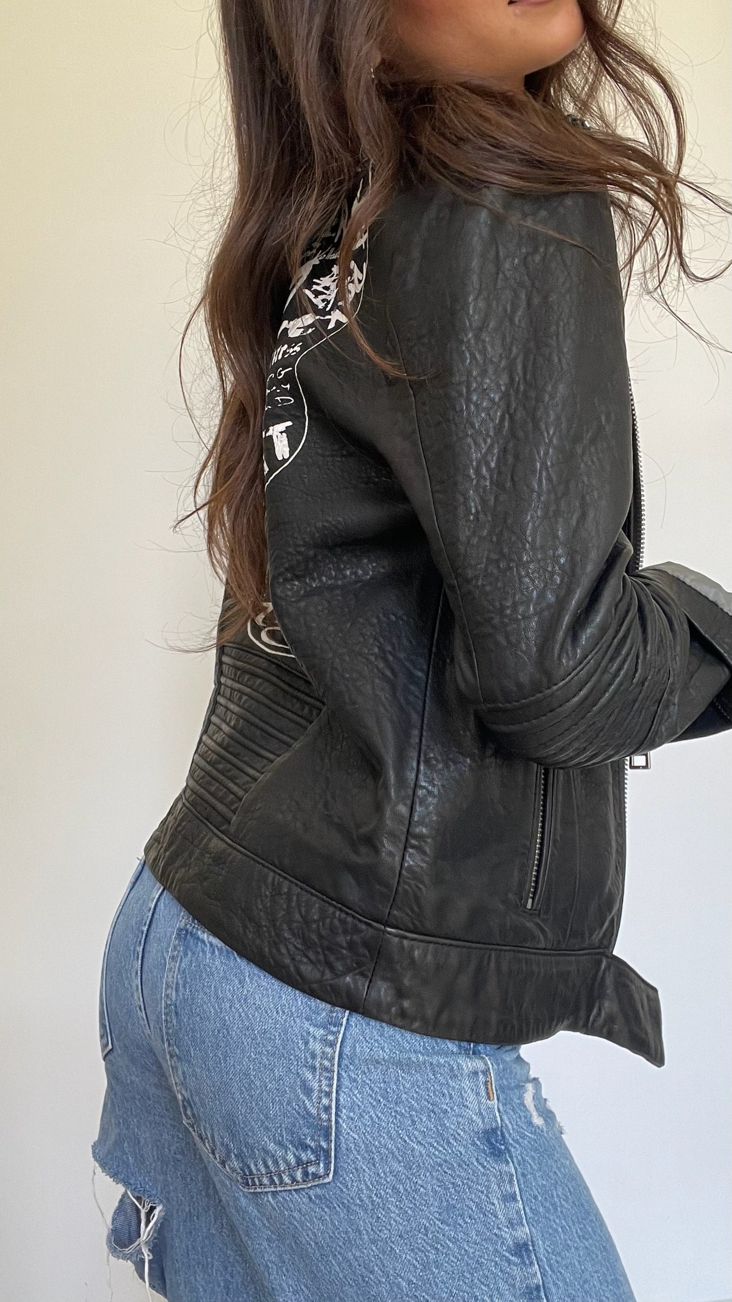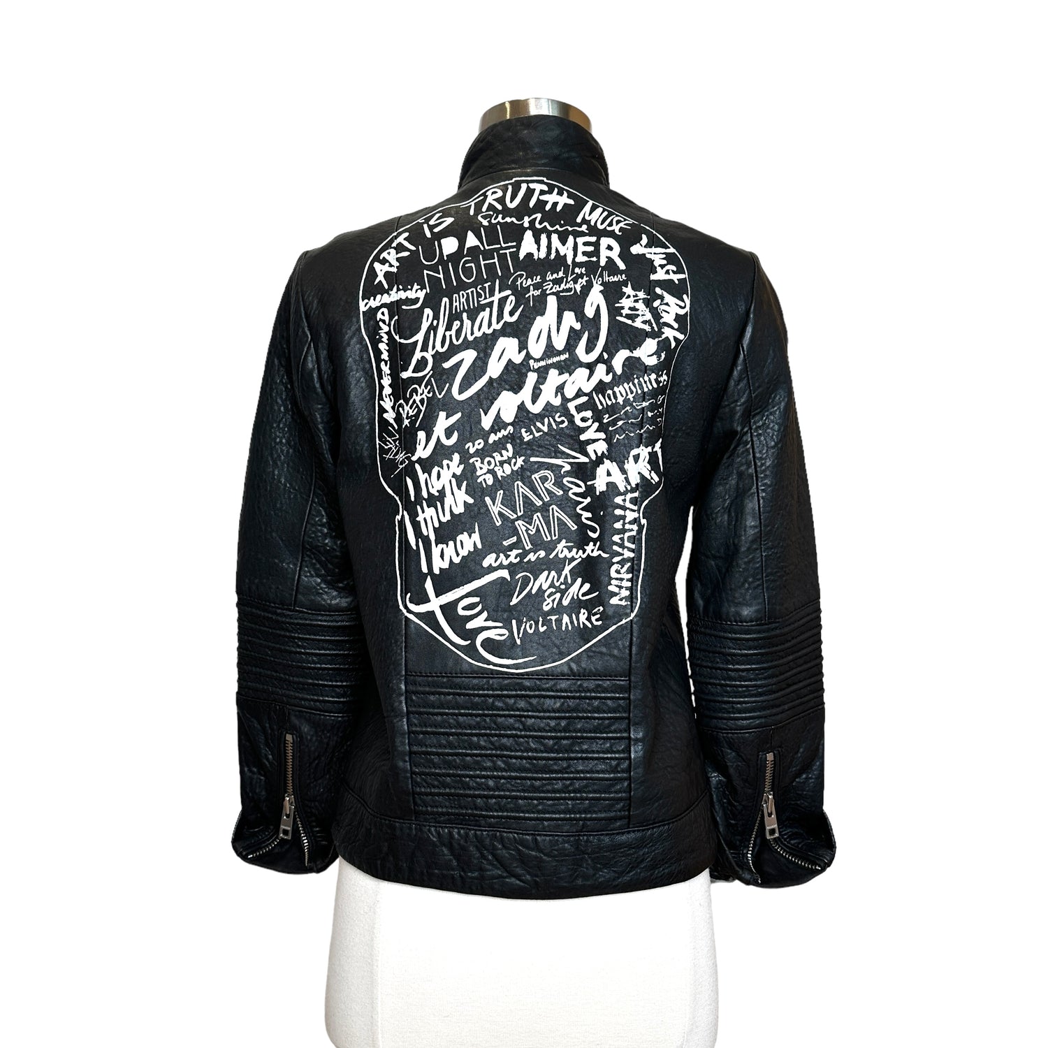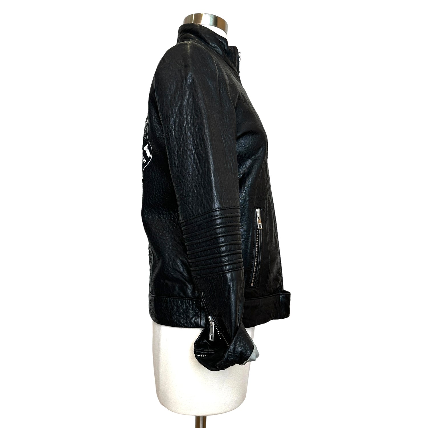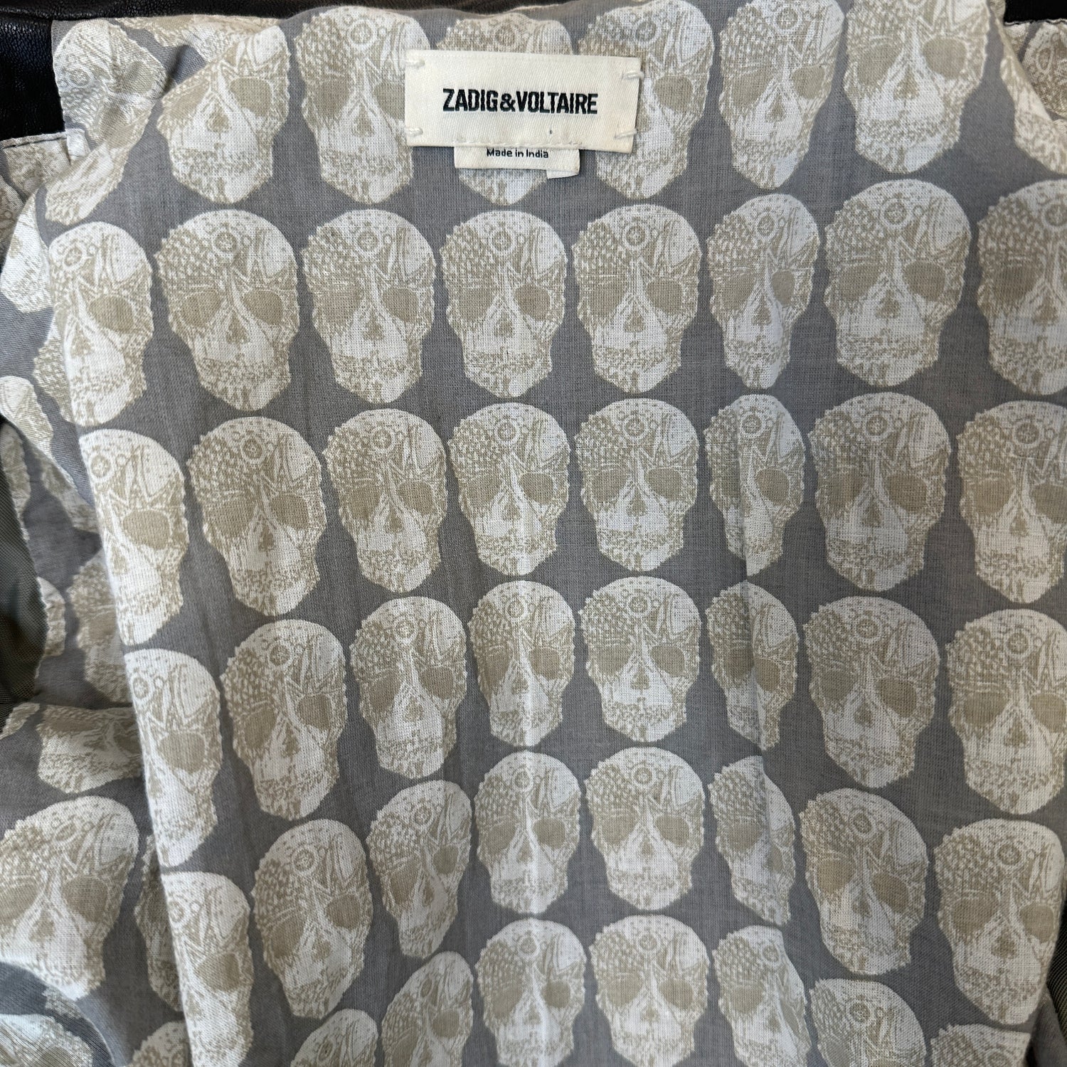 Zadig & Voltaire black leather jacket. Zipper closure at front. Two zipper pockets. One interior pocket. Beautiful printed cotton lining. Designer size small.