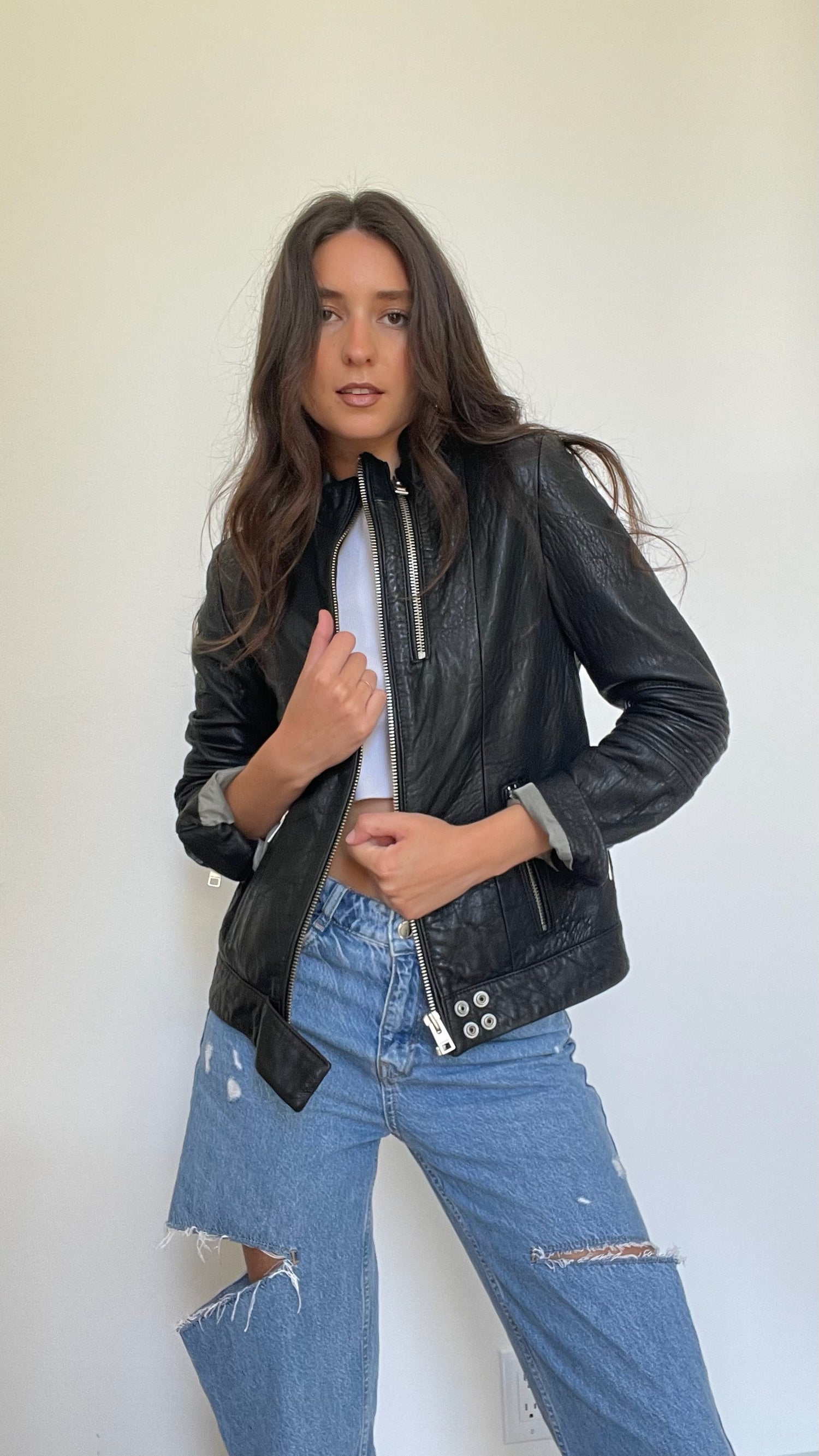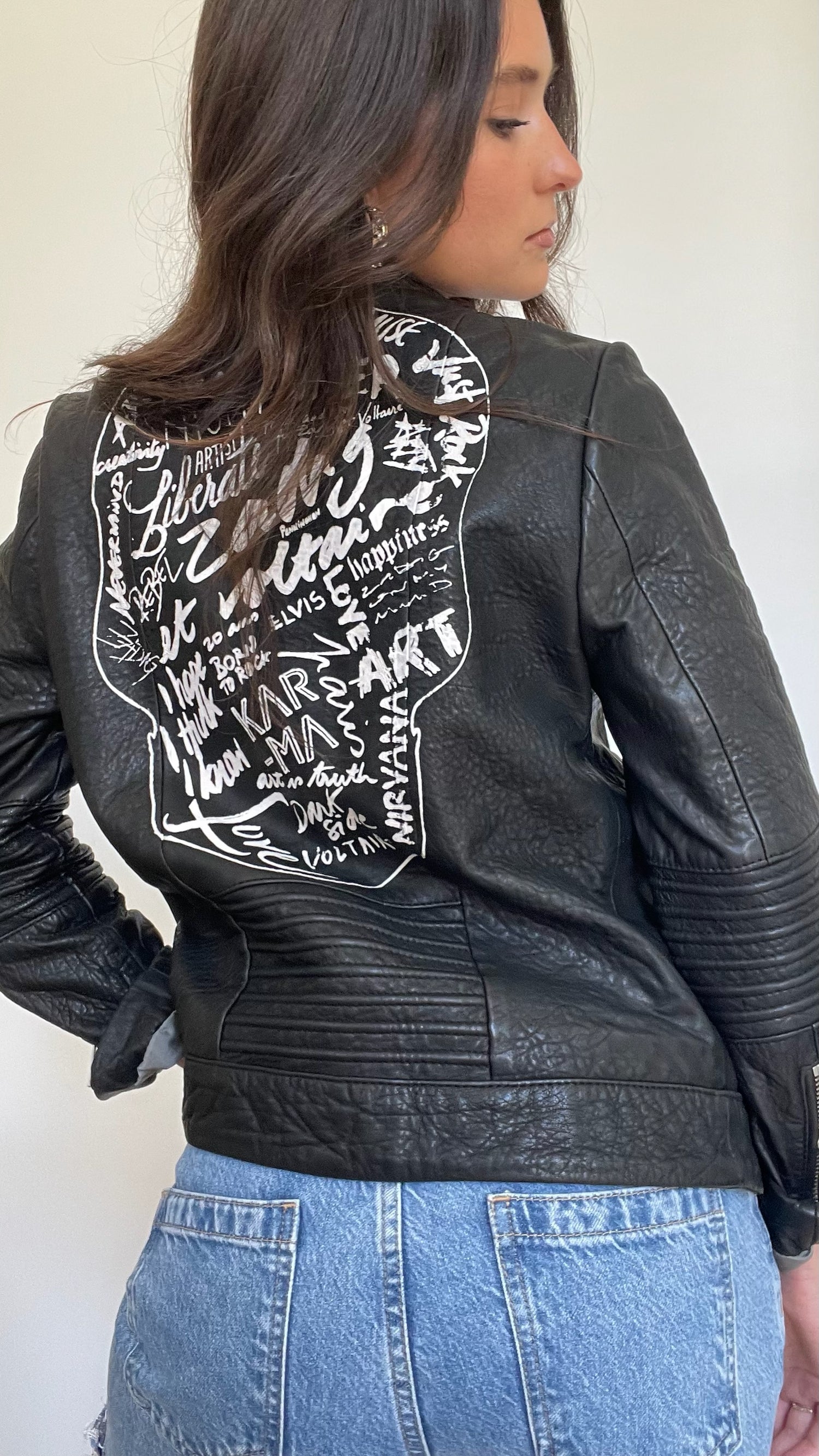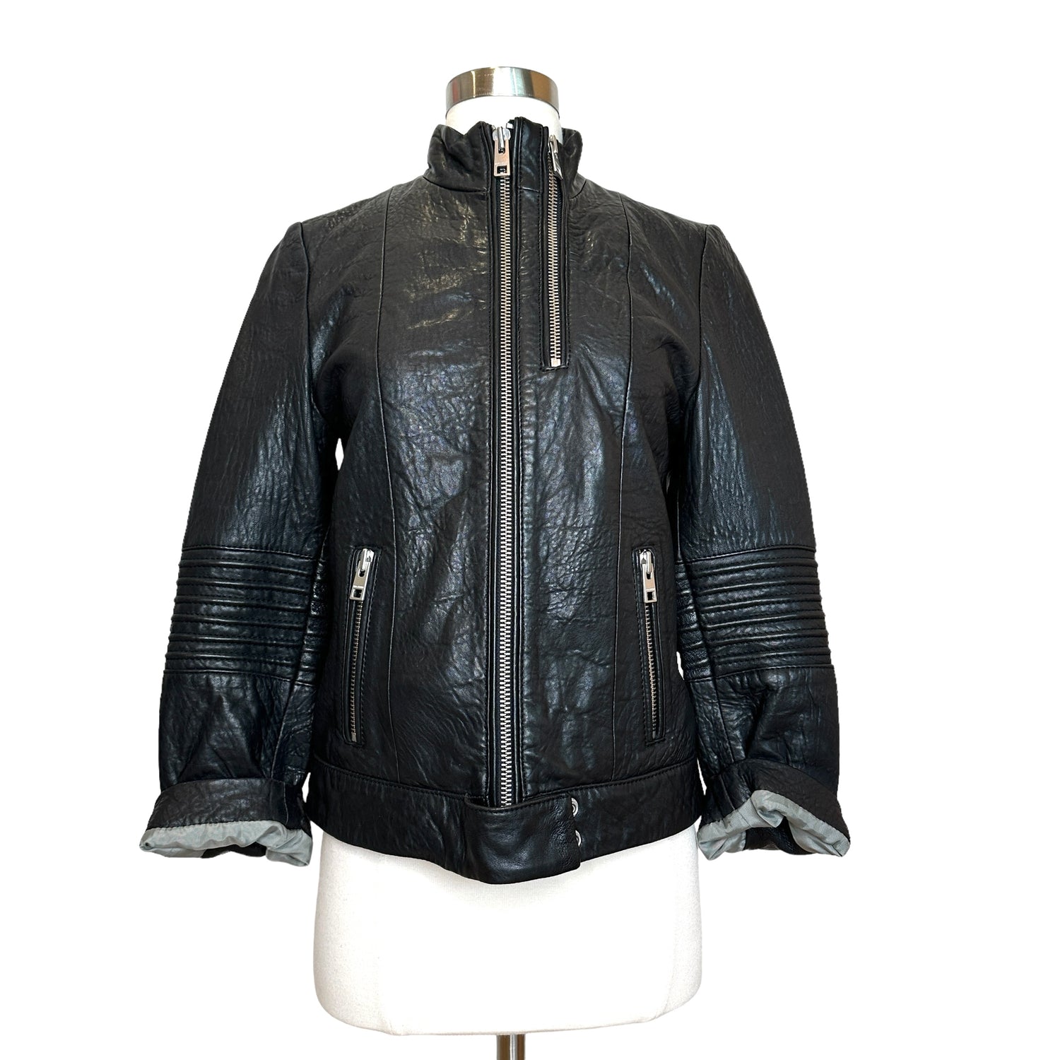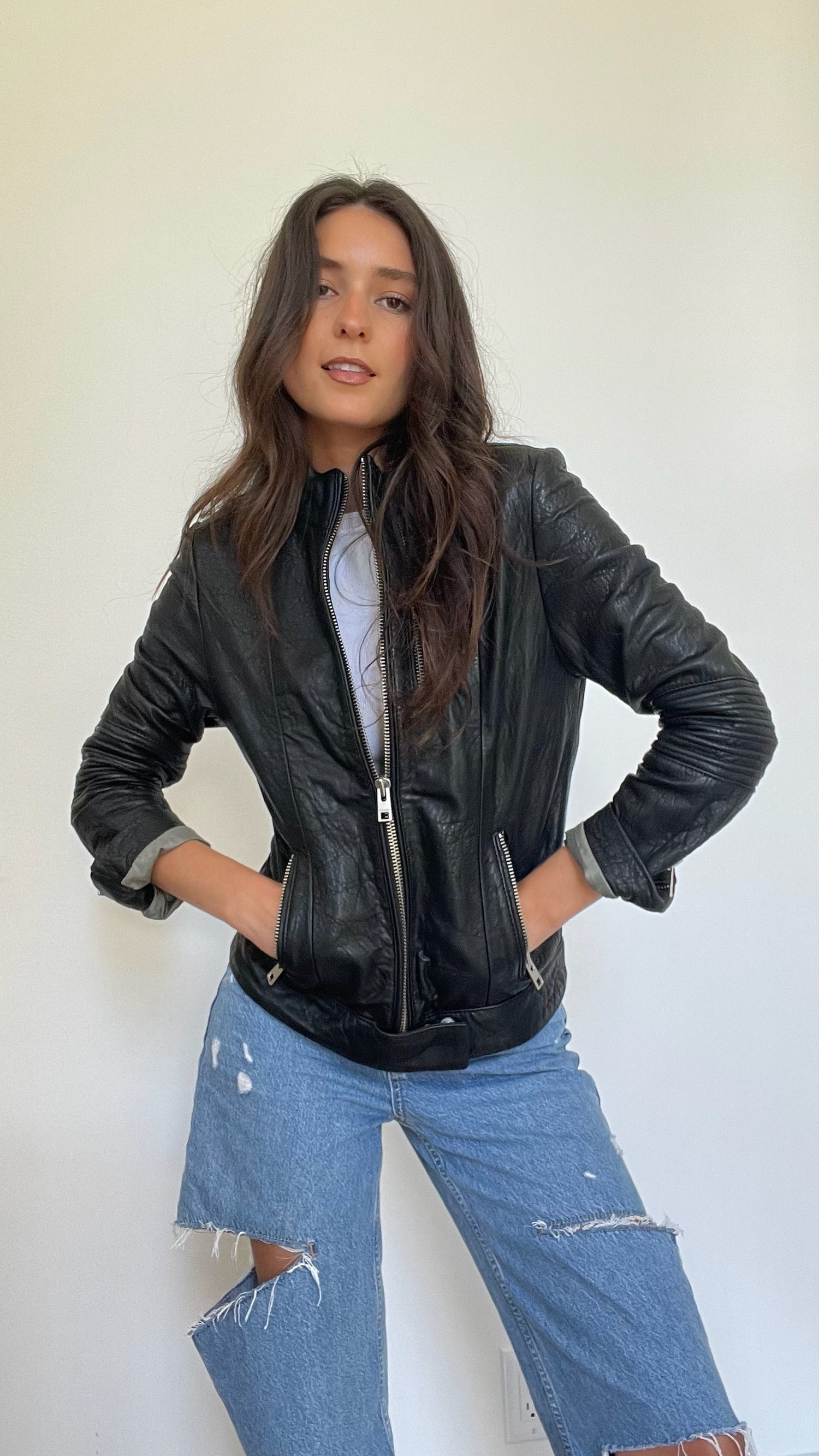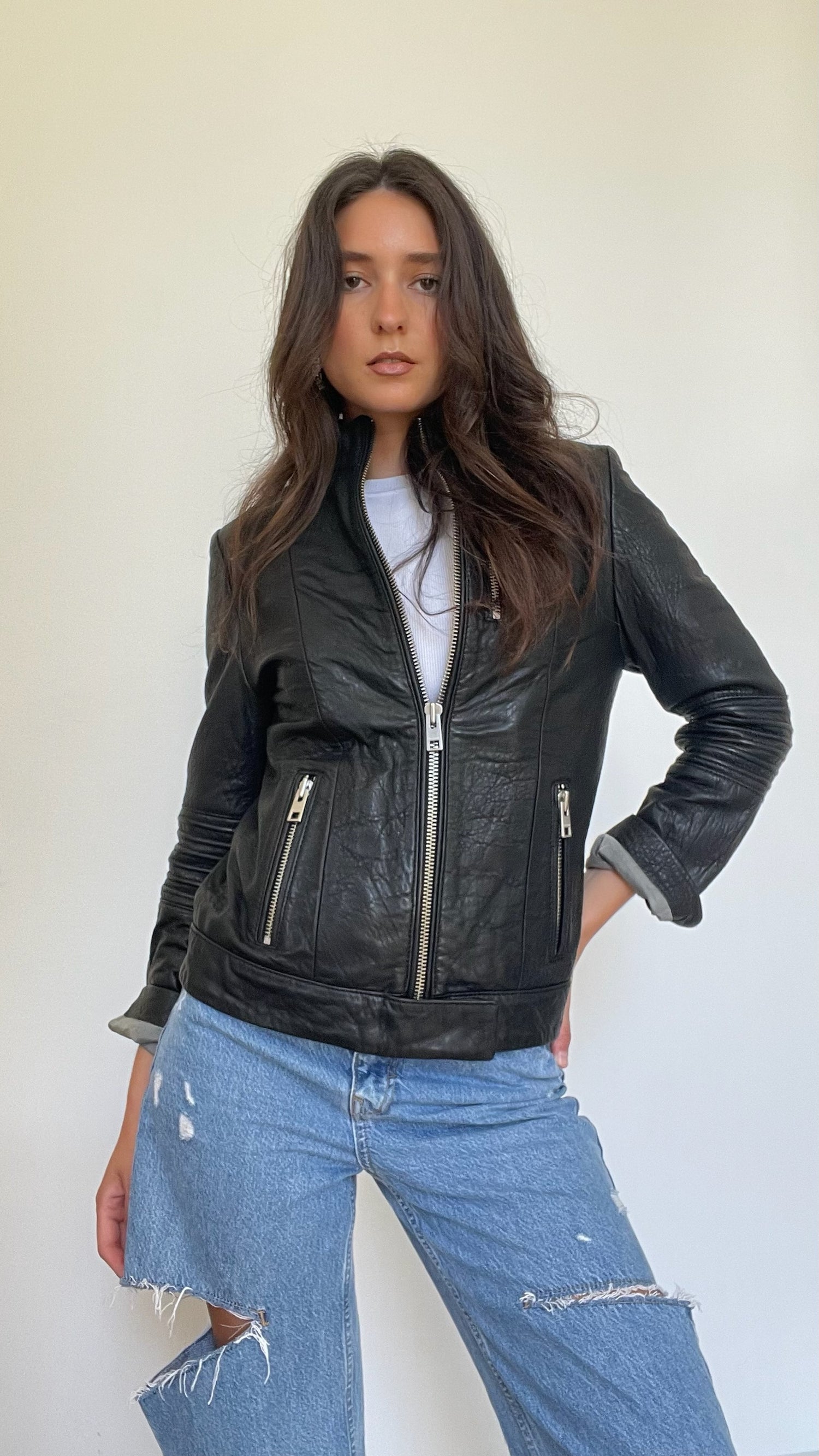 Zadig & Voltaire black leather jacket. Zipper closure at front. Two zipper pockets. One interior pocket. Beautiful printed cotton lining. Designer size small.