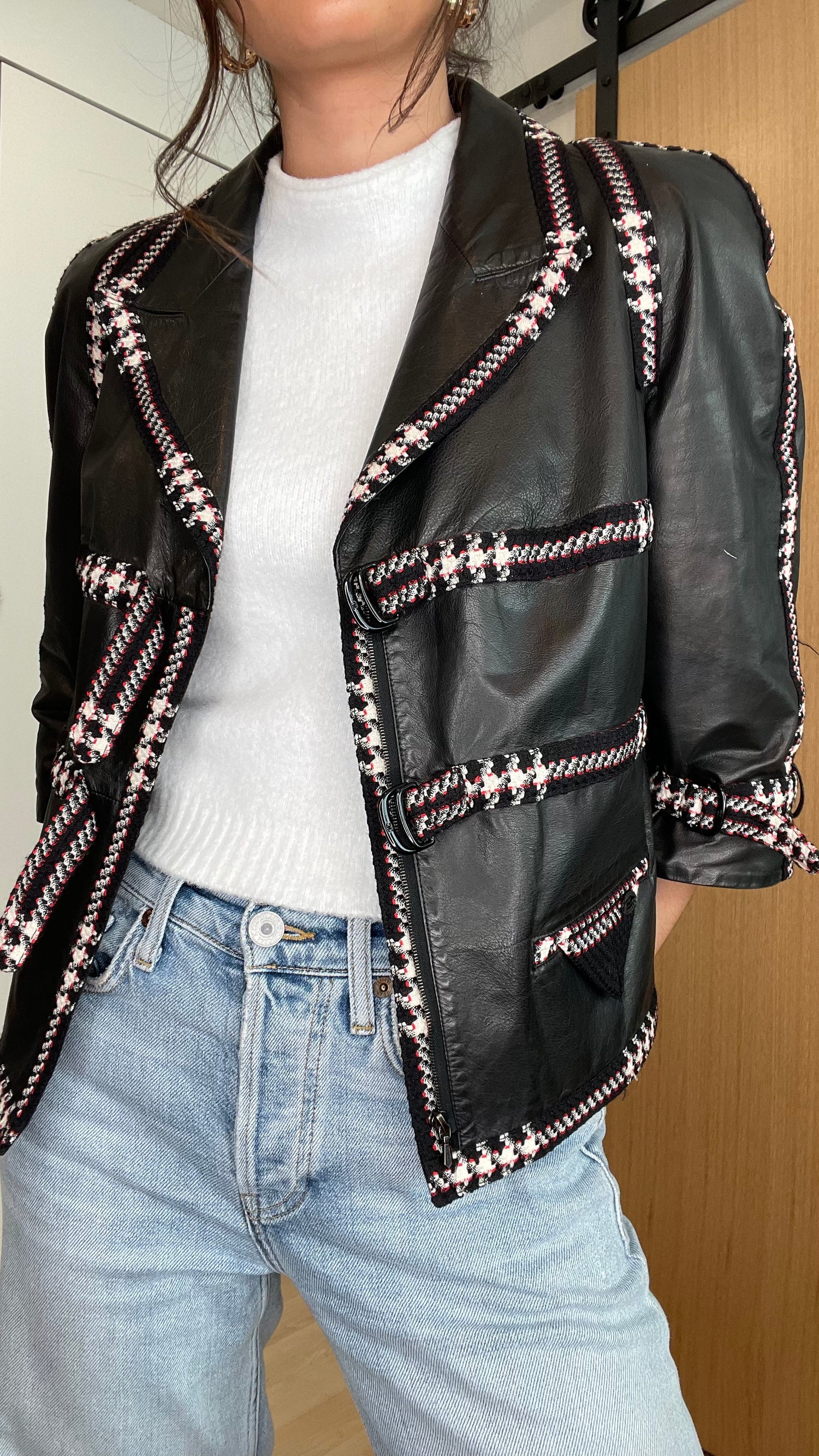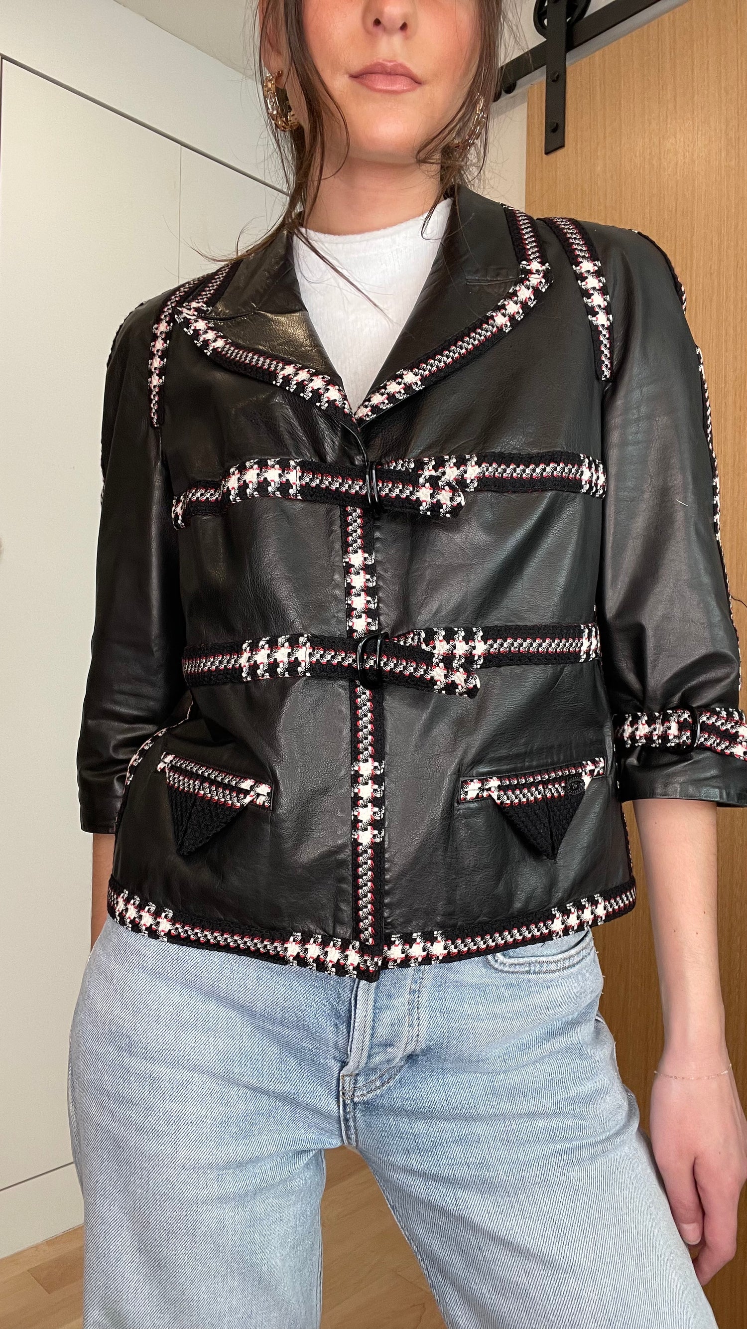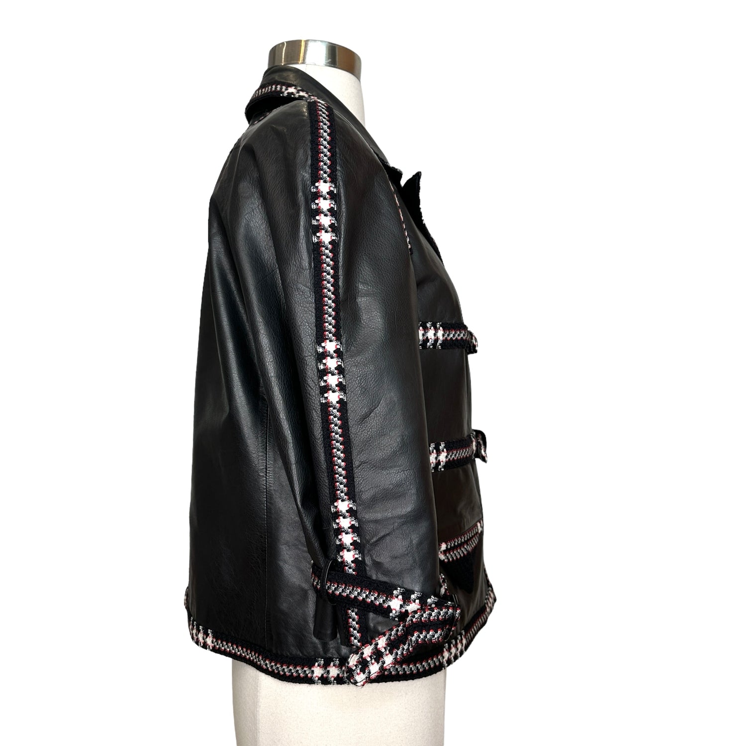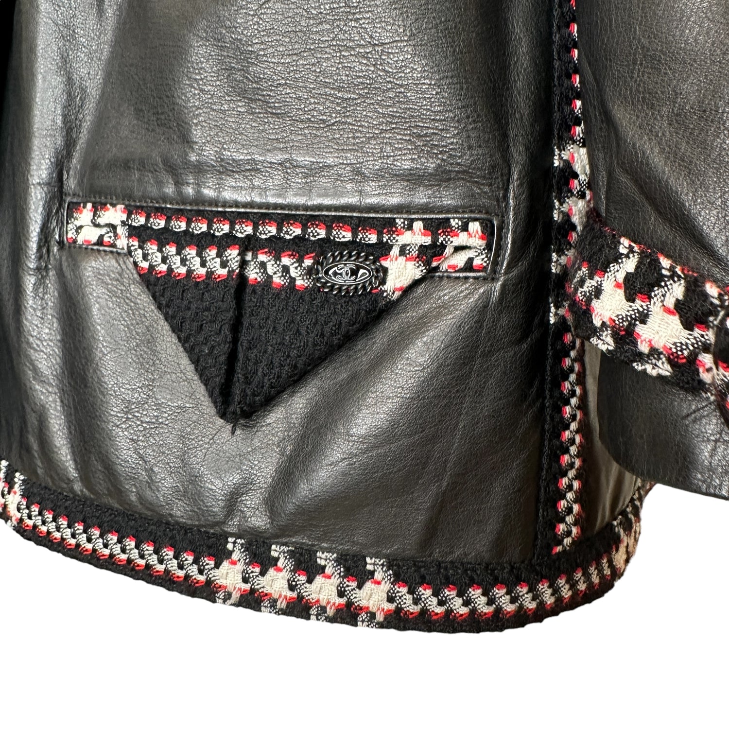 Chanel black short jacket. Red and cream tweed accents. Tie at front. Pointed collar. Vintage from the Fall 2007 Collection by Karl Lagerfeld. CC logos. Designer size 42.