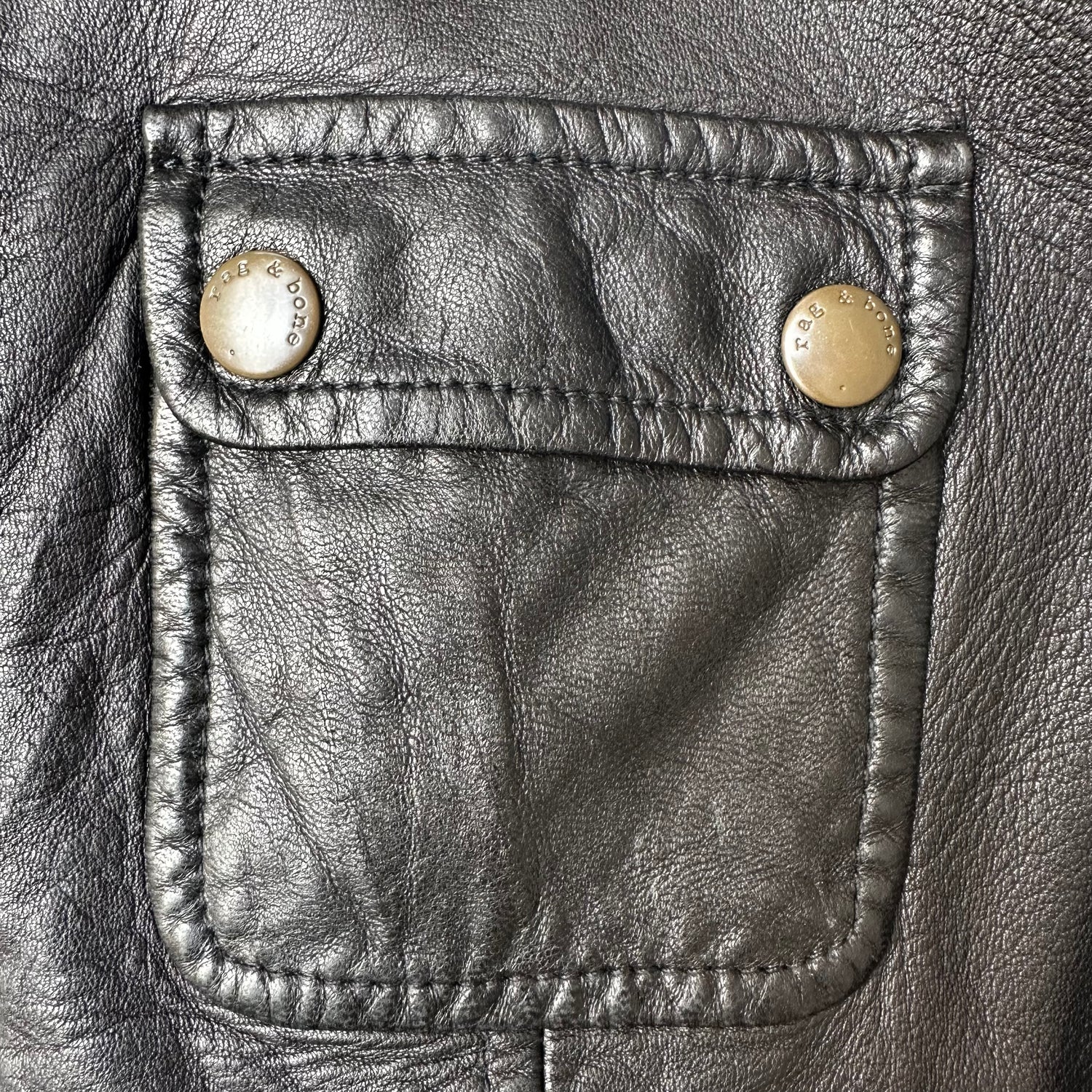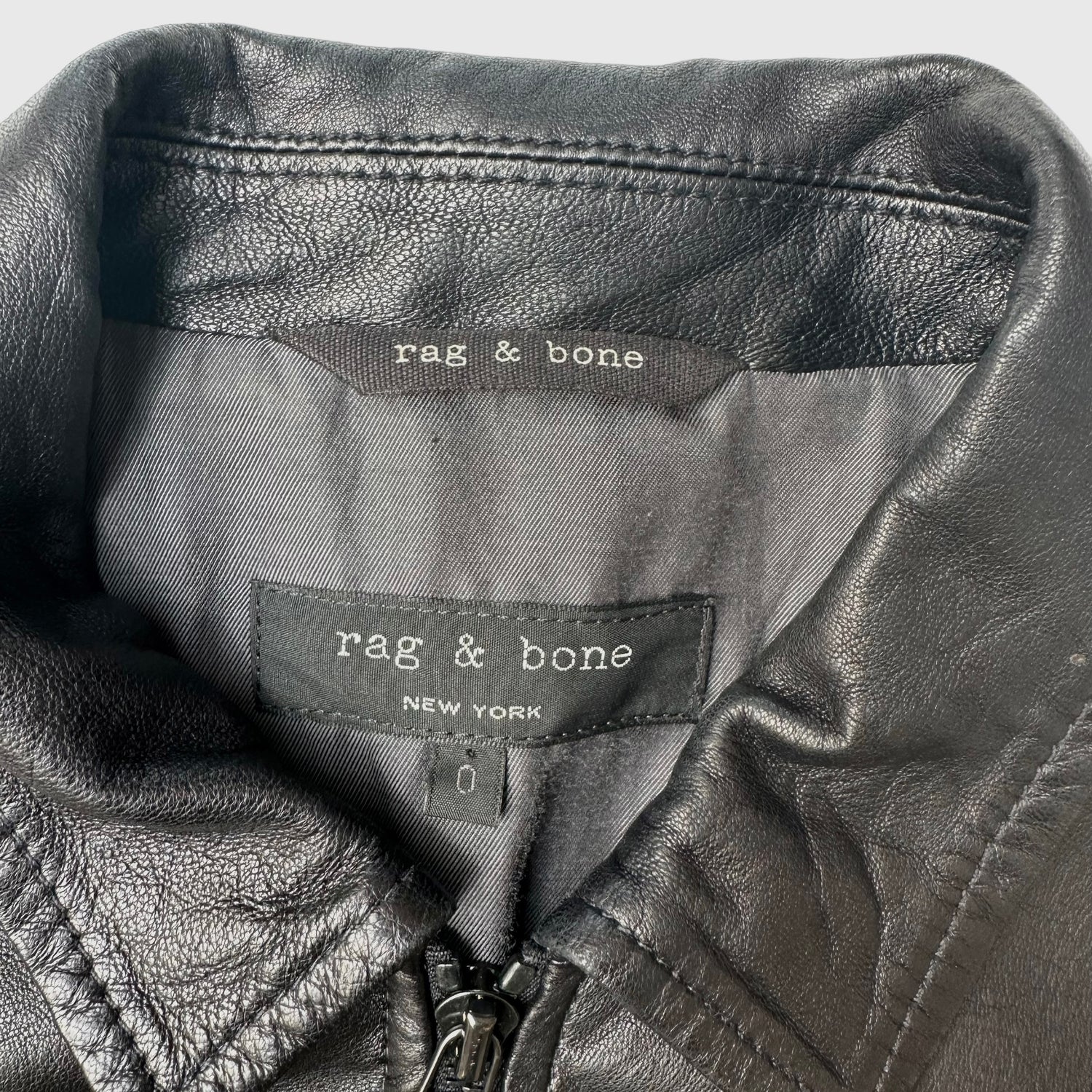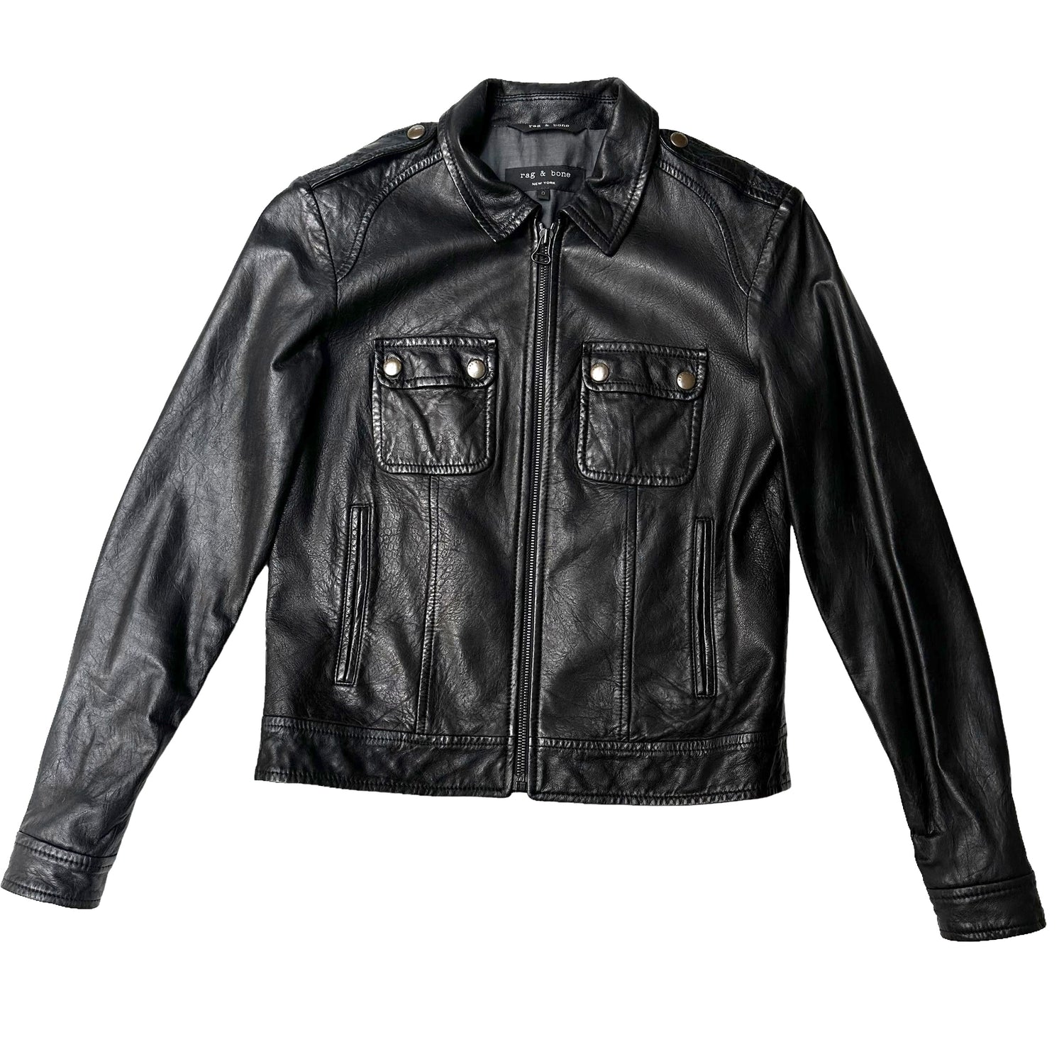 Rag & Bone black leather jacket. Pointed collar. Zipper closure at front. Two snap button pockets and two slit pockets. Cotton lined. Buttery soft leather. Rag & Bone is a well crafted company with items that are classic and meant to last. Designer size 0.