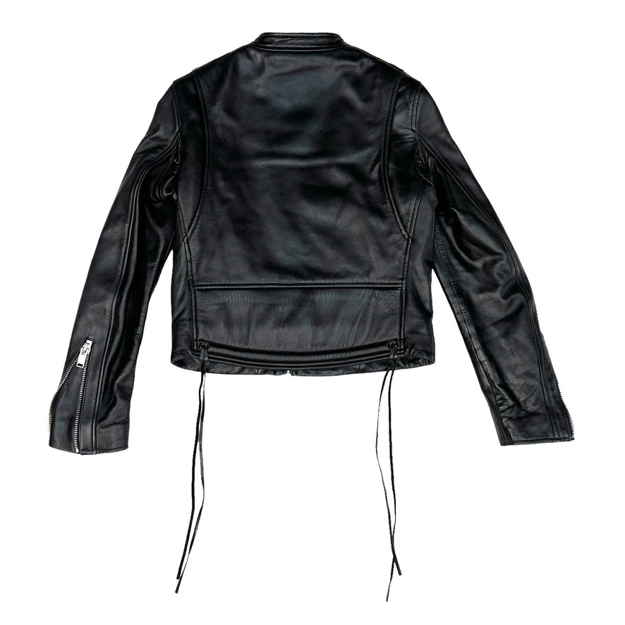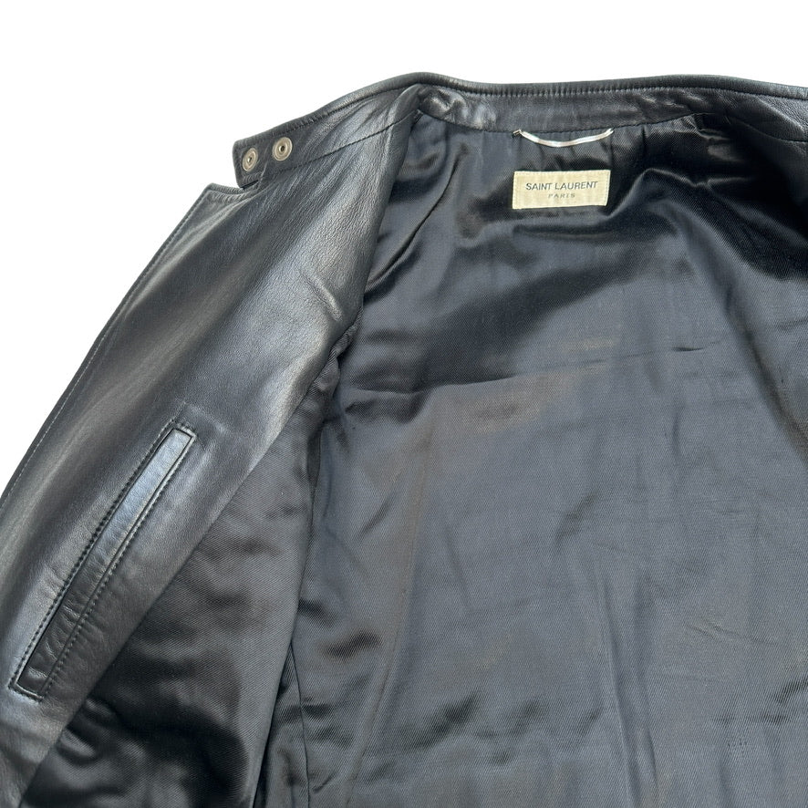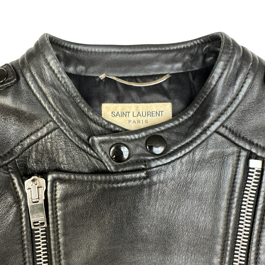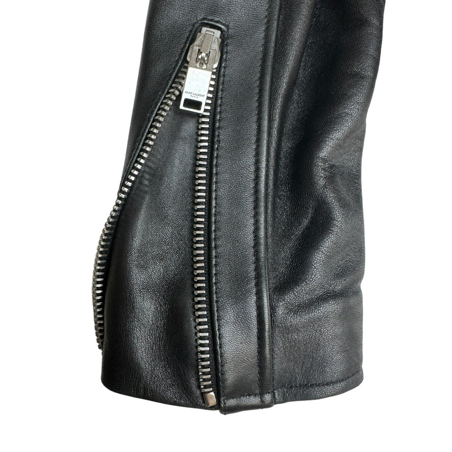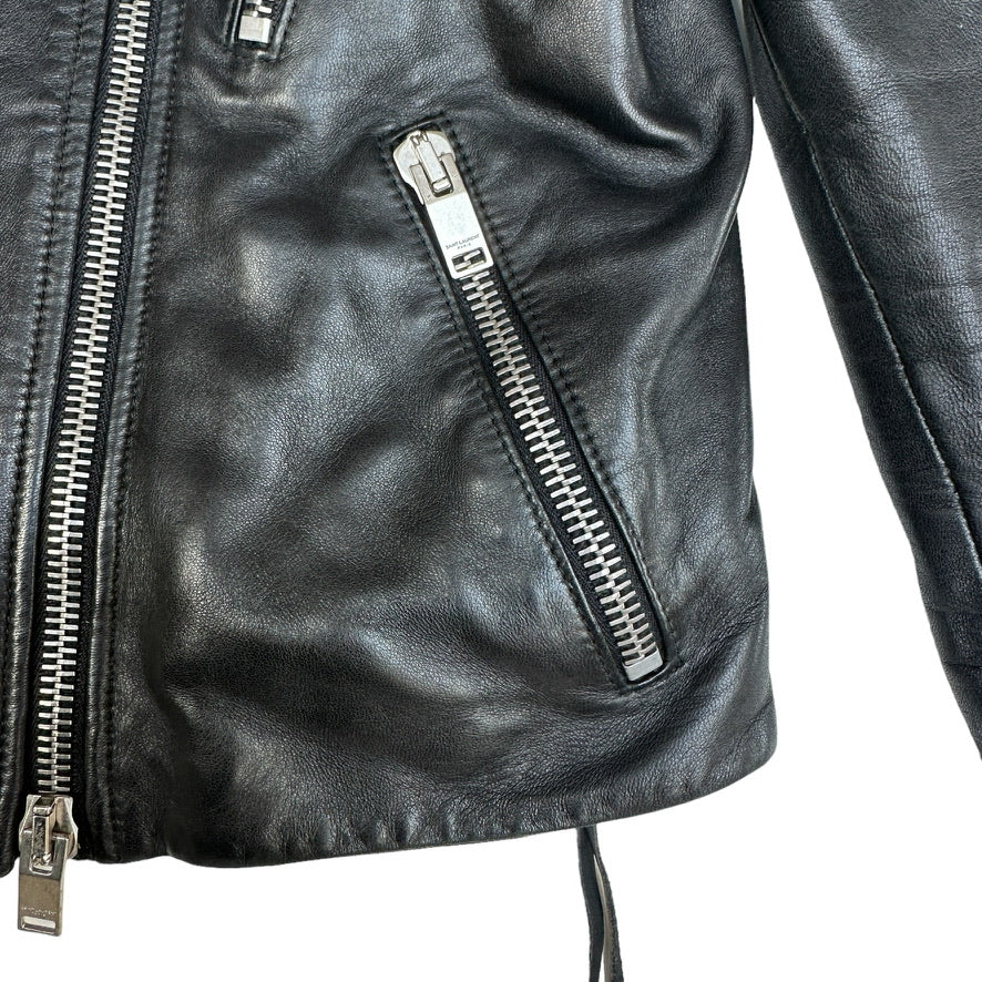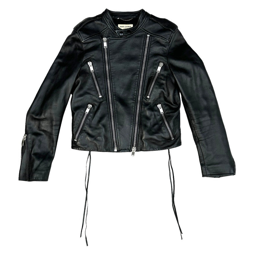 Saint Laurent black leather moto jacket. Buttery soft leather. Silver-tone hardware. Two zipper pockets. One slit pocket inside. Leather tassel details at back. Designer size 38.