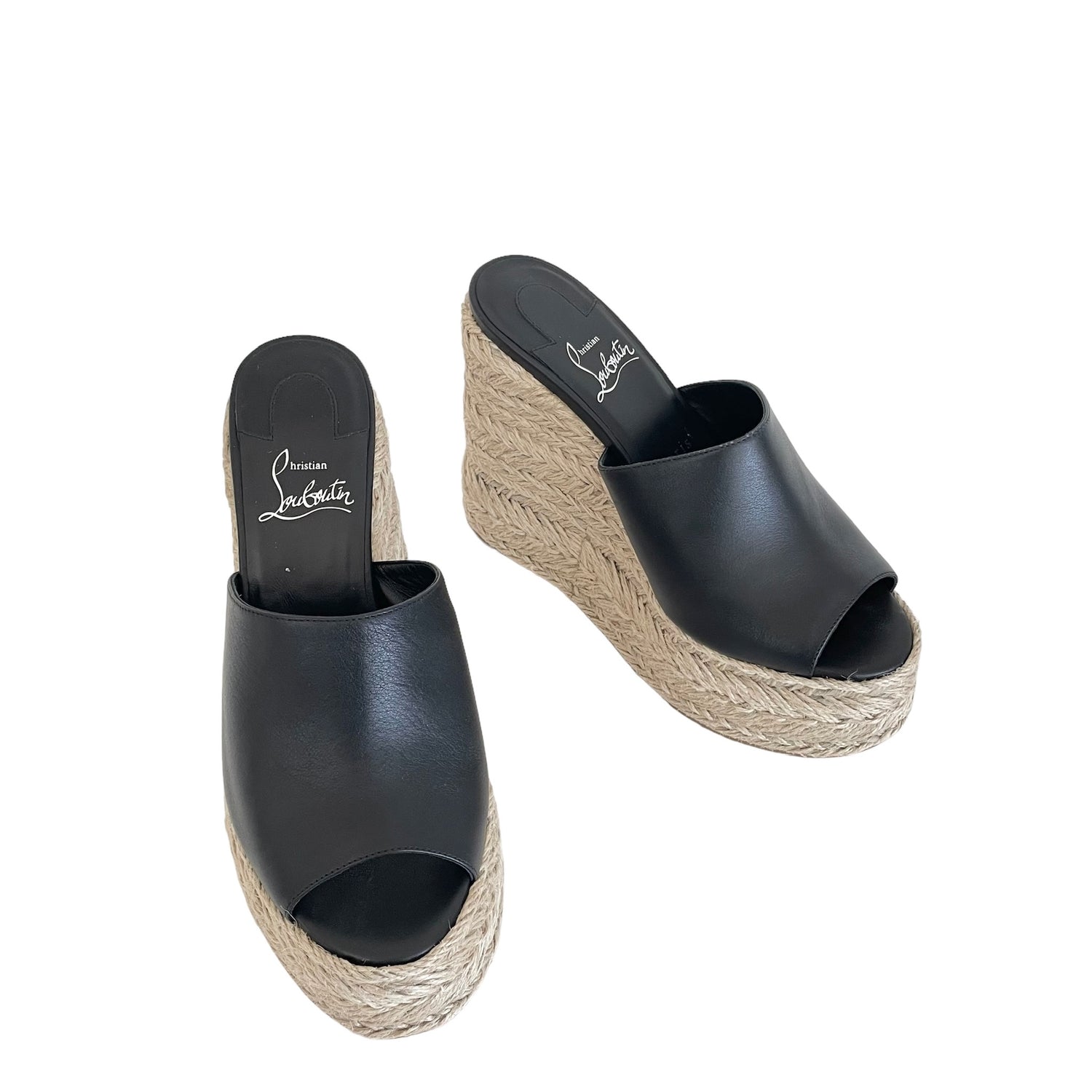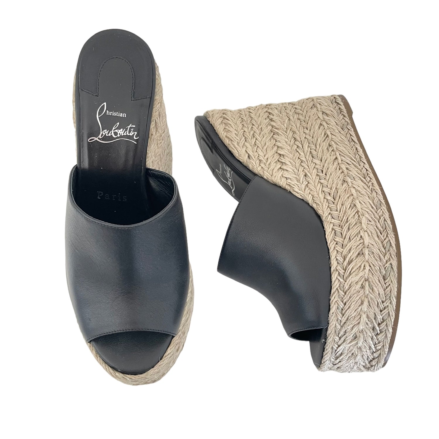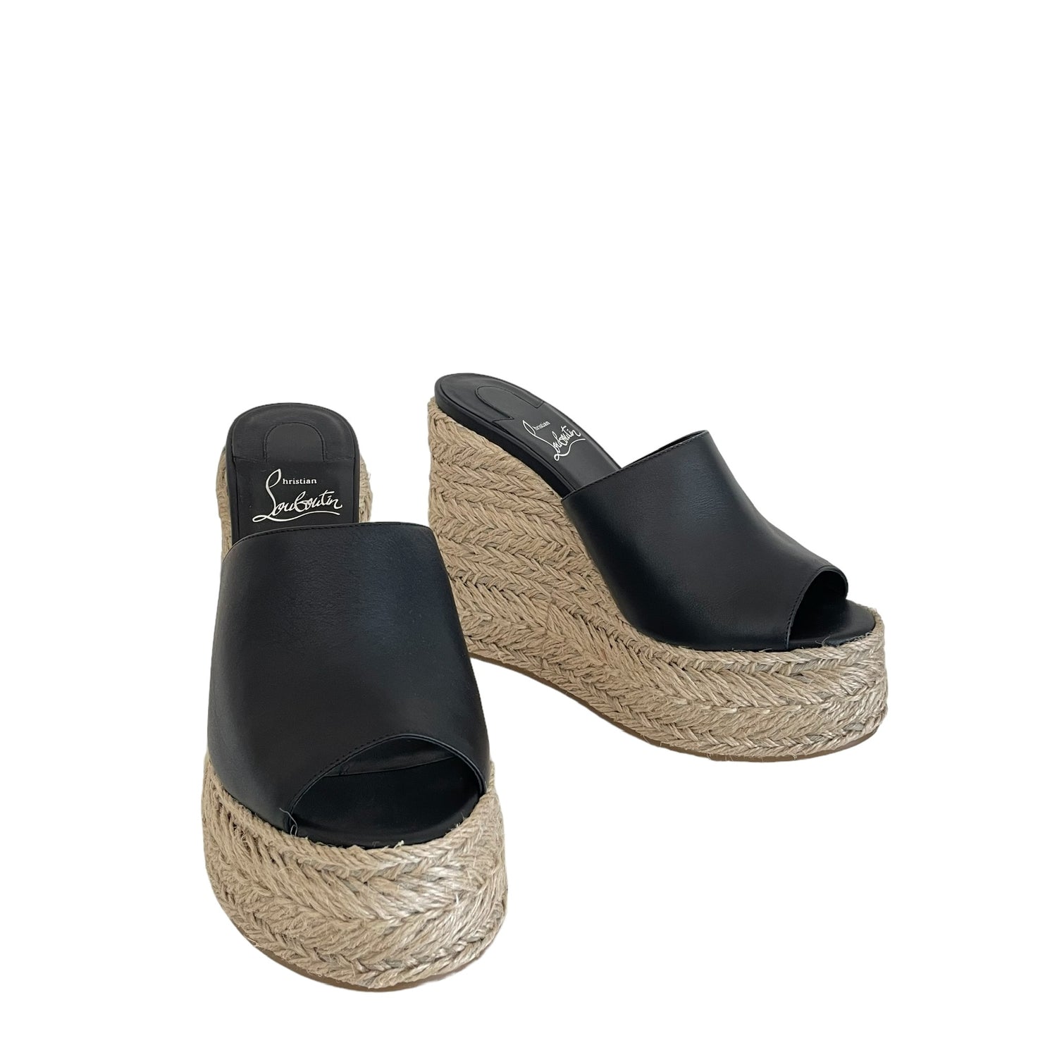 Christian Louboutin black leather platform heels. Open toe slides. Raffia wedges. Iconic red bottoms. Designer size 37.