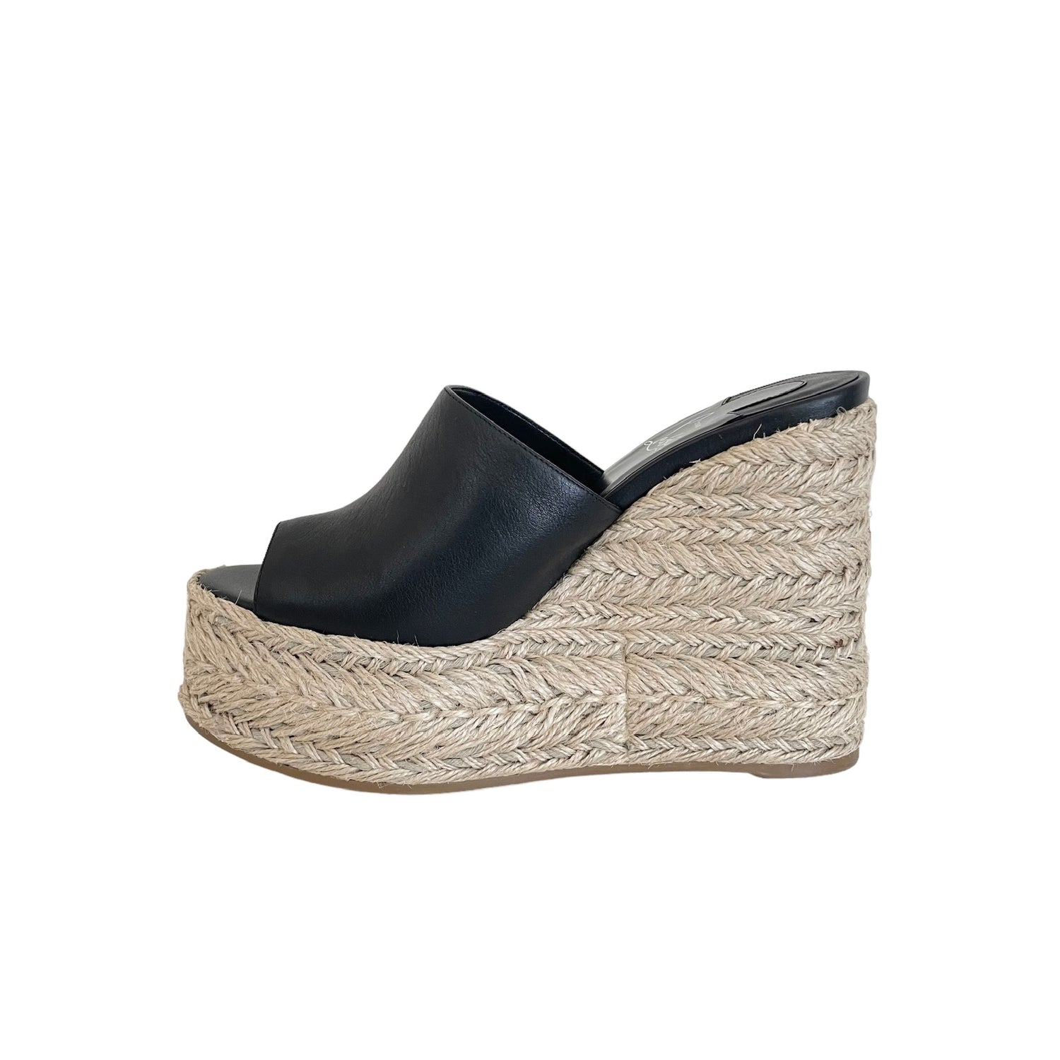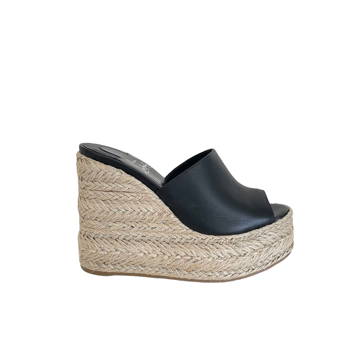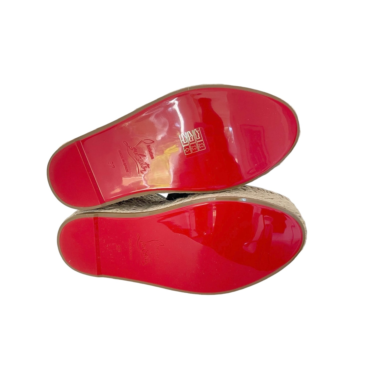 Christian Louboutin black leather platform heels. Open toe slides. Raffia wedges. Iconic red bottoms. Designer size 37.