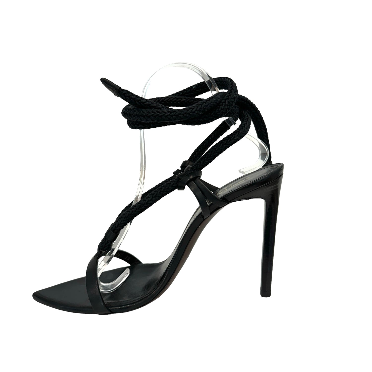 Saint Laurent black heeled sandals. Black leather and cotton ropes. Tie at ankle. Pointed toe. Designer size 38.5.