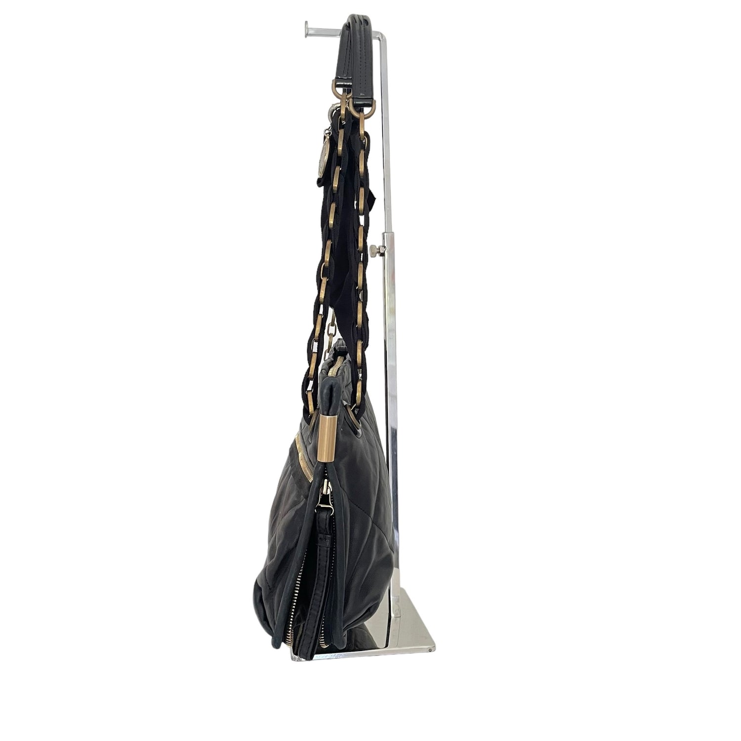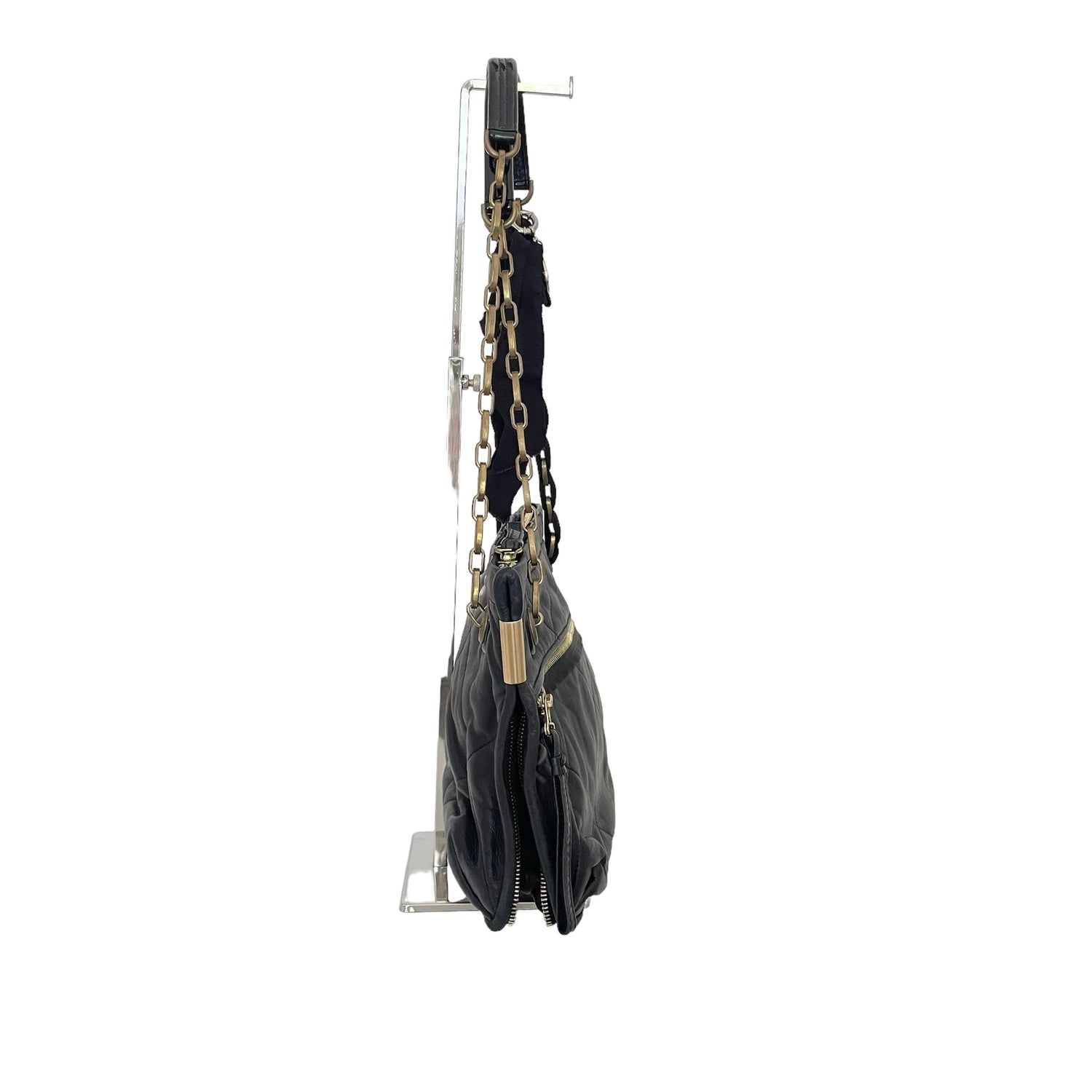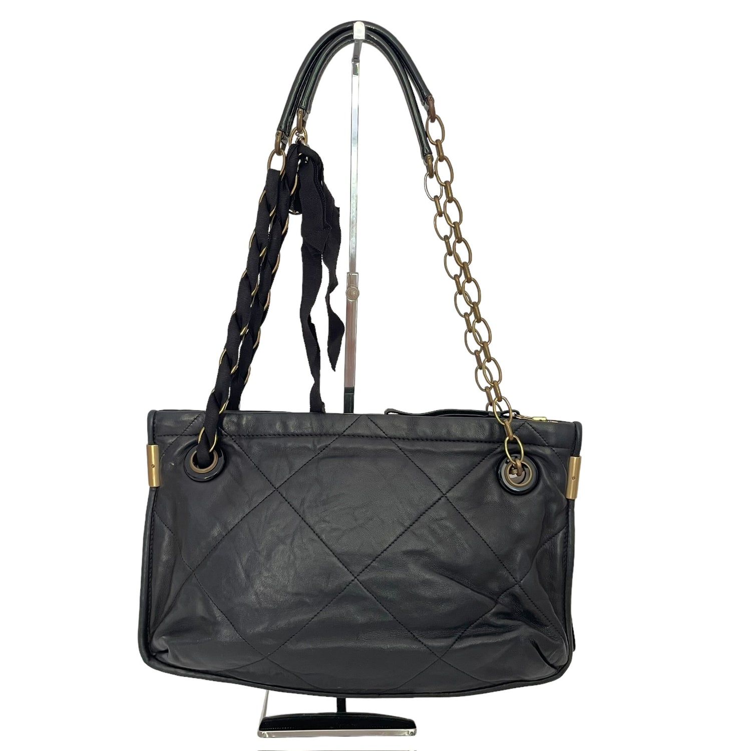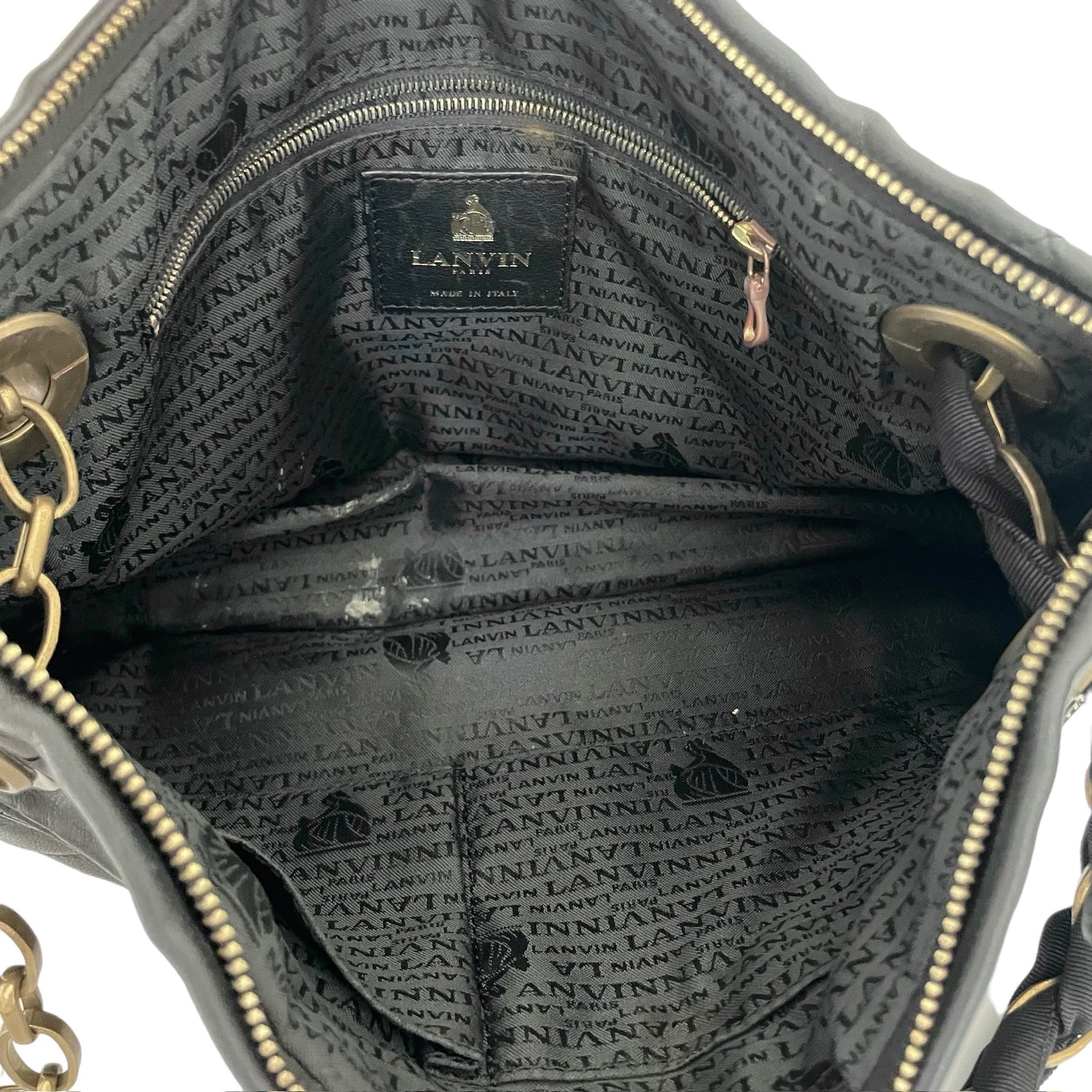 Lanvin vintage shoulder bag. Black buttery soft lambskin leather. Gold-tone chain and leather strap. Grosgrain bow and medallion details. One exterior zipper pocket. One interior zipper pocket. Exandable bottom.
