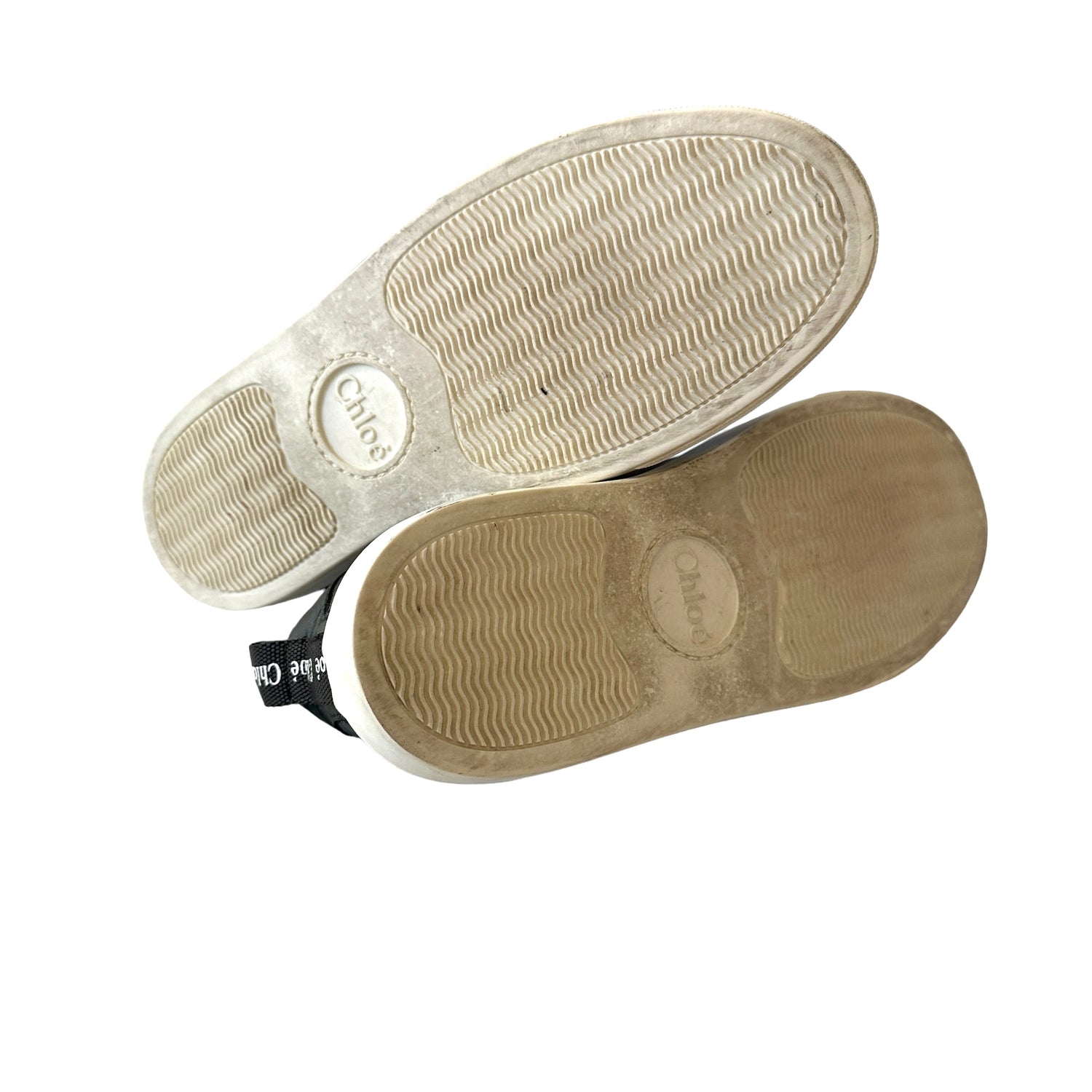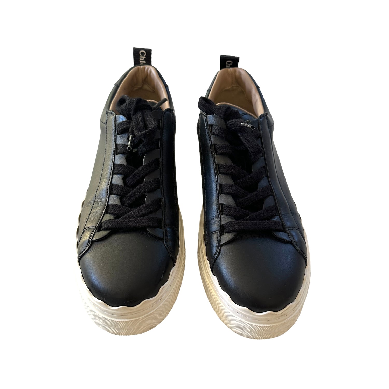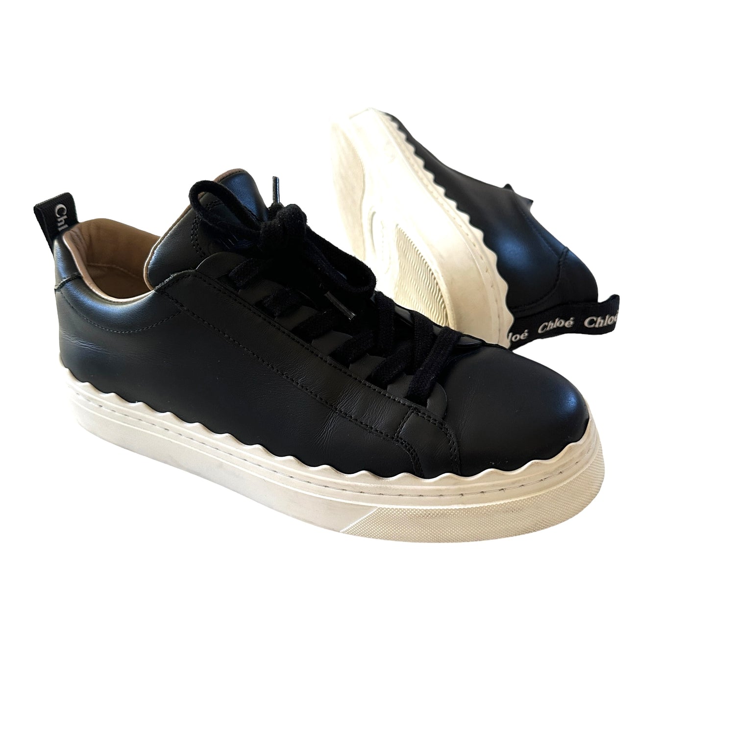 Chloé black leather sneakers. Round toe. Scalloped white rubber soles. Laces closure at top. Designer size 38.