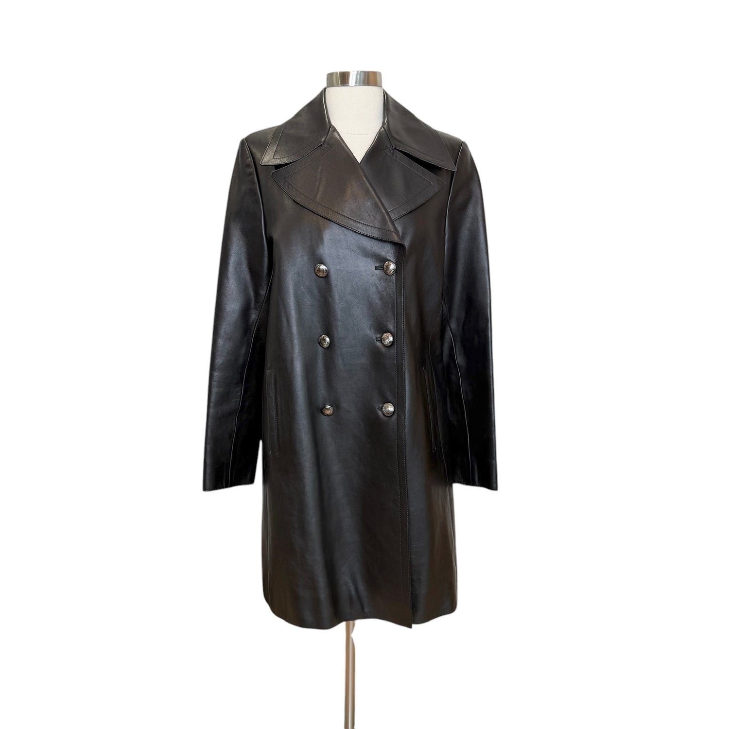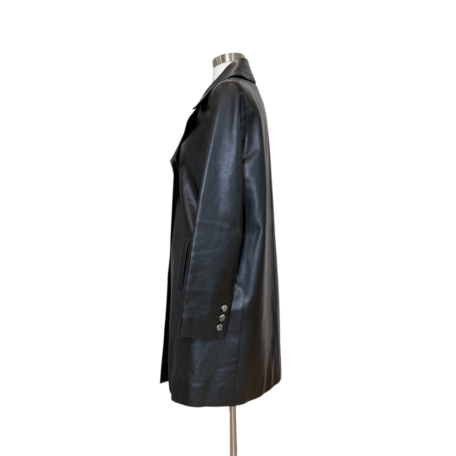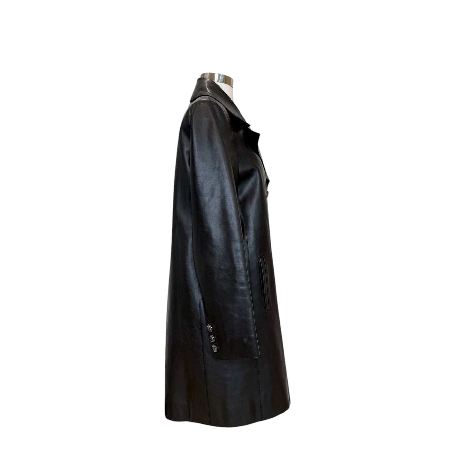 Prada leather trench coat. Prada logo silver buttons. Pointed collar. Designer size 44.
