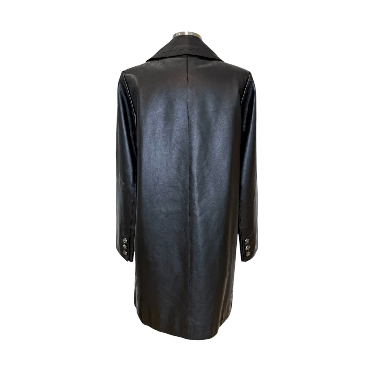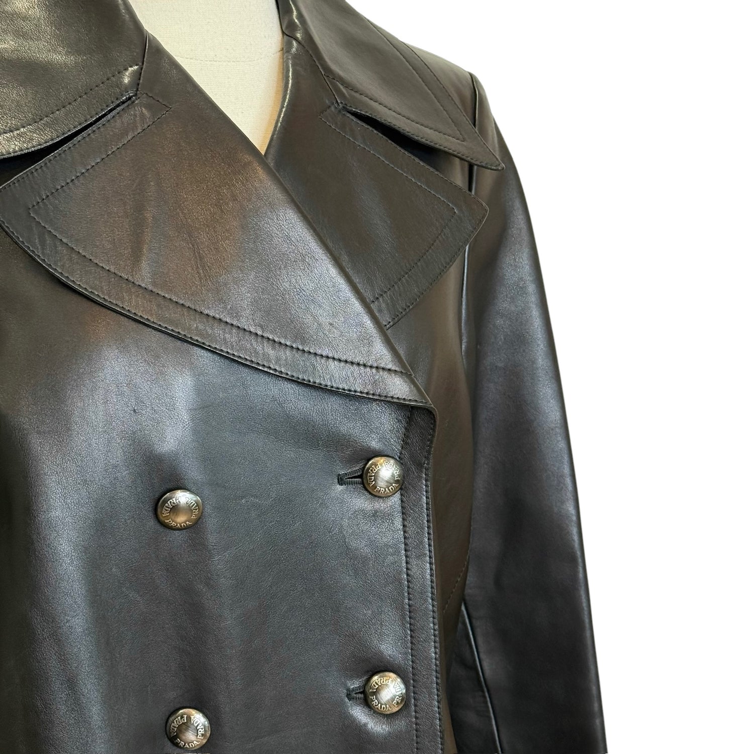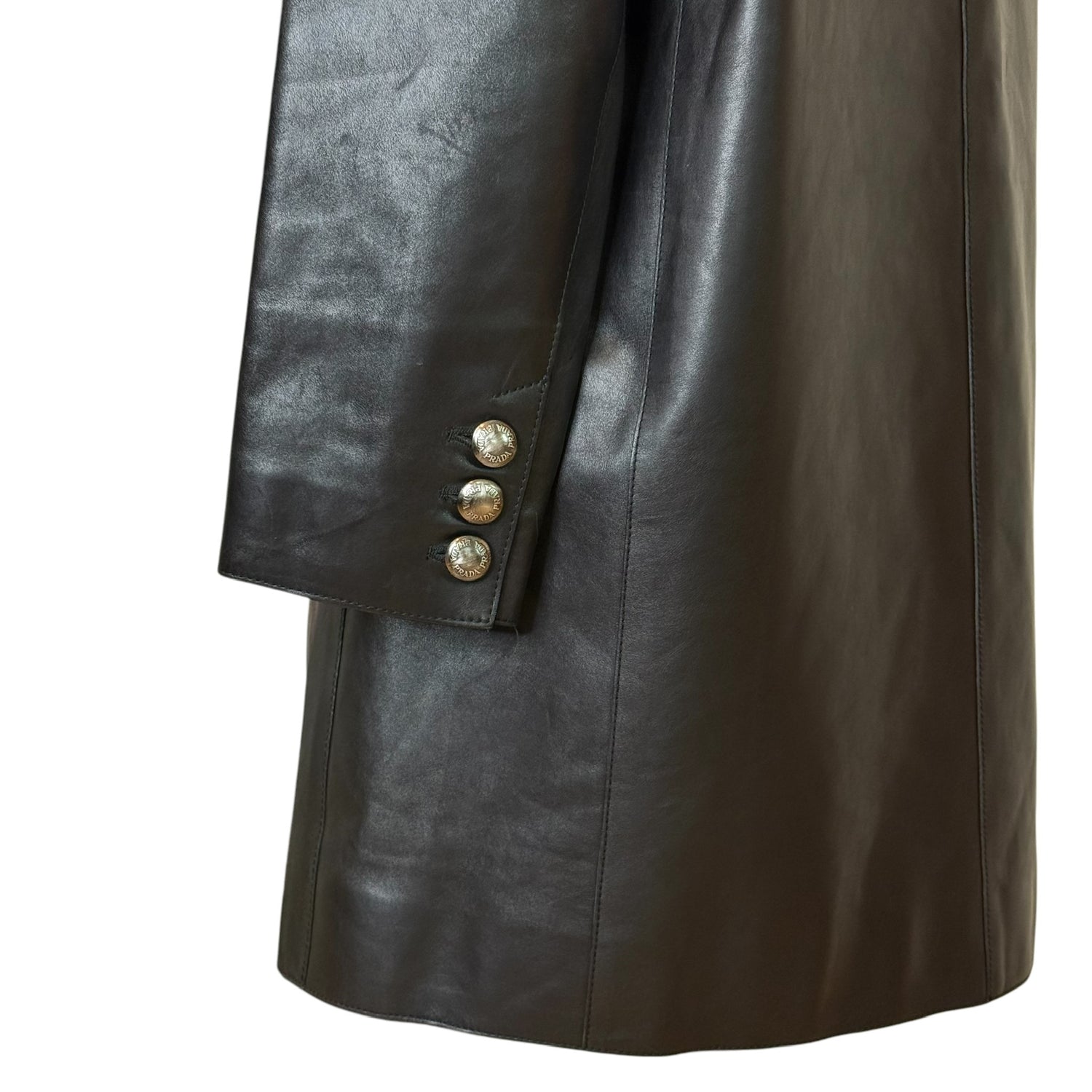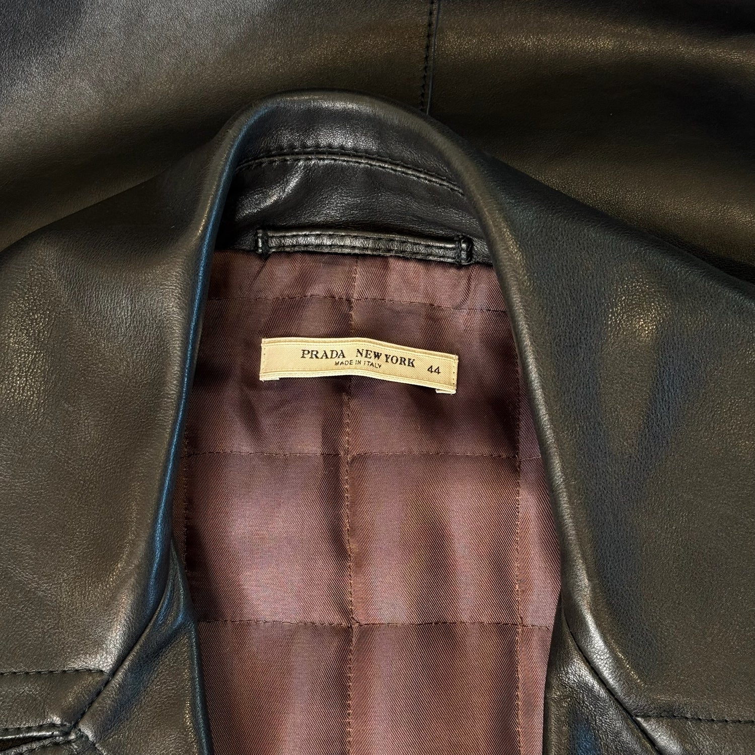 Prada leather trench coat. Prada logo silver buttons. Pointed collar. Designer size 44.