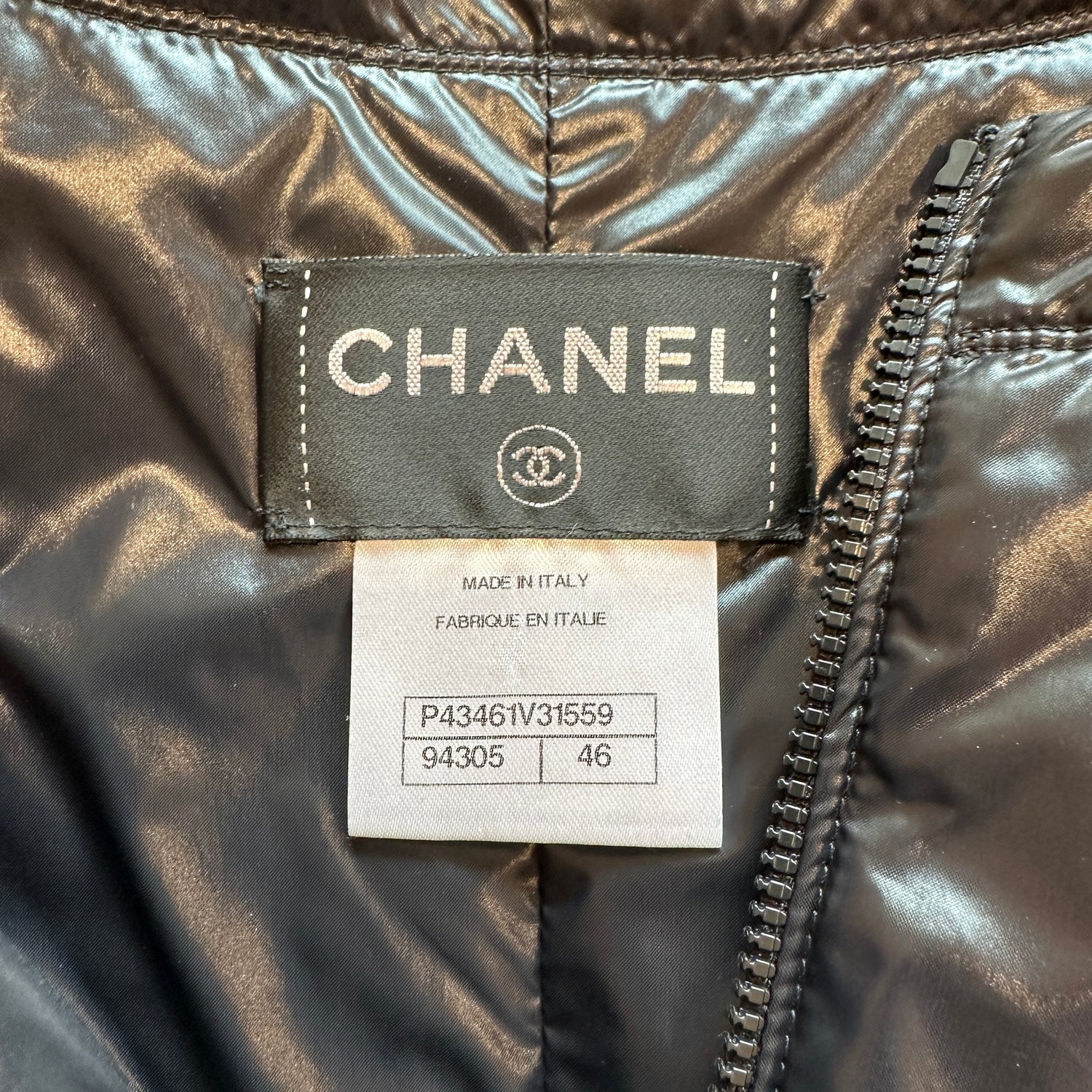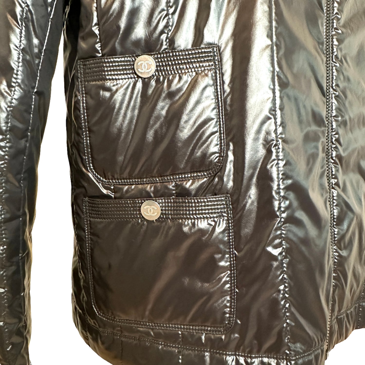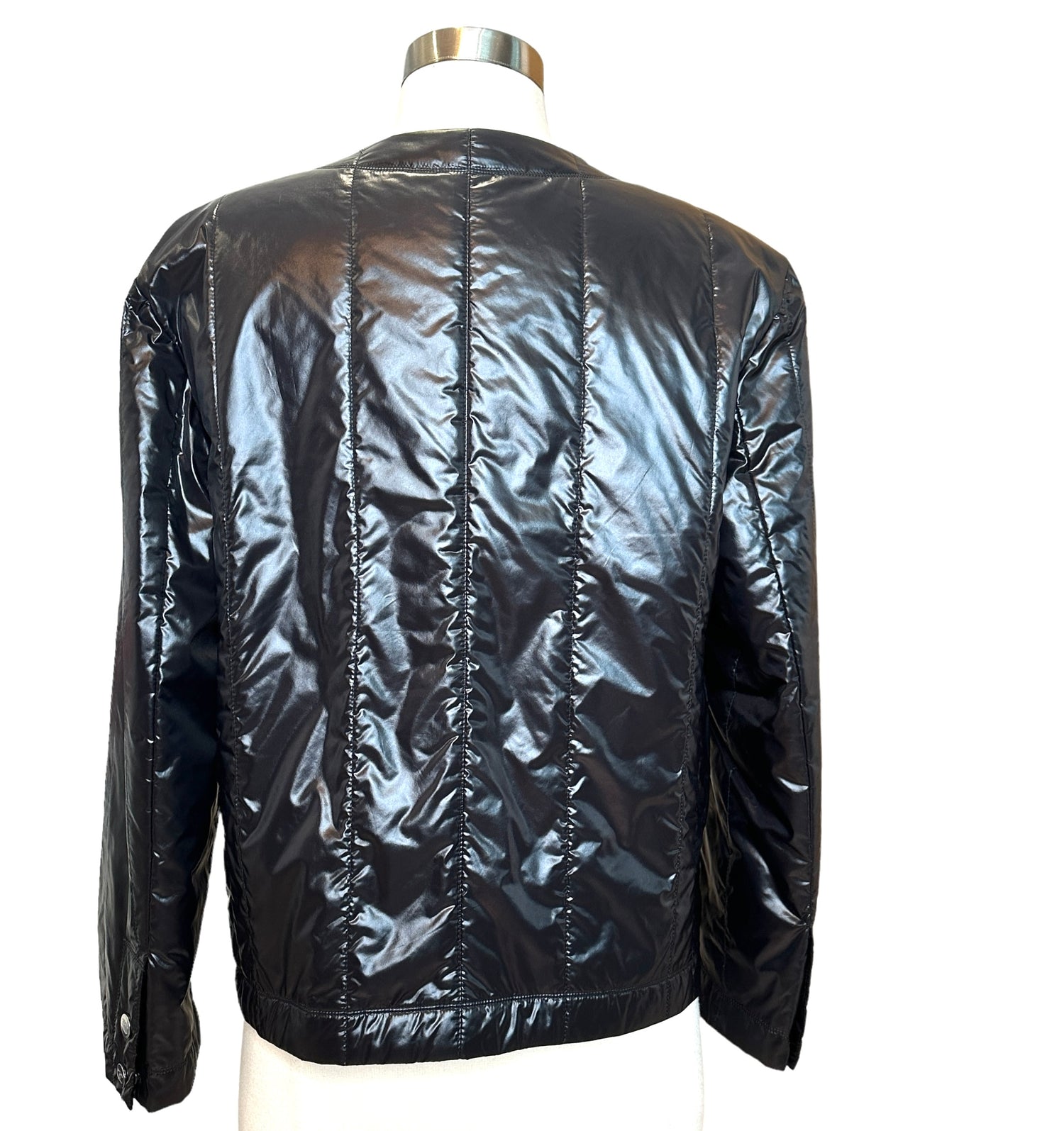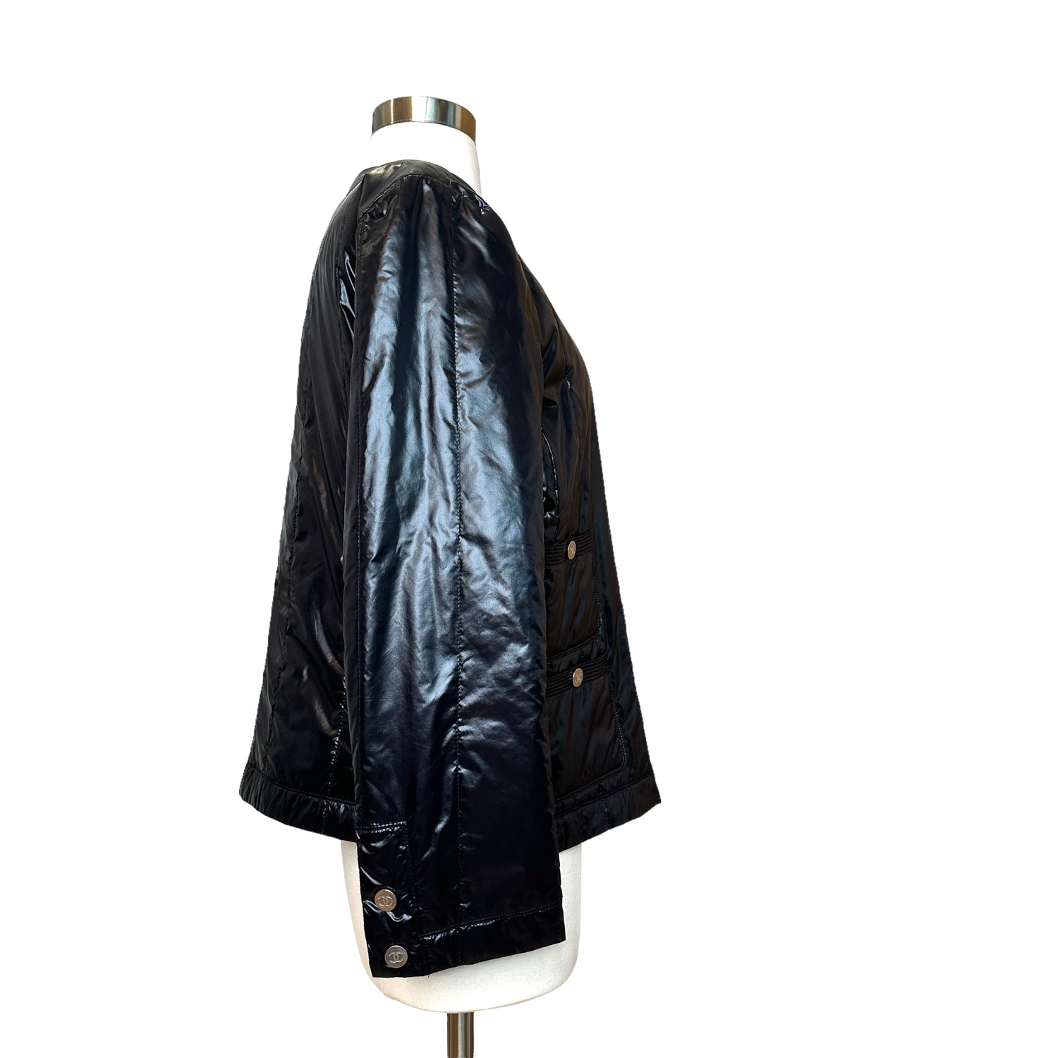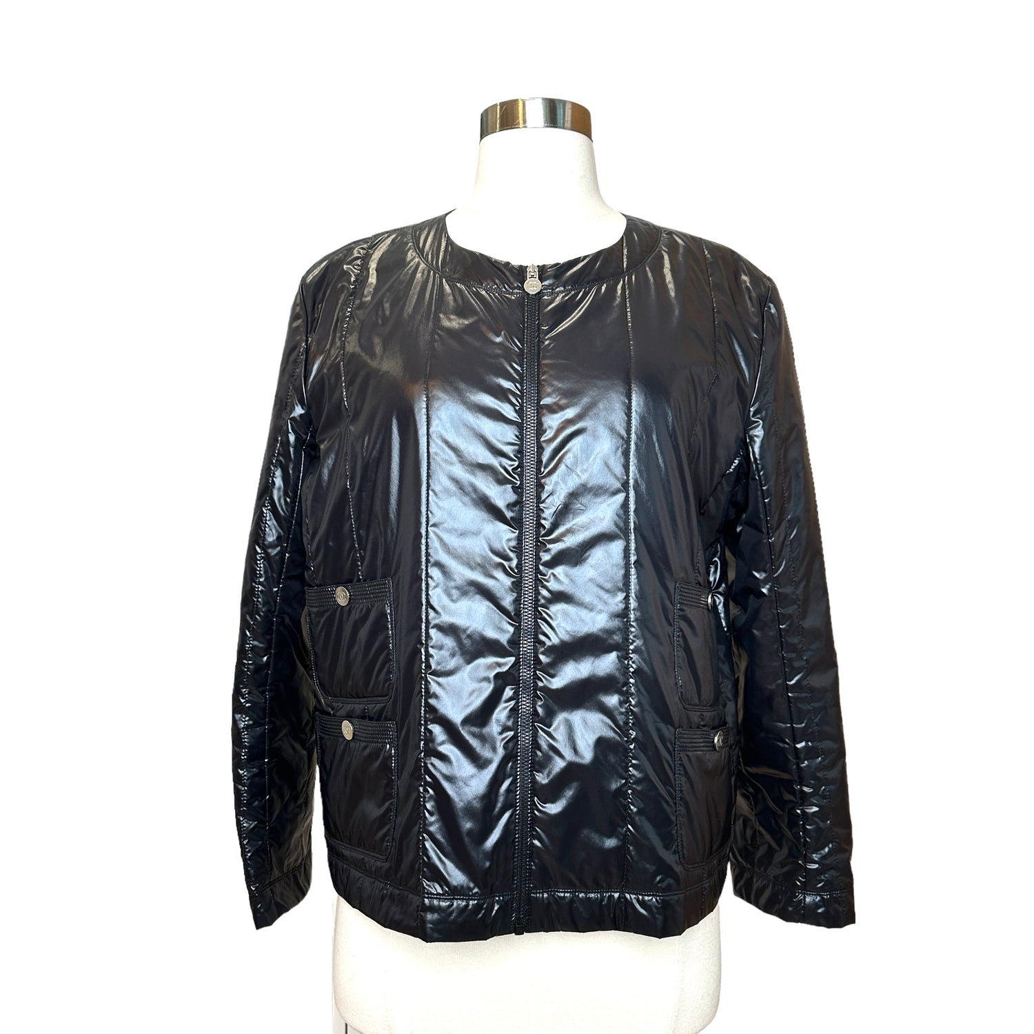 Chanel black lightweight jacket. From the 2012 Collection by Karl Lagerfeld. Gorgeous flat silver-tone buttons. Zipper closure at front. Four snap button pockets. Designer size 46.
