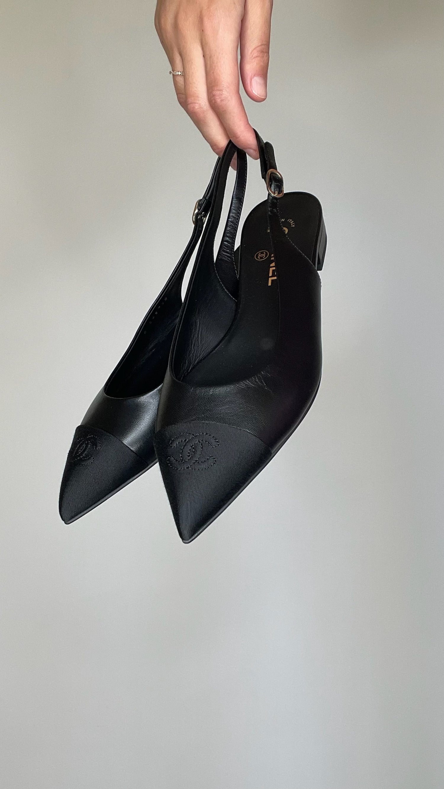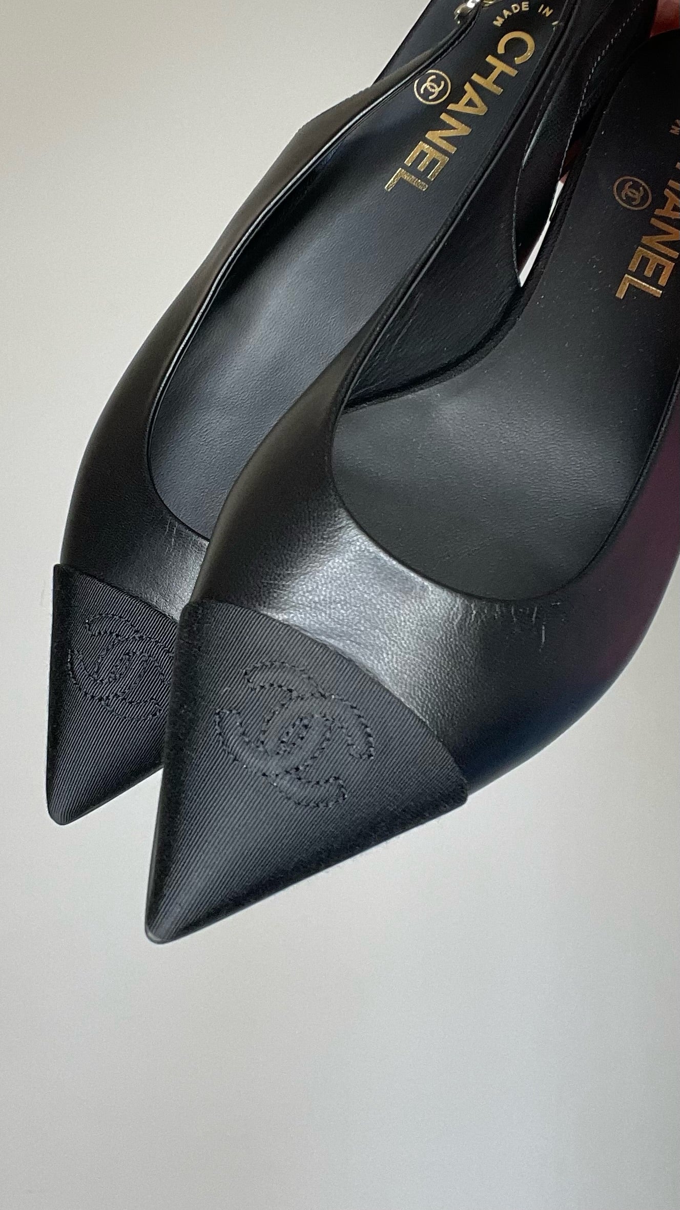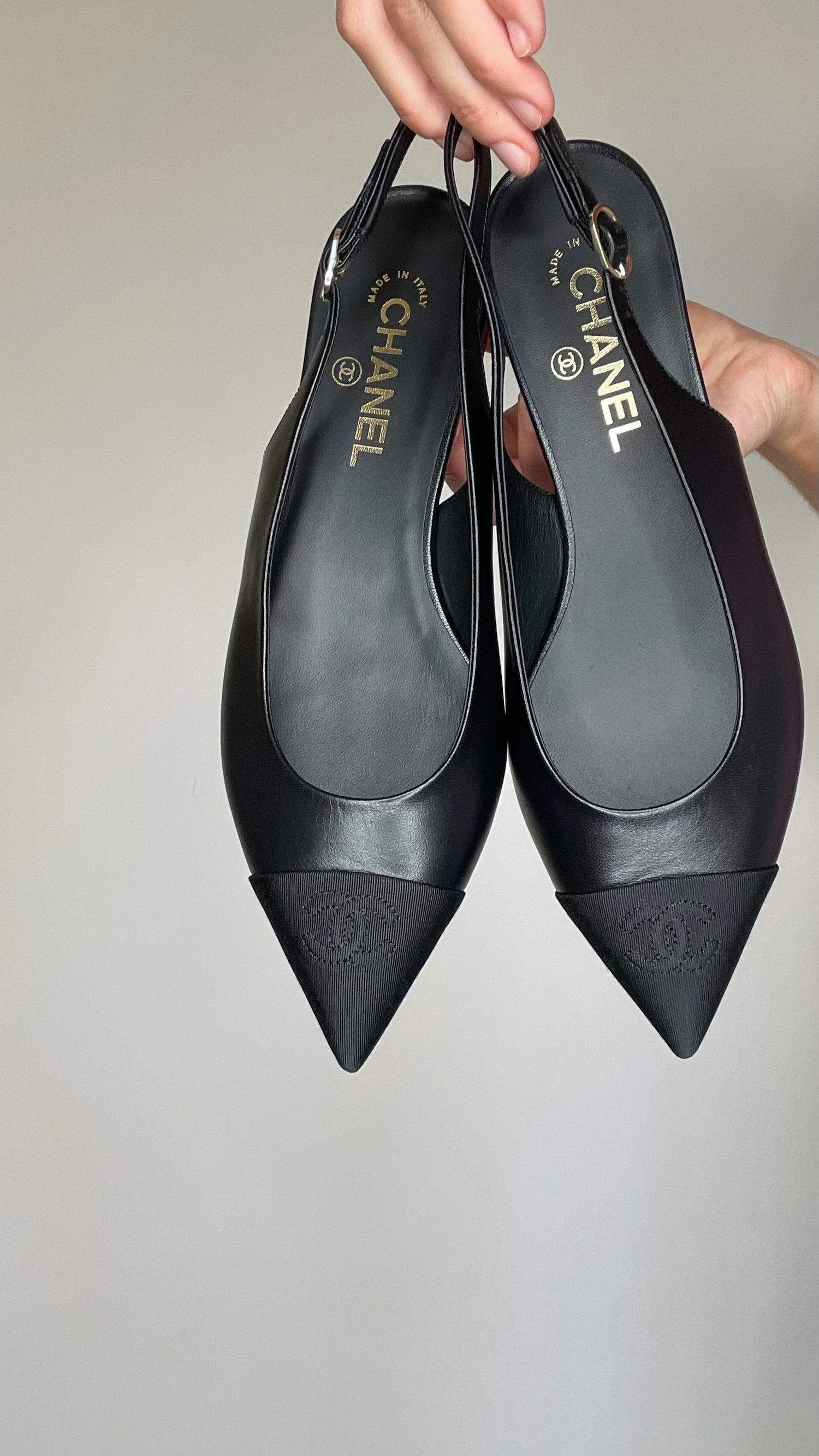 Chanel 2024 slingback shoes. Black logo on grosgrain and lambskin. Designer size 39.5