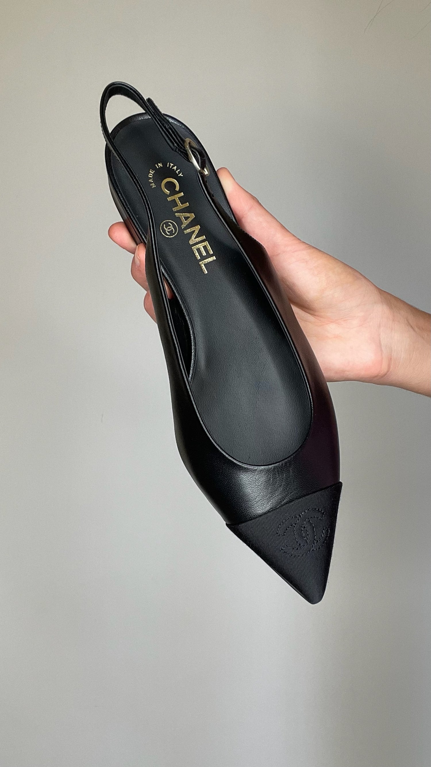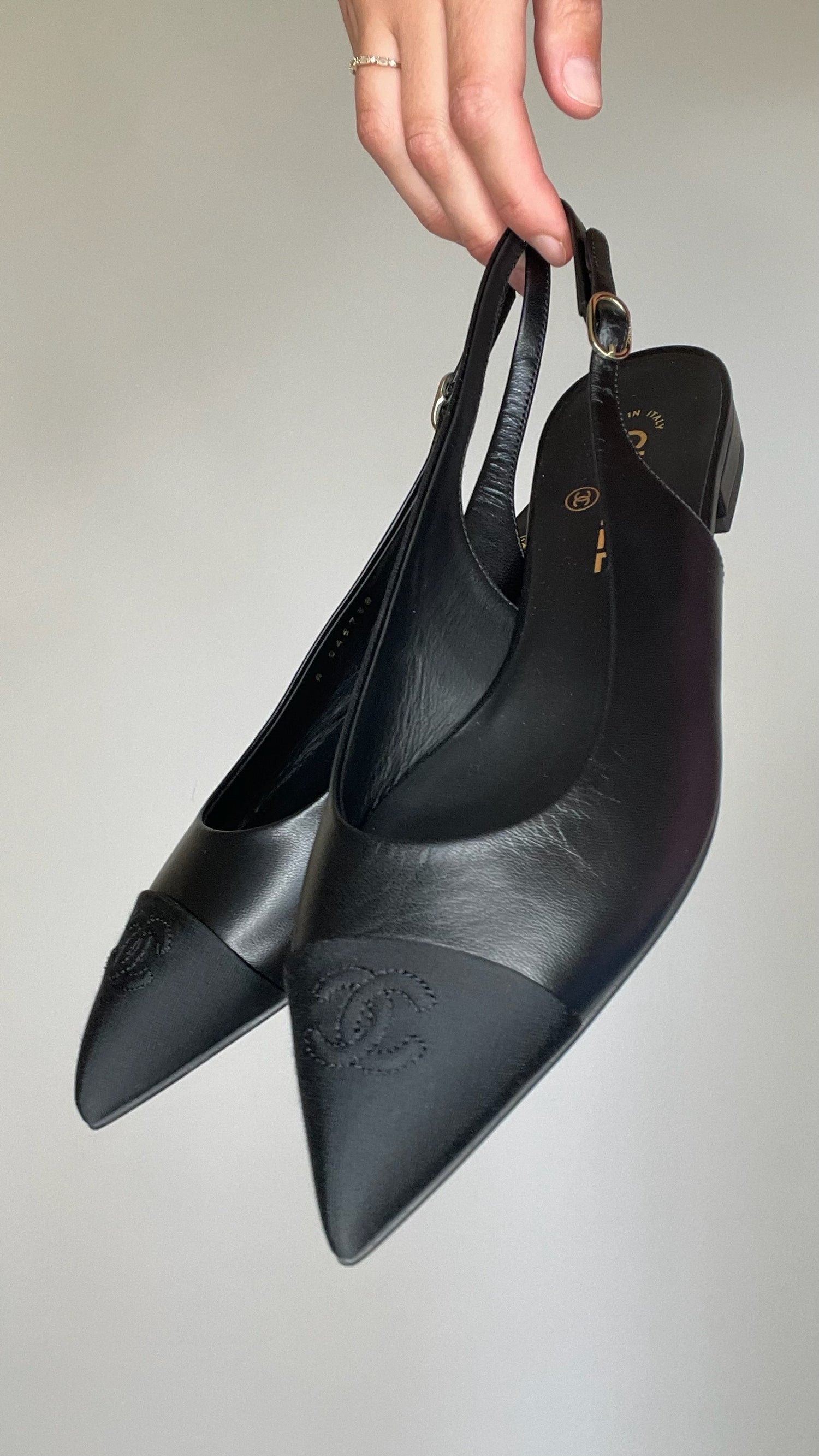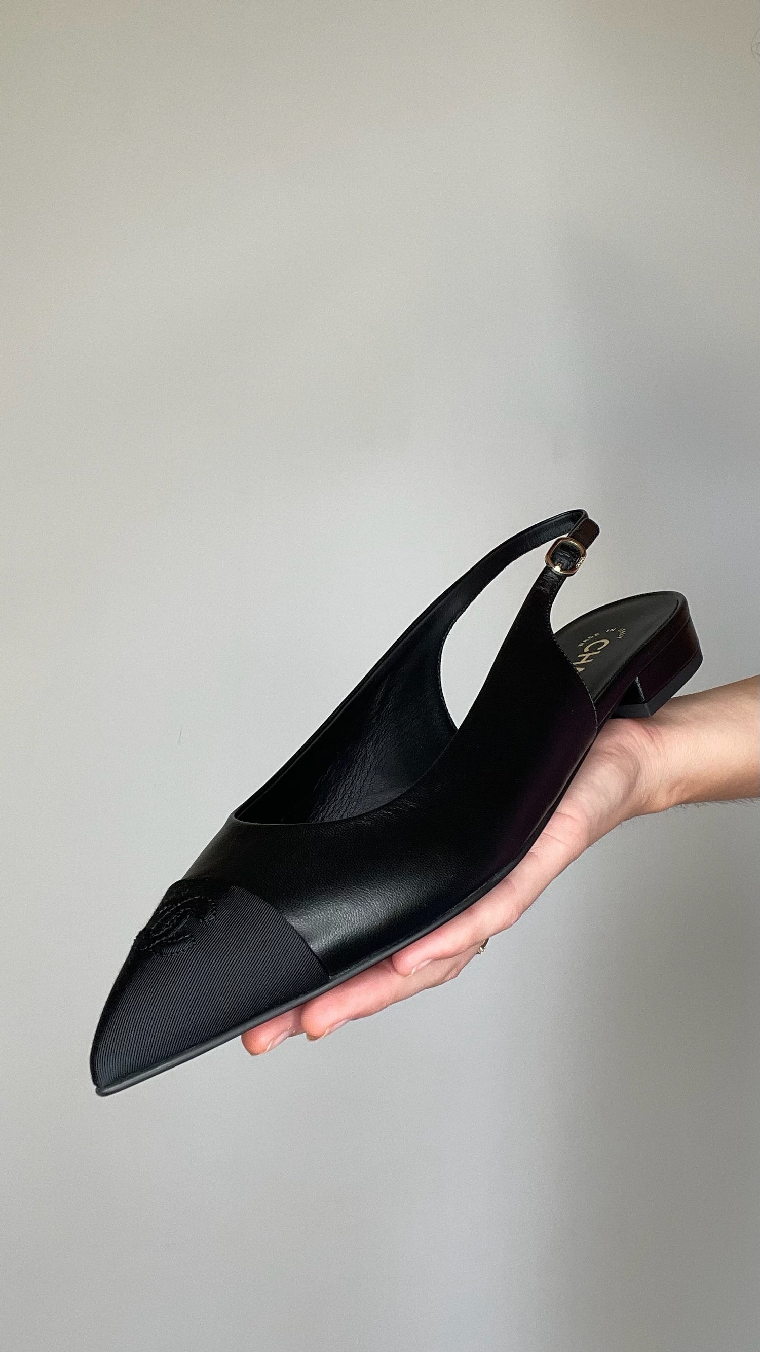 Chanel 2024 slingback shoes. Black logo on grosgrain and lambskin. Designer size 39.5