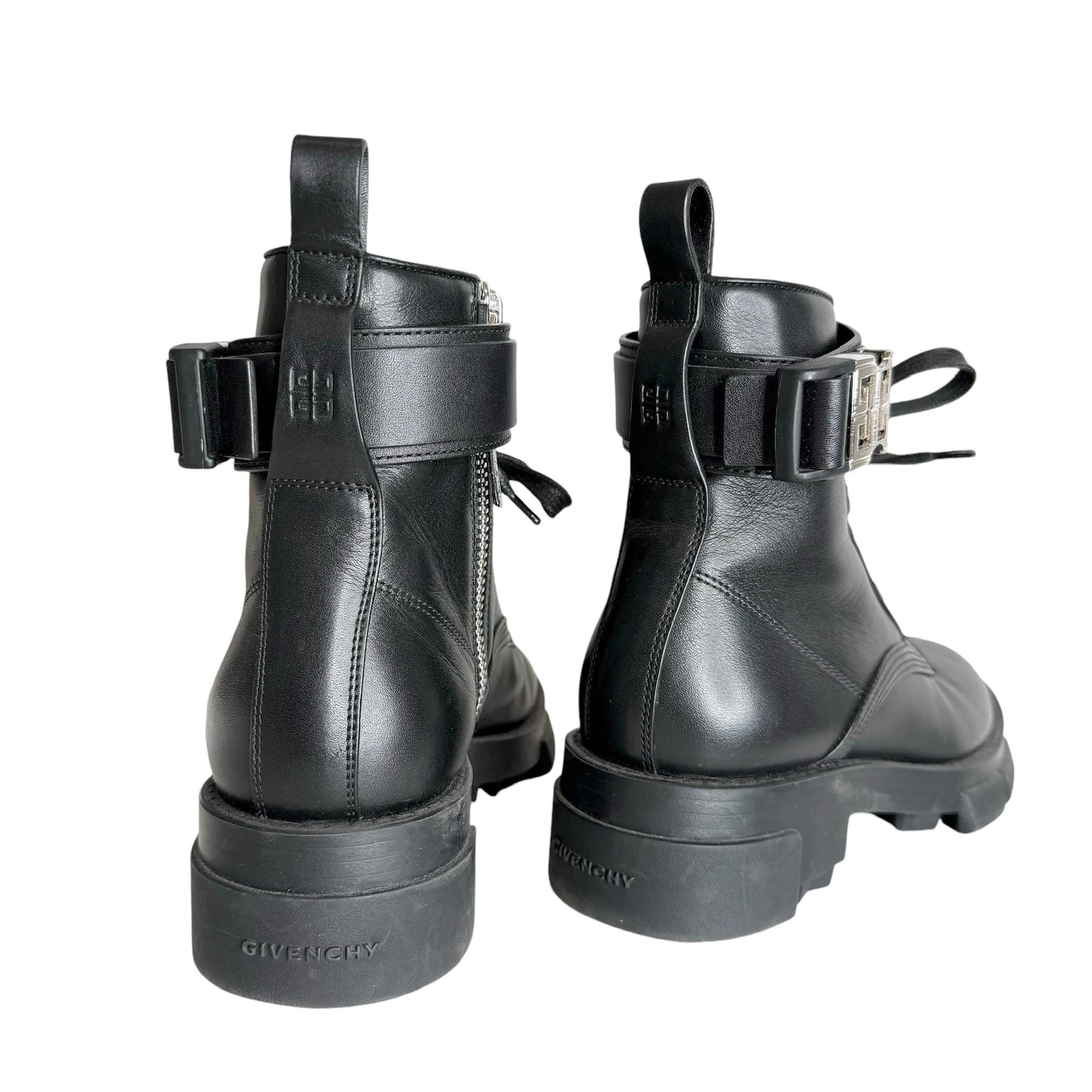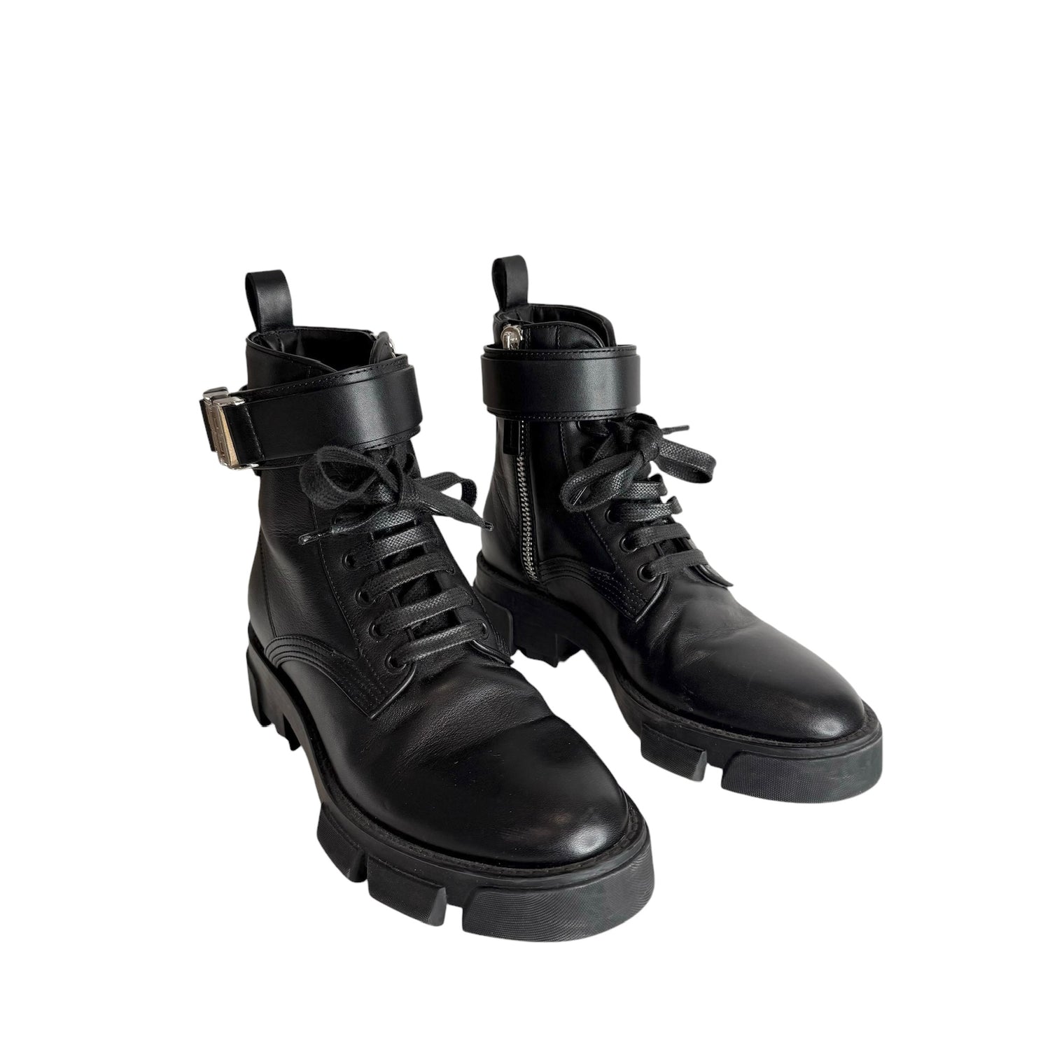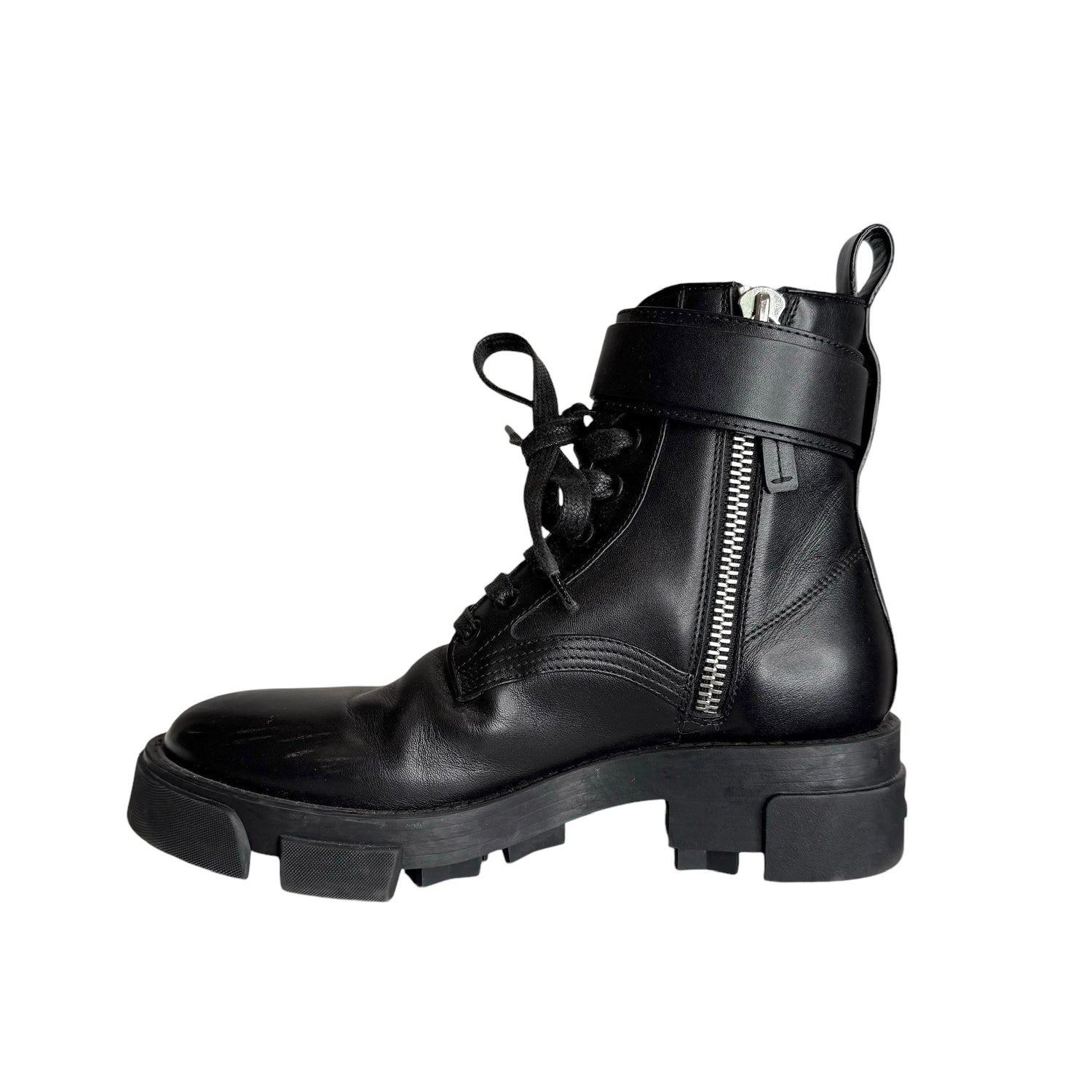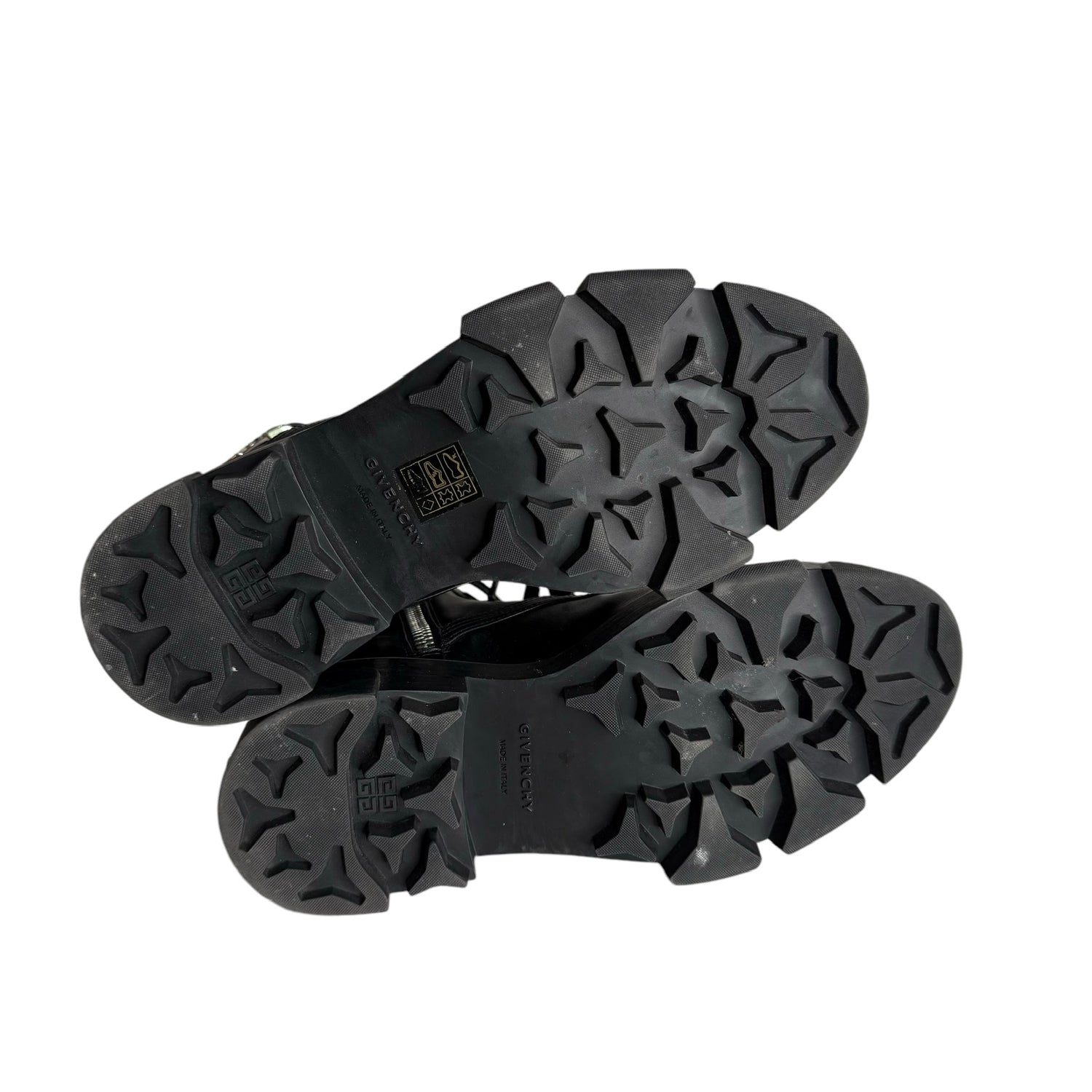 Givenchy black combat boots. Silver logo at ankle. Laces on top. Round toe. Black leather with black rubber outer soles. Designer size 36.