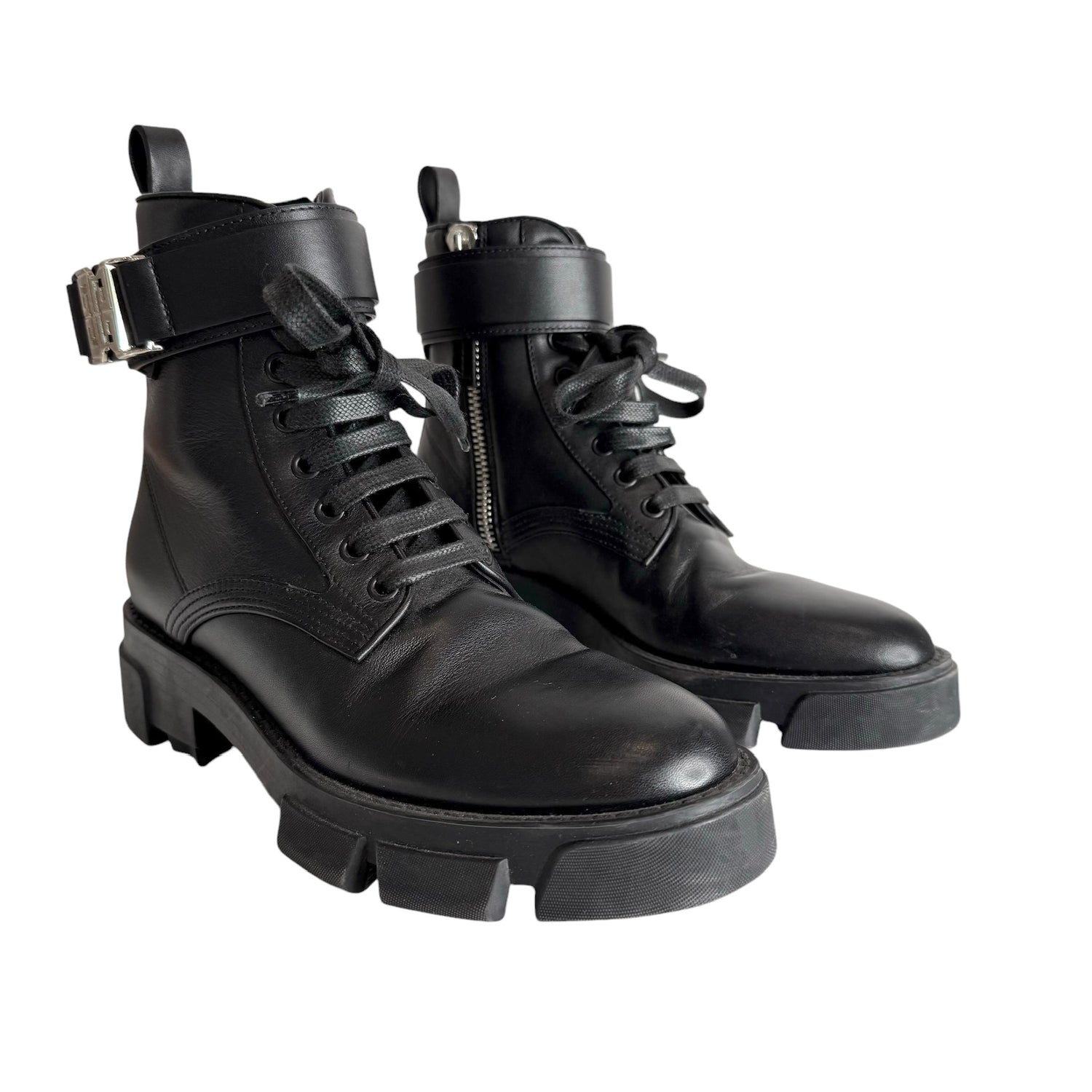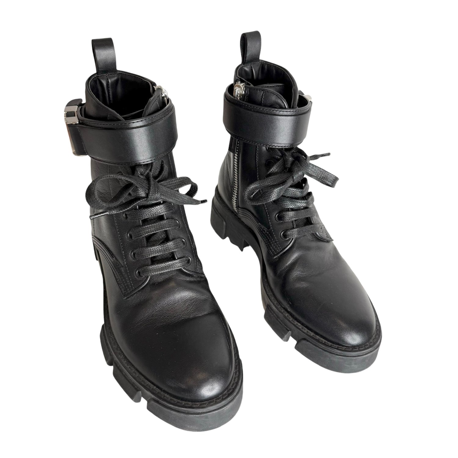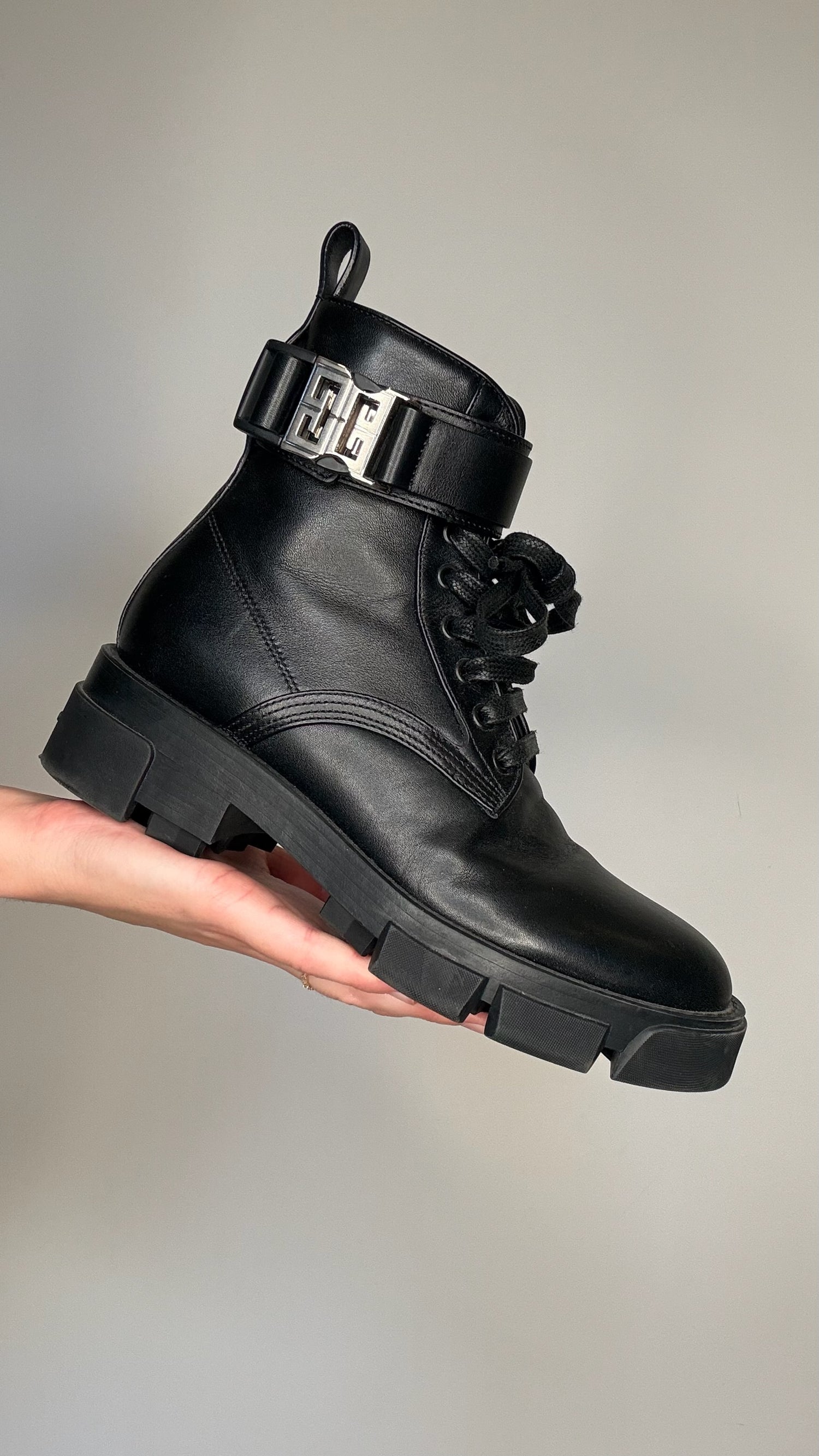 Givenchy black combat boots. Silver logo at ankle. Laces on top. Round toe. Black leather with black rubber outer soles. Designer size 36.