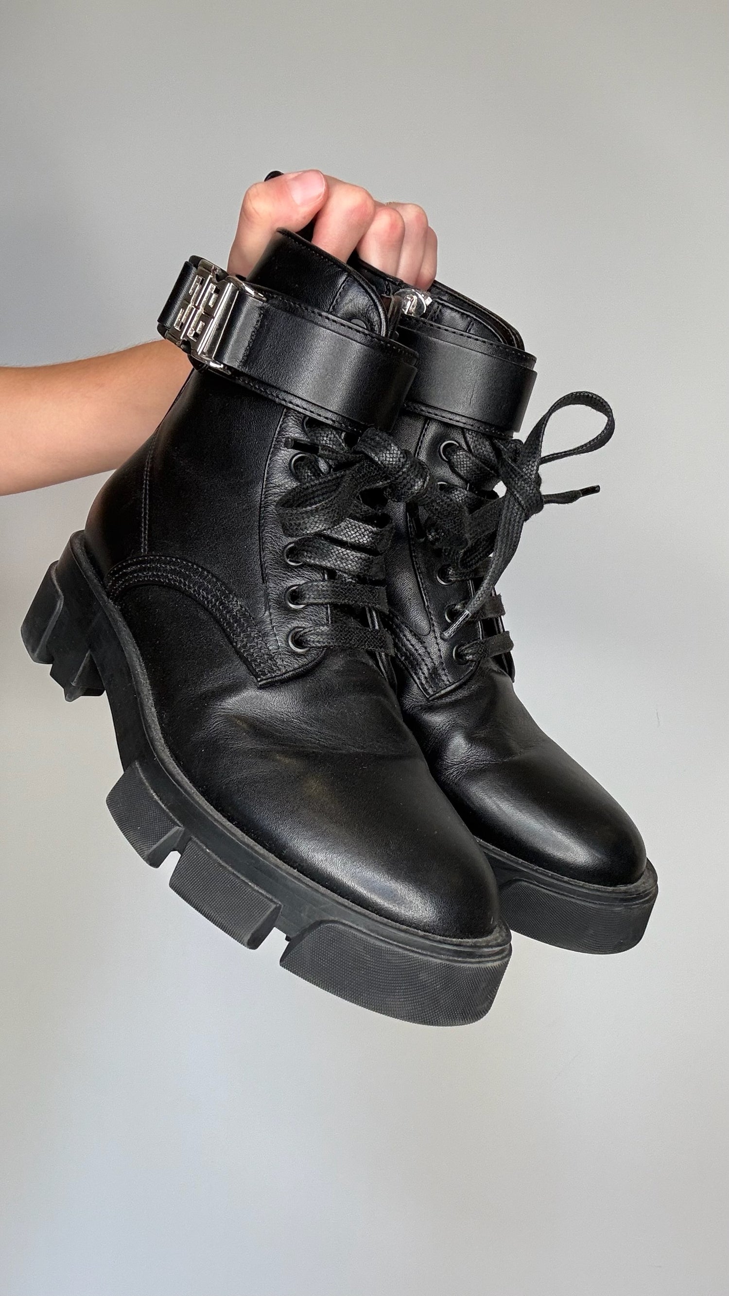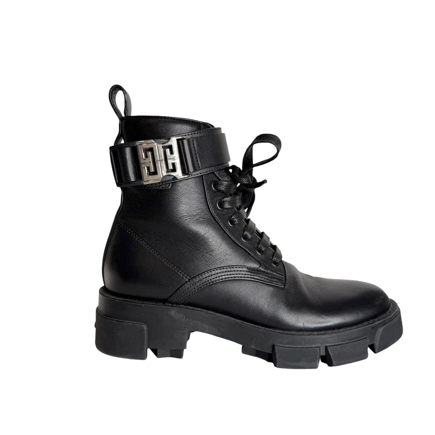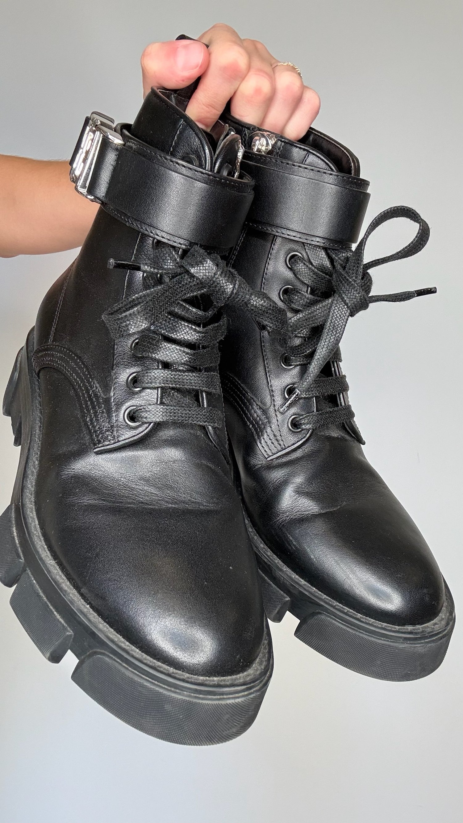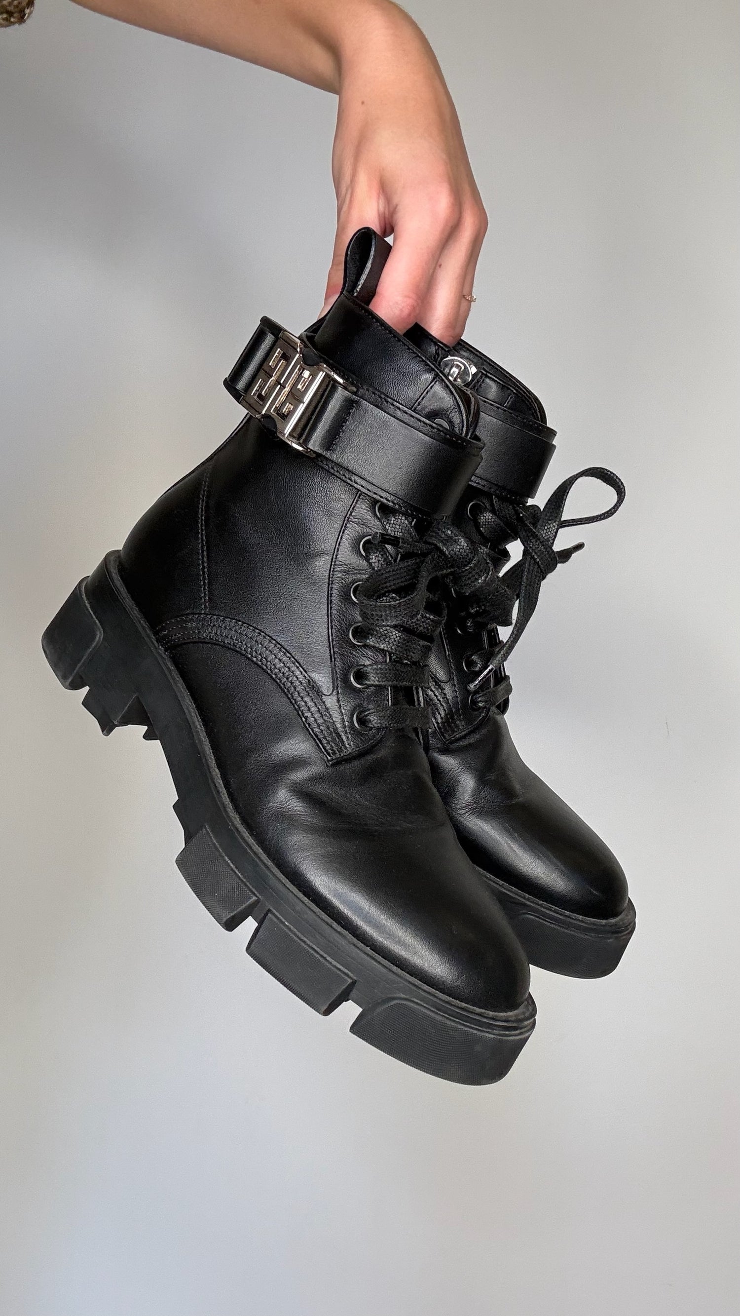 Givenchy black combat boots. Silver logo at ankle. Laces on top. Round toe. Black leather with black rubber outer soles. Designer size 36.