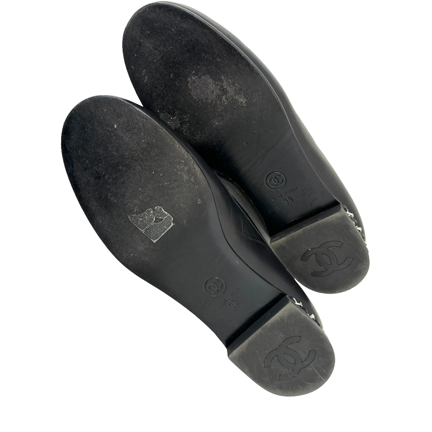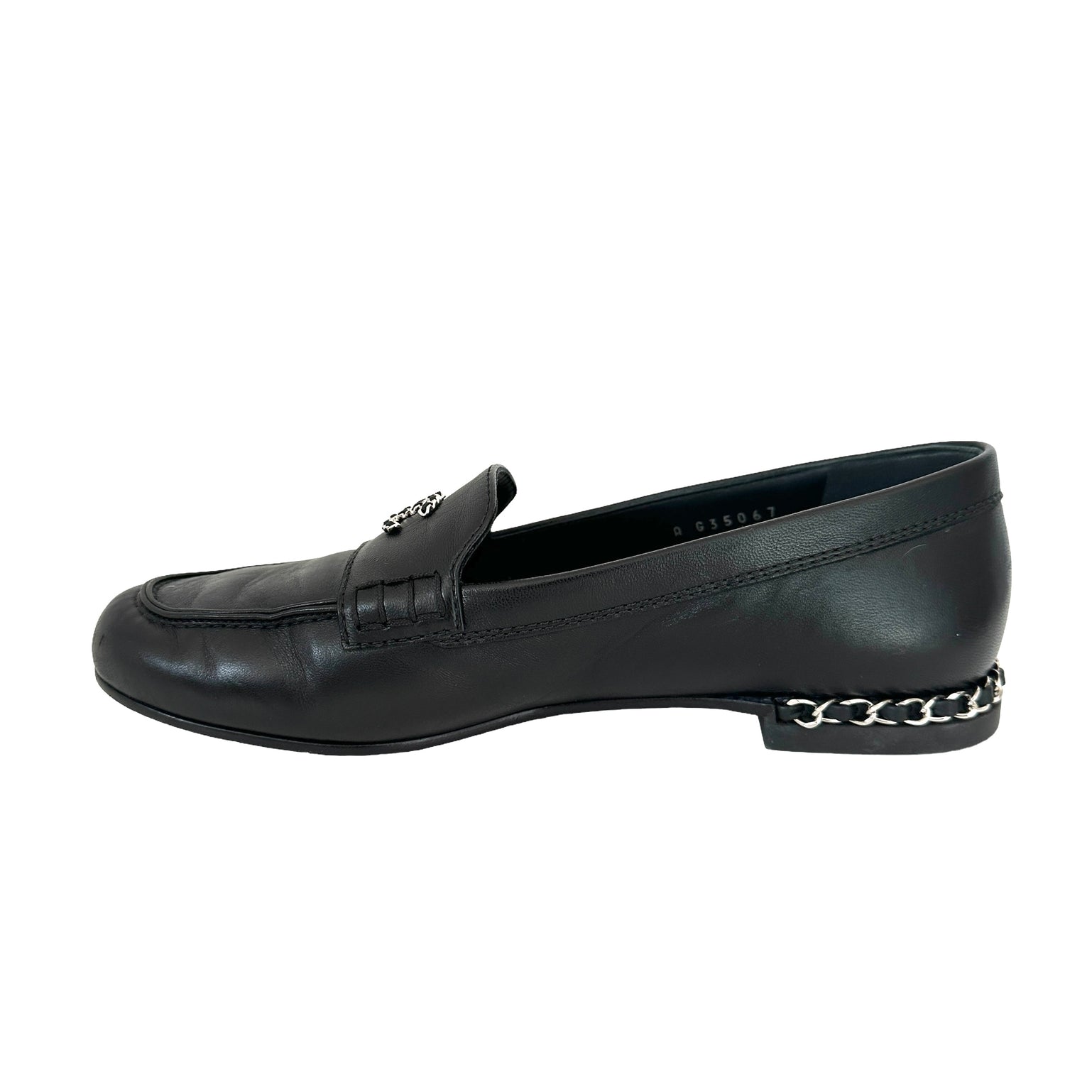 Chanel black leather loafers. Silver CC logo and chain details. Designer size 38.