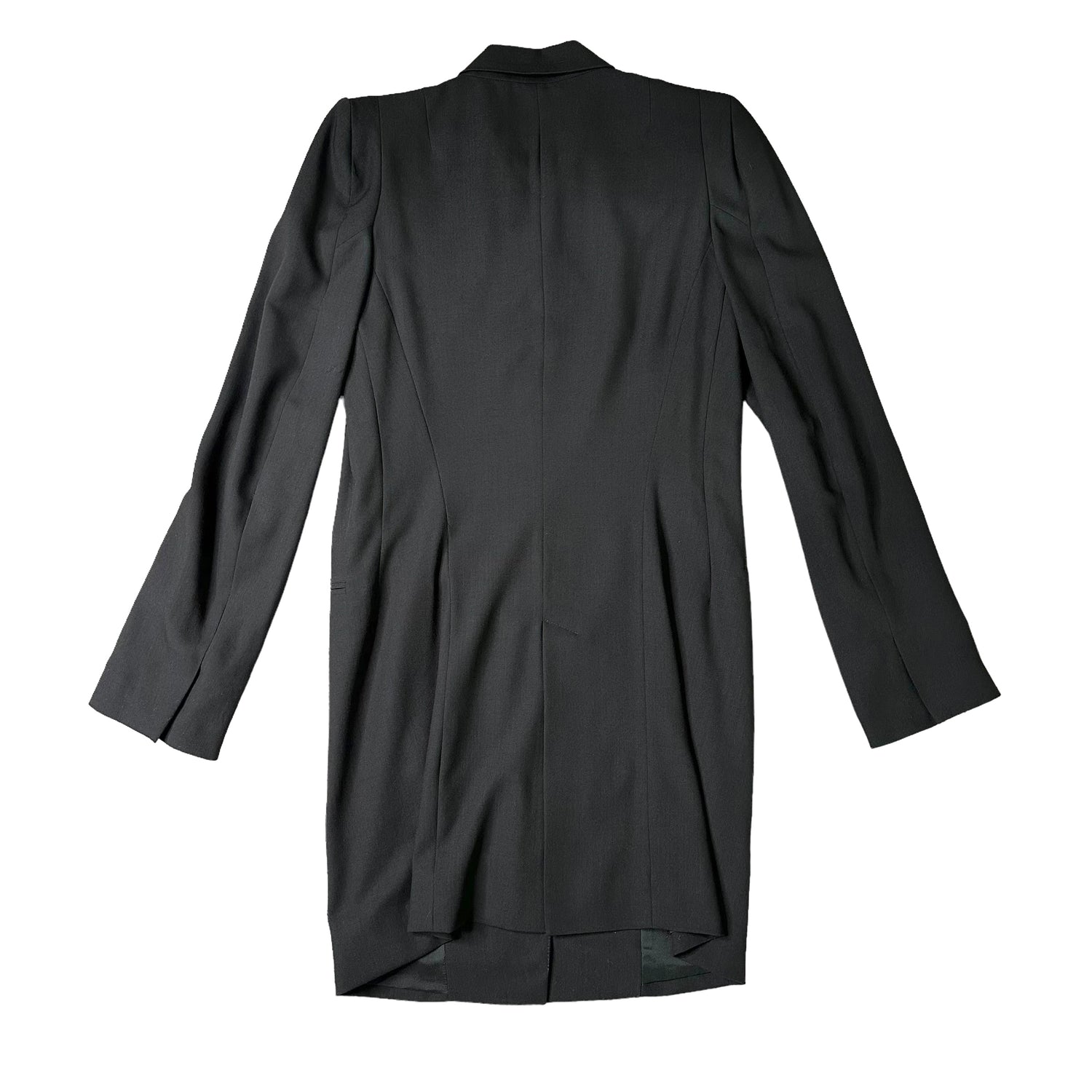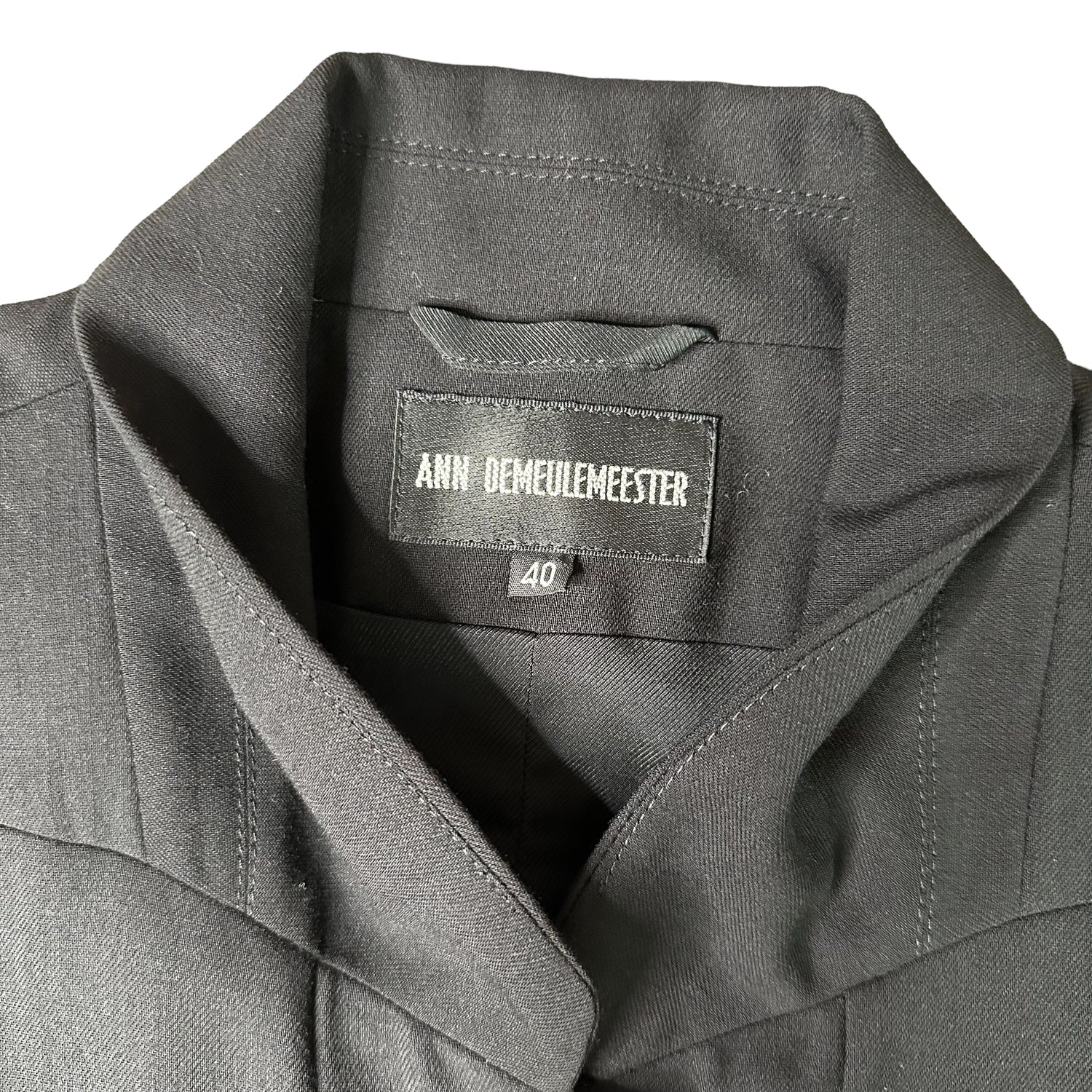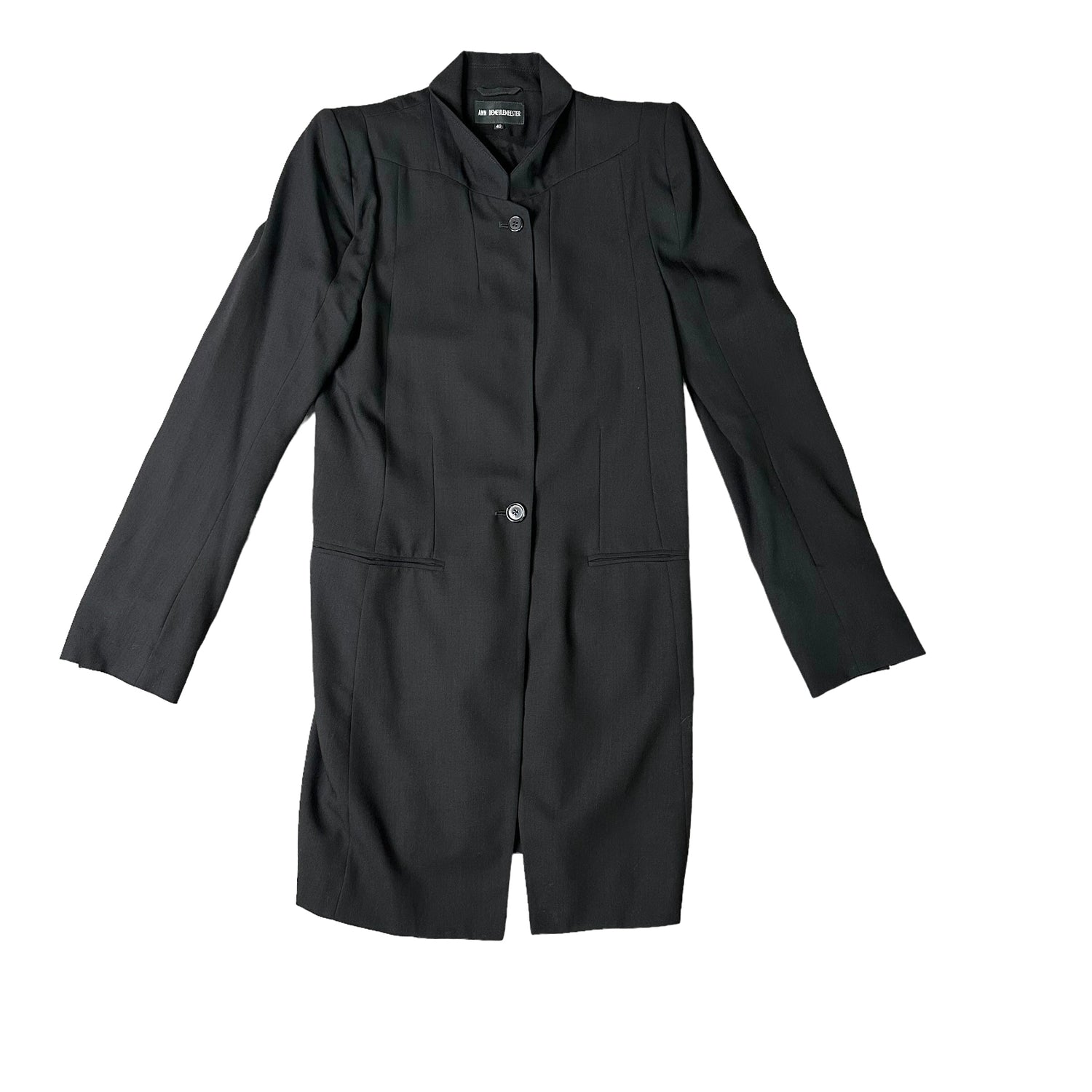 Ann Demeulemeester black long blazer jacket. Stand alone collar. Button closure at front. Designer size 40.