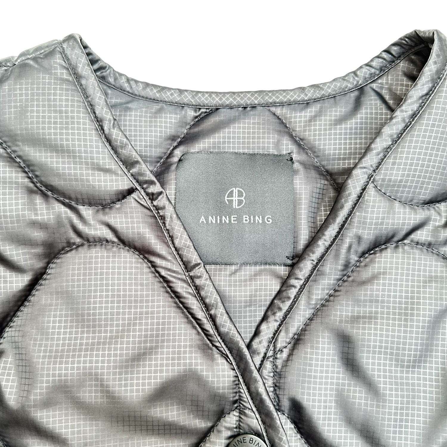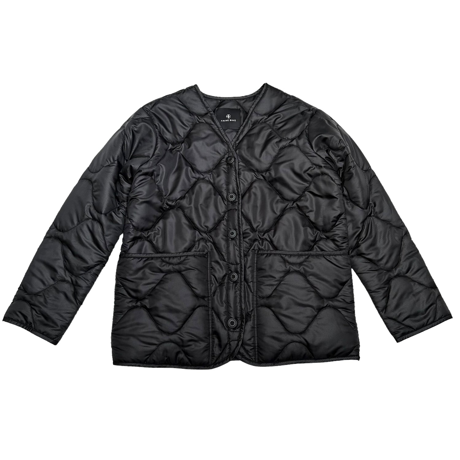 Anine Bing black lightweight jacket. Button closure at front. Collarless. Two patch pockets. Great in between season jacket to be comfortable and remain stylish. Designer size XXS.