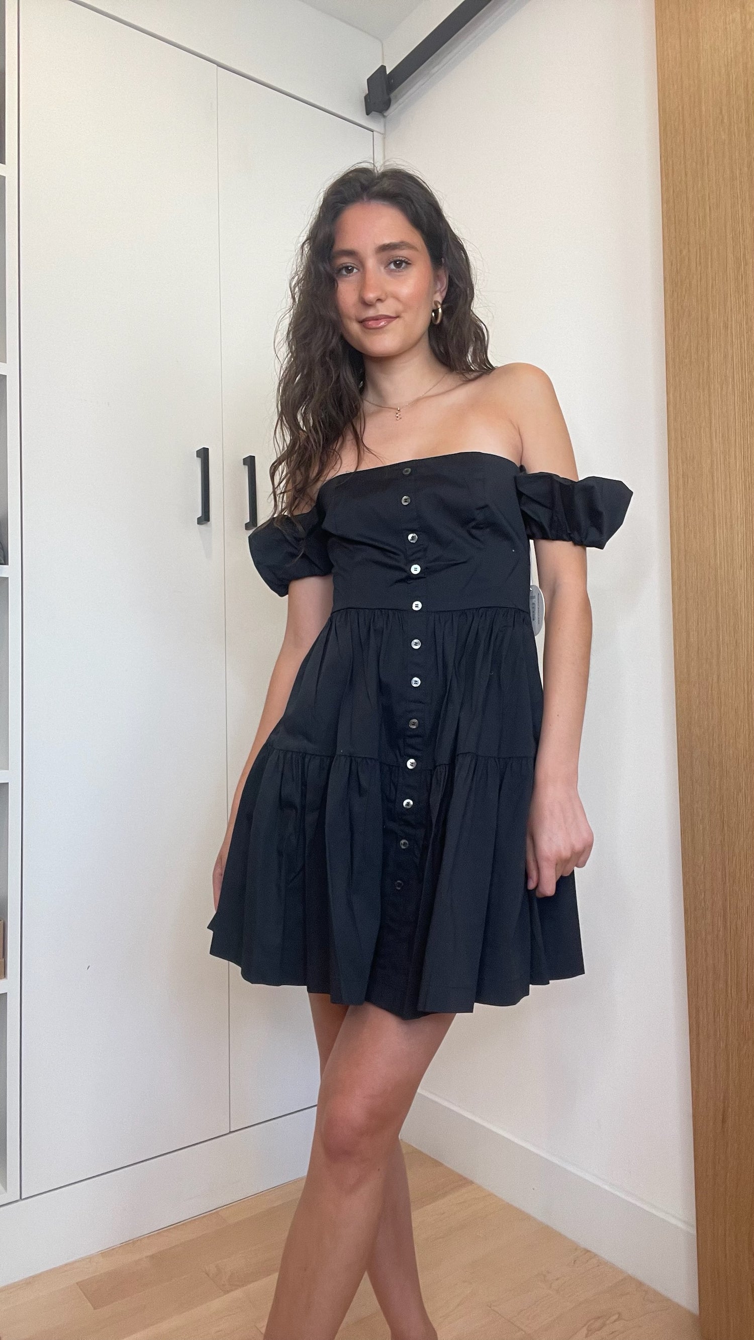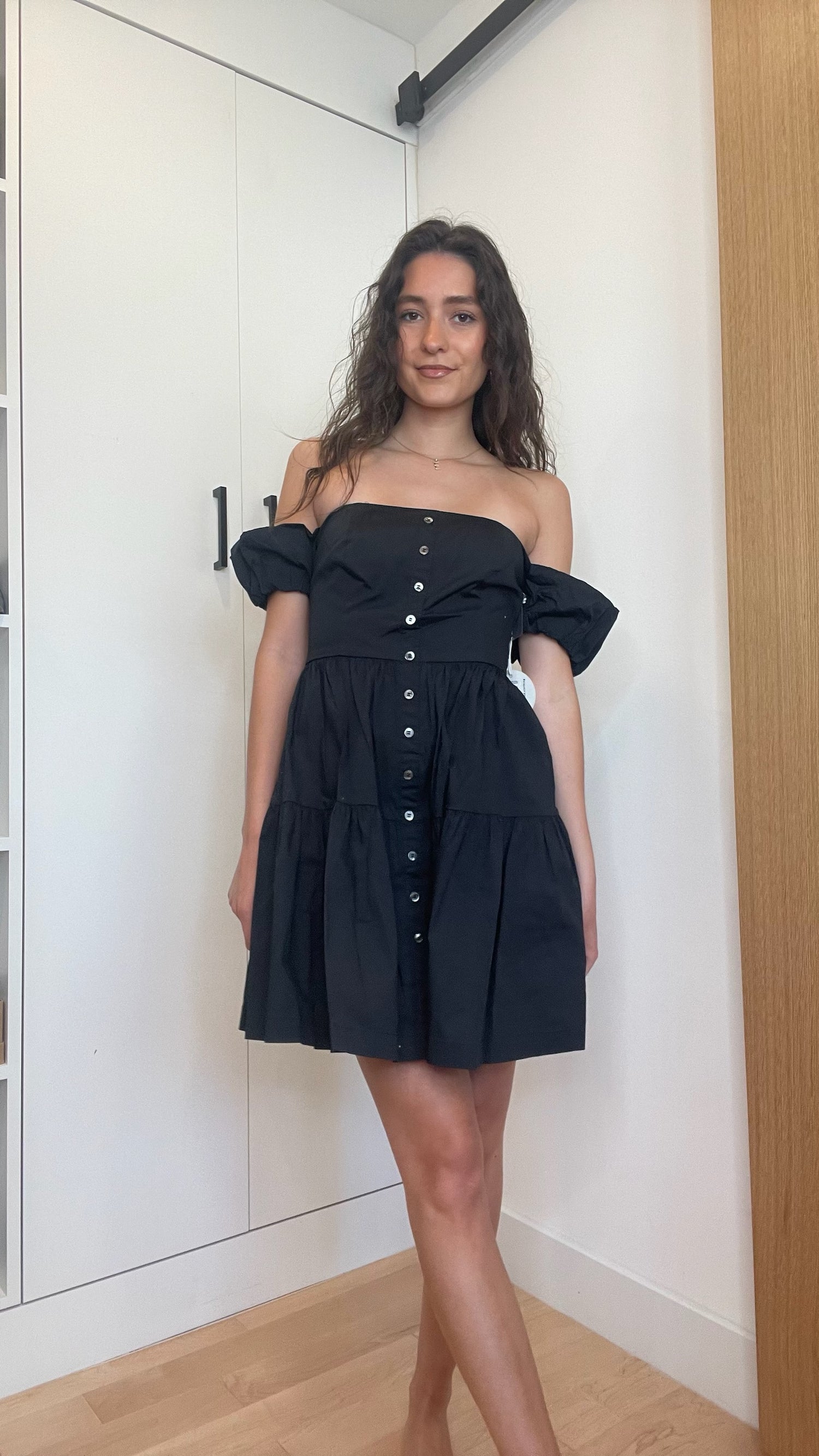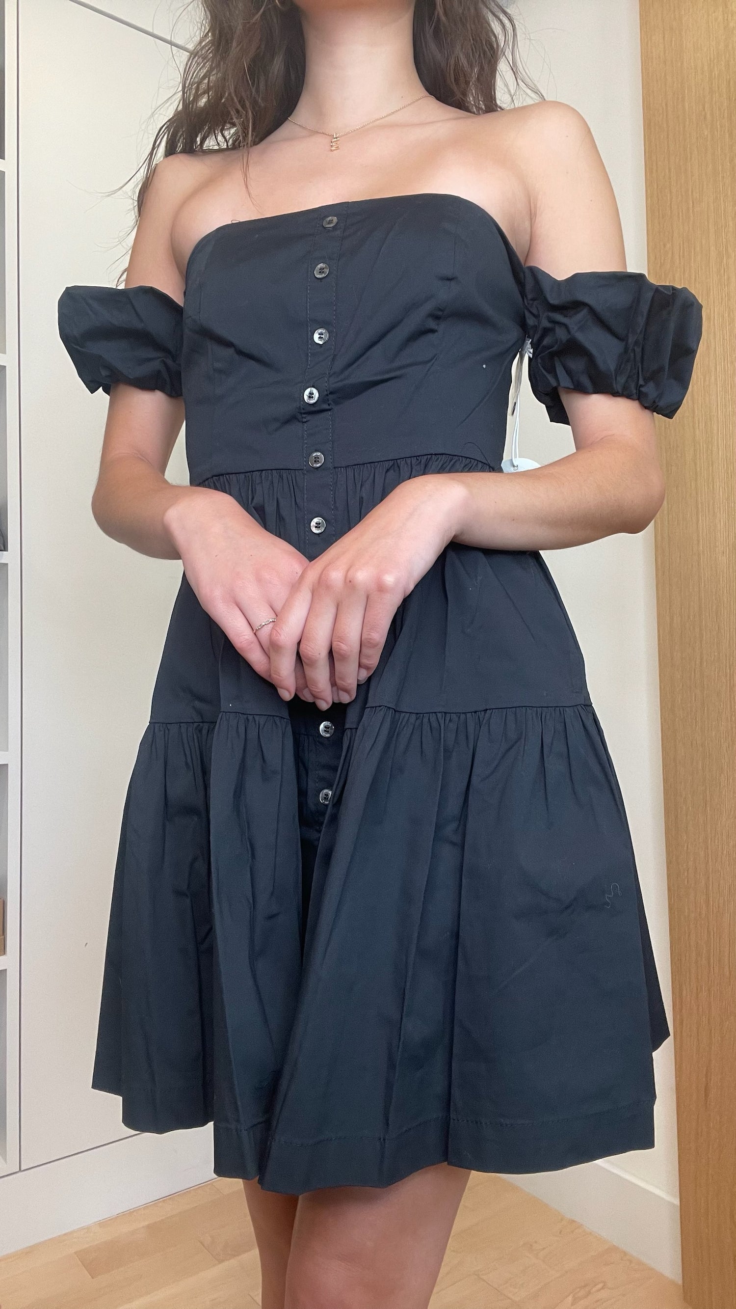 Staud black dress. Off-shoulders. Button details at front. Concealed zipper at back. Designer size 6.