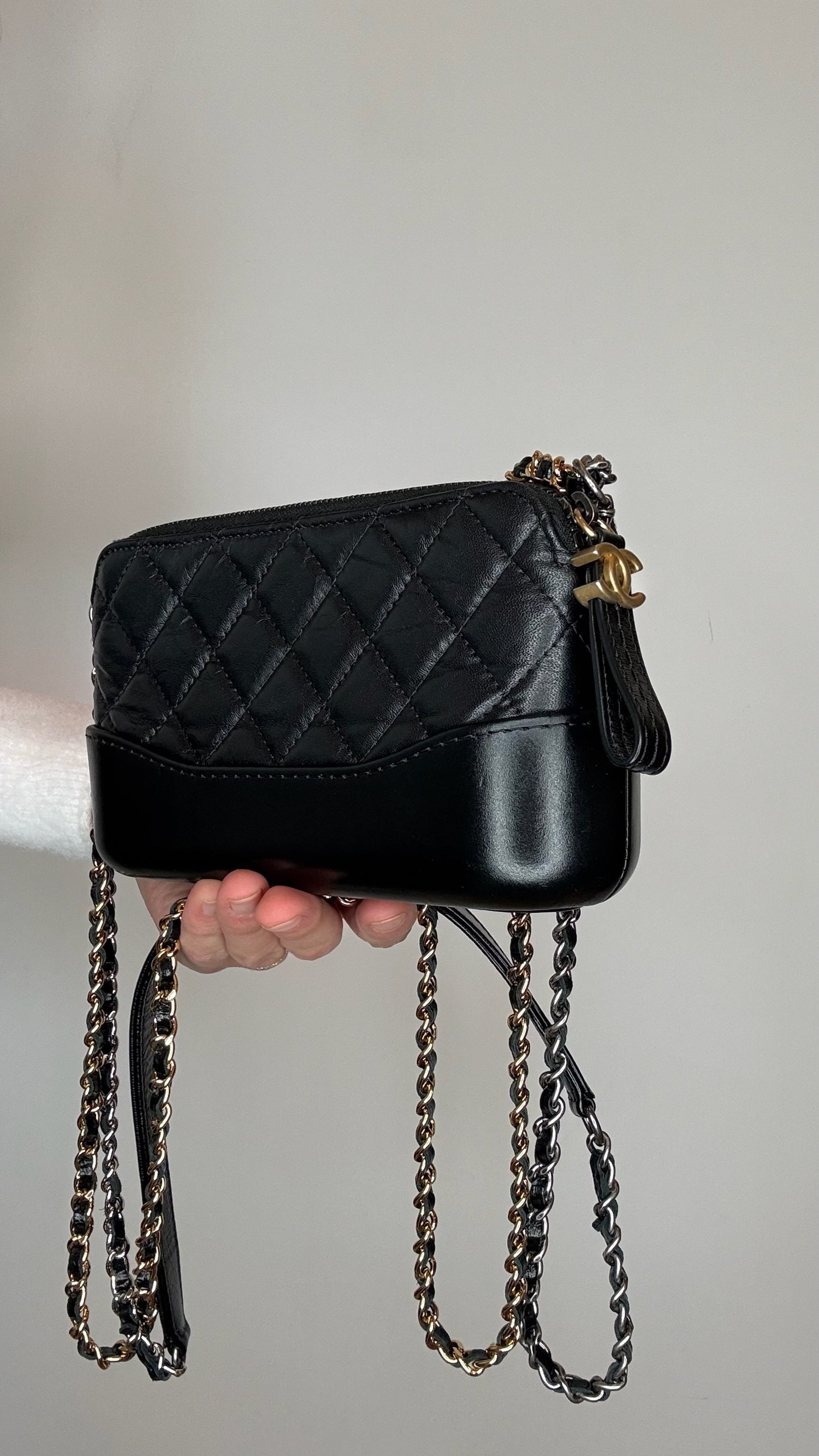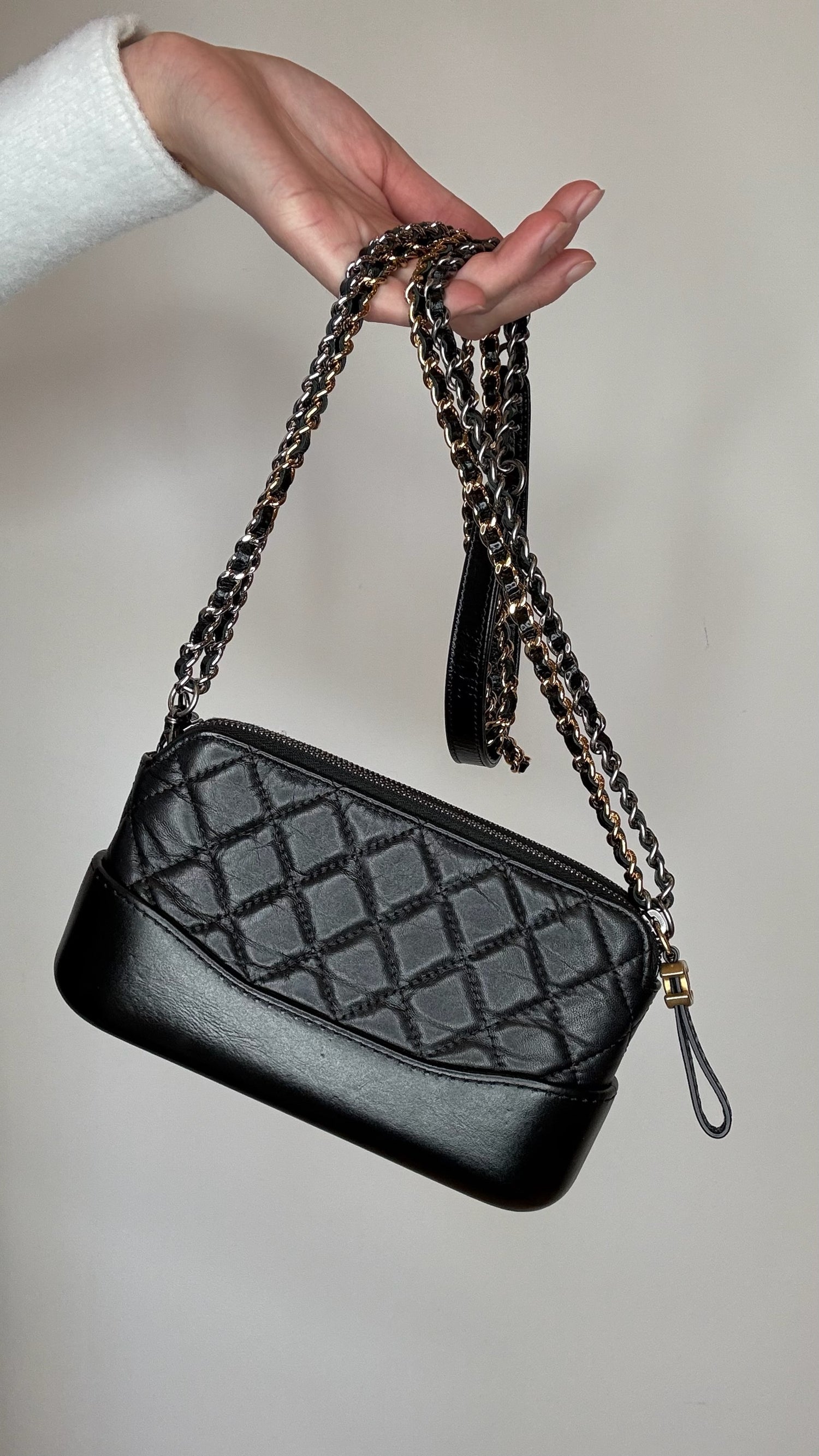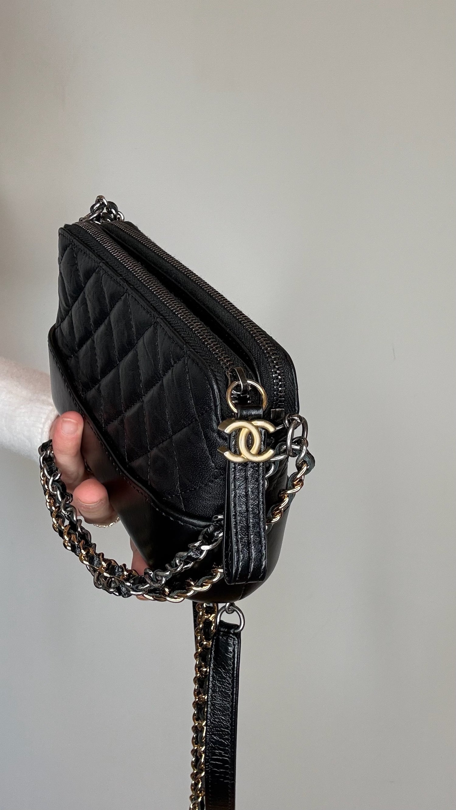 Chanel Gabrielle bag. Long crossbody strap. Silver and gold-tone hardware. Two zipper compartments with CC logo pull. One open compartment in the middle. Removable chain for a clutch look. Red grosgrain lining.