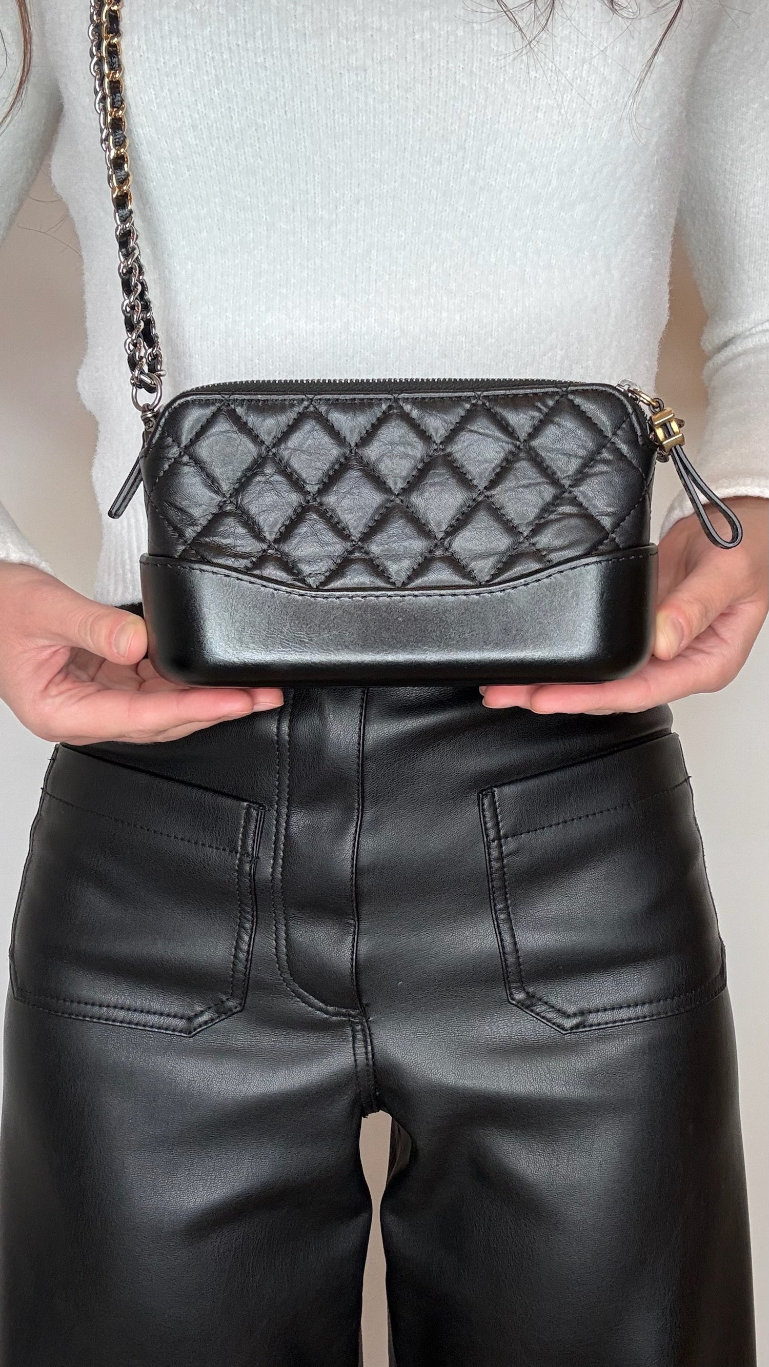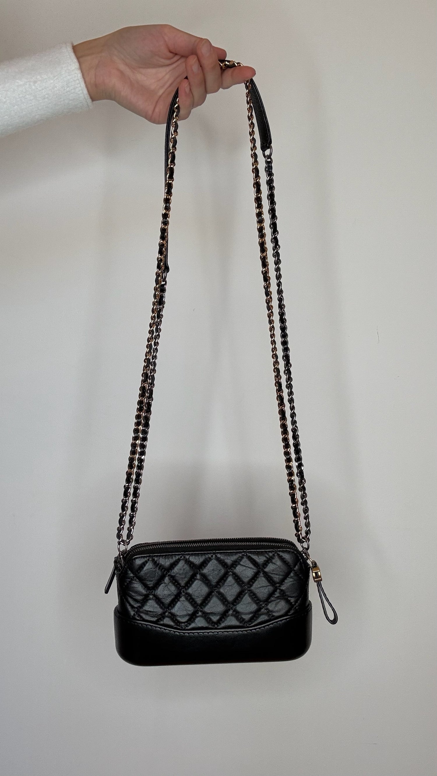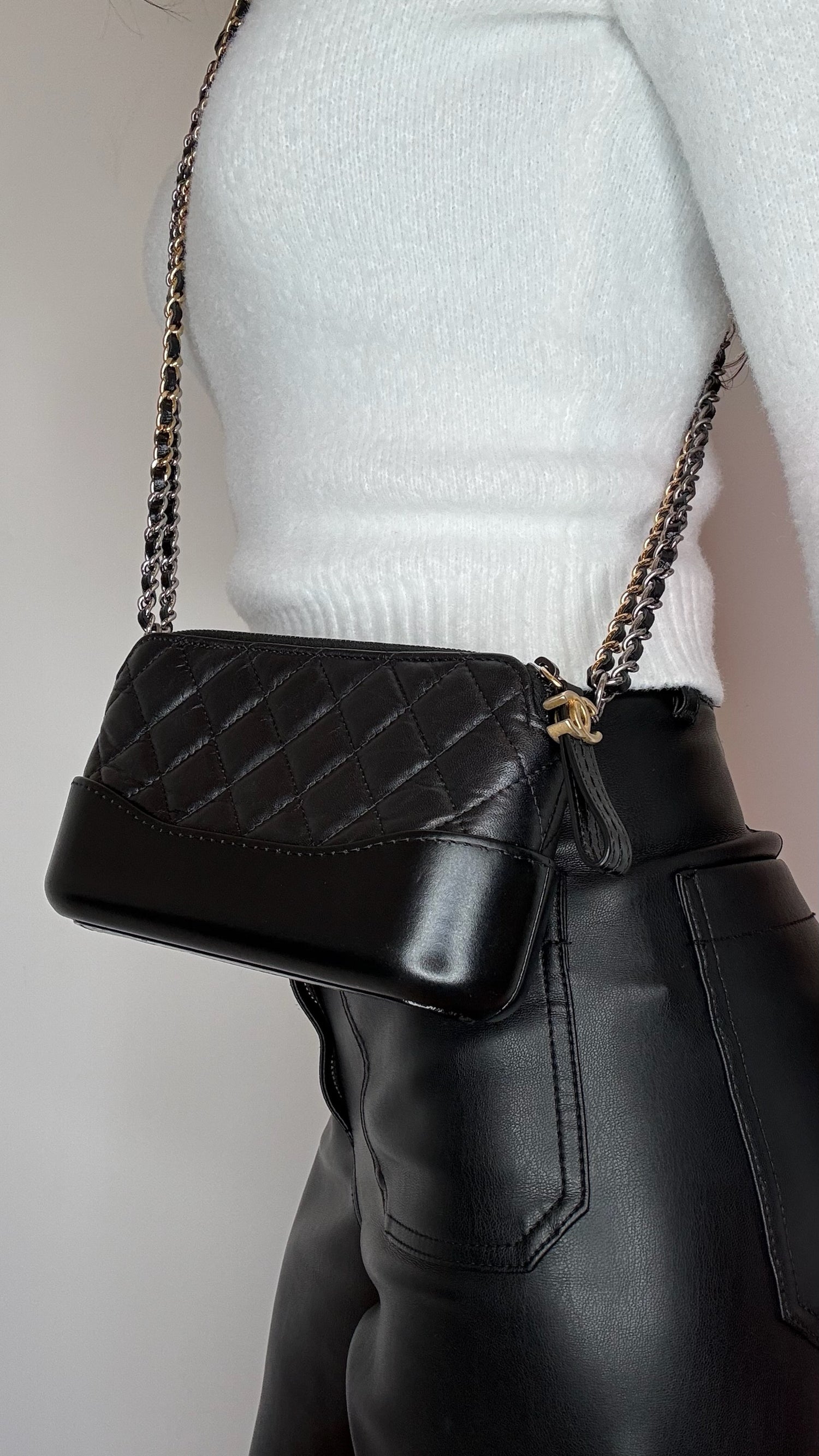 Chanel Gabrielle bag. Long crossbody strap. Silver and gold-tone hardware. Two zipper compartments with CC logo pull. One open compartment in the middle. Removable chain for a clutch look. Red grosgrain lining.