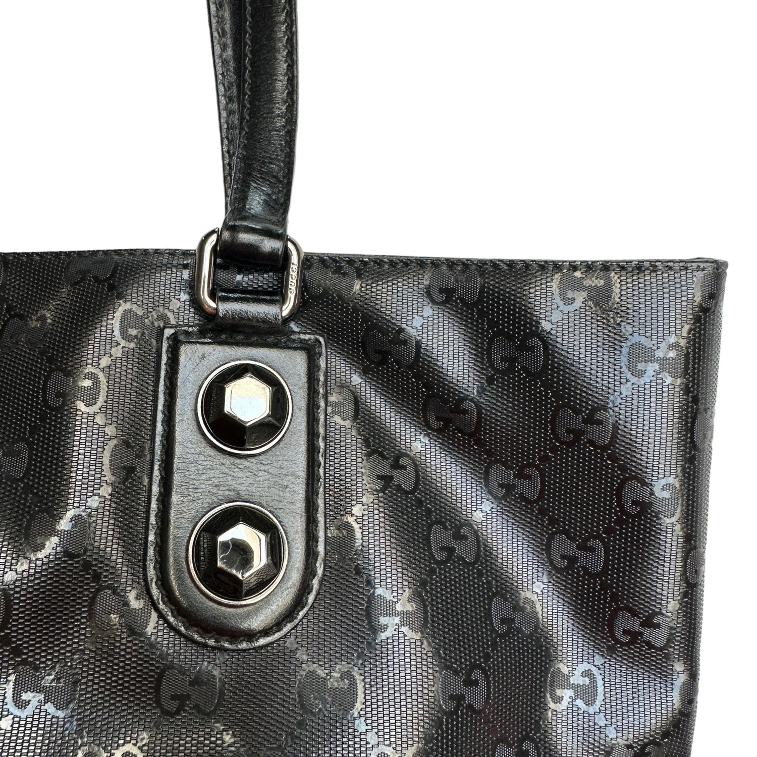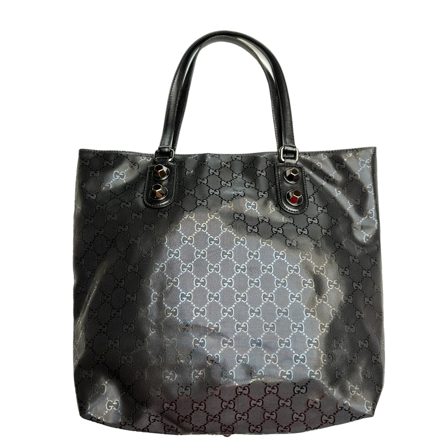 Gucci black coated monogram tote. Double flat handles. Black leather. Monogram shiny coated canvas. Gunmetal hardware. One interior zipper pocket.