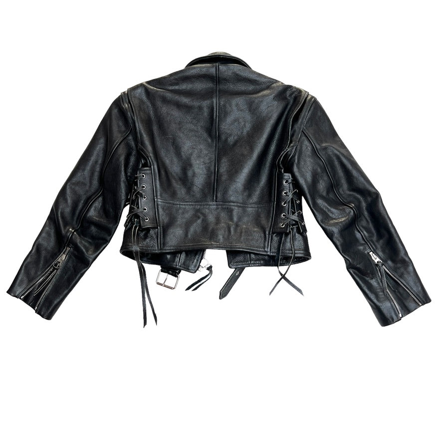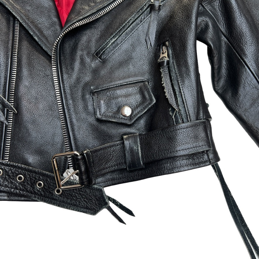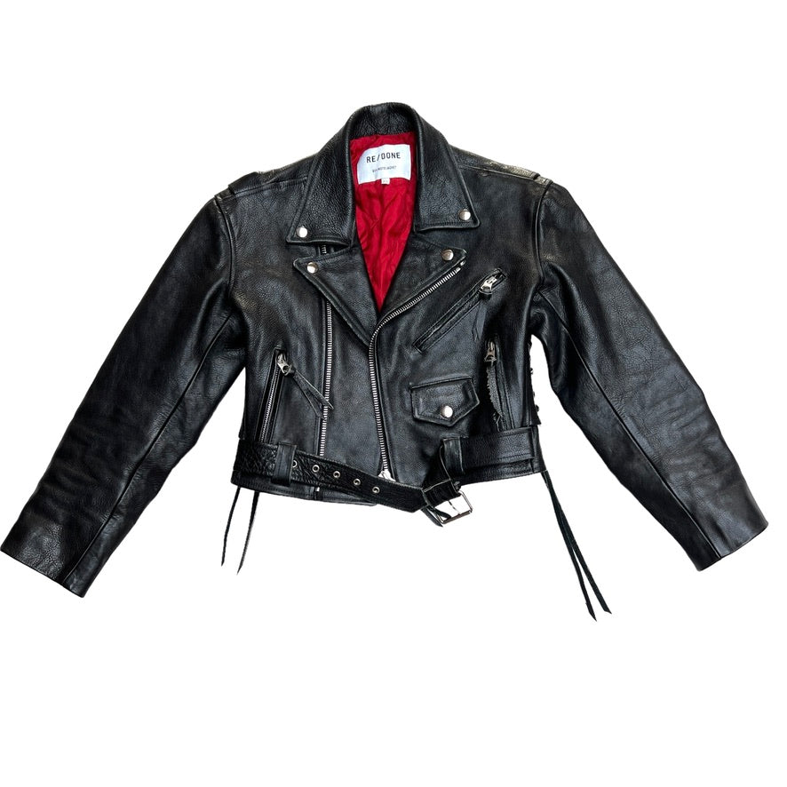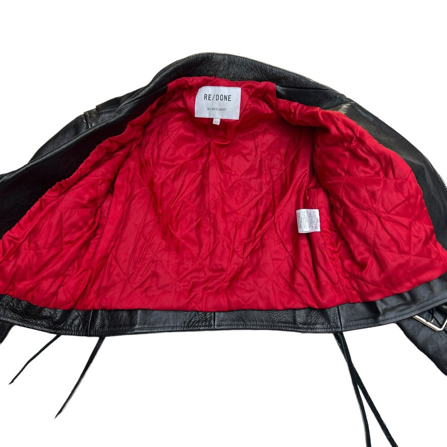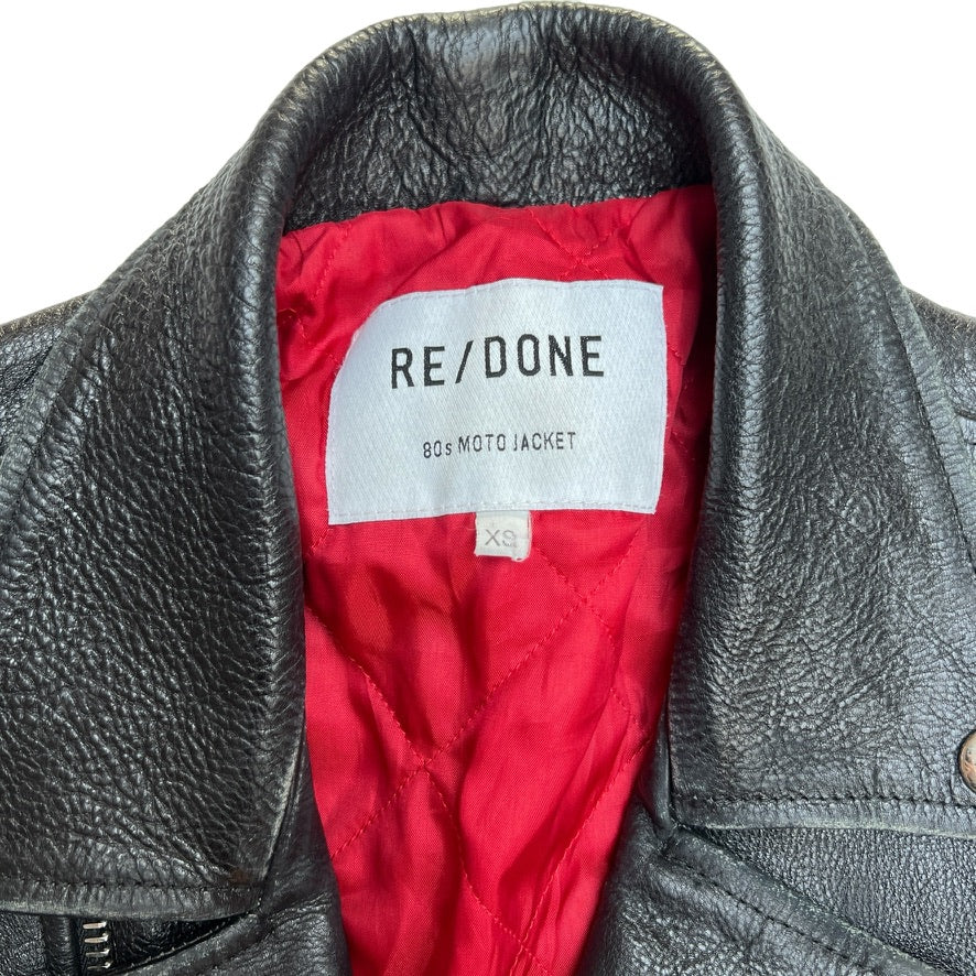 Redone 80s black moto leather jacket. Silver-tone hardware and zippers. Leather string details. Aged leather. Rock'n'roll red lining. Pockets. Pointed collar. Size XS.