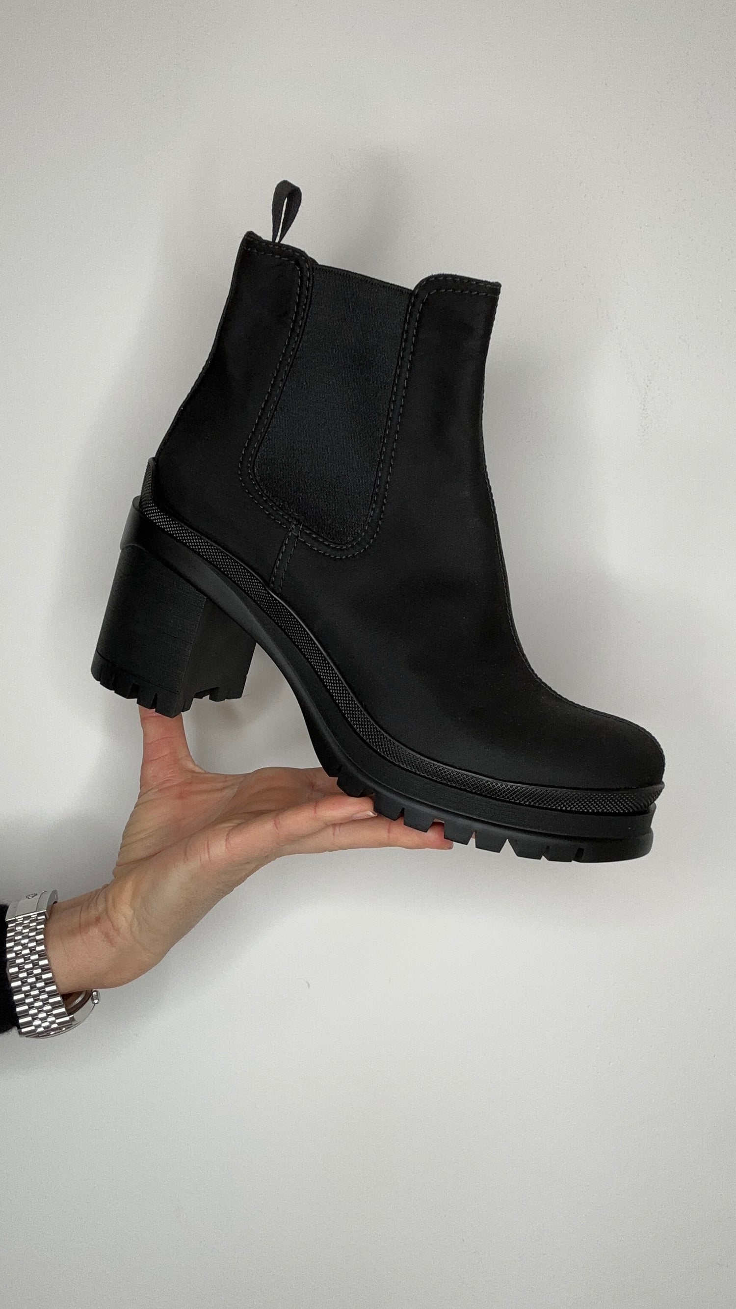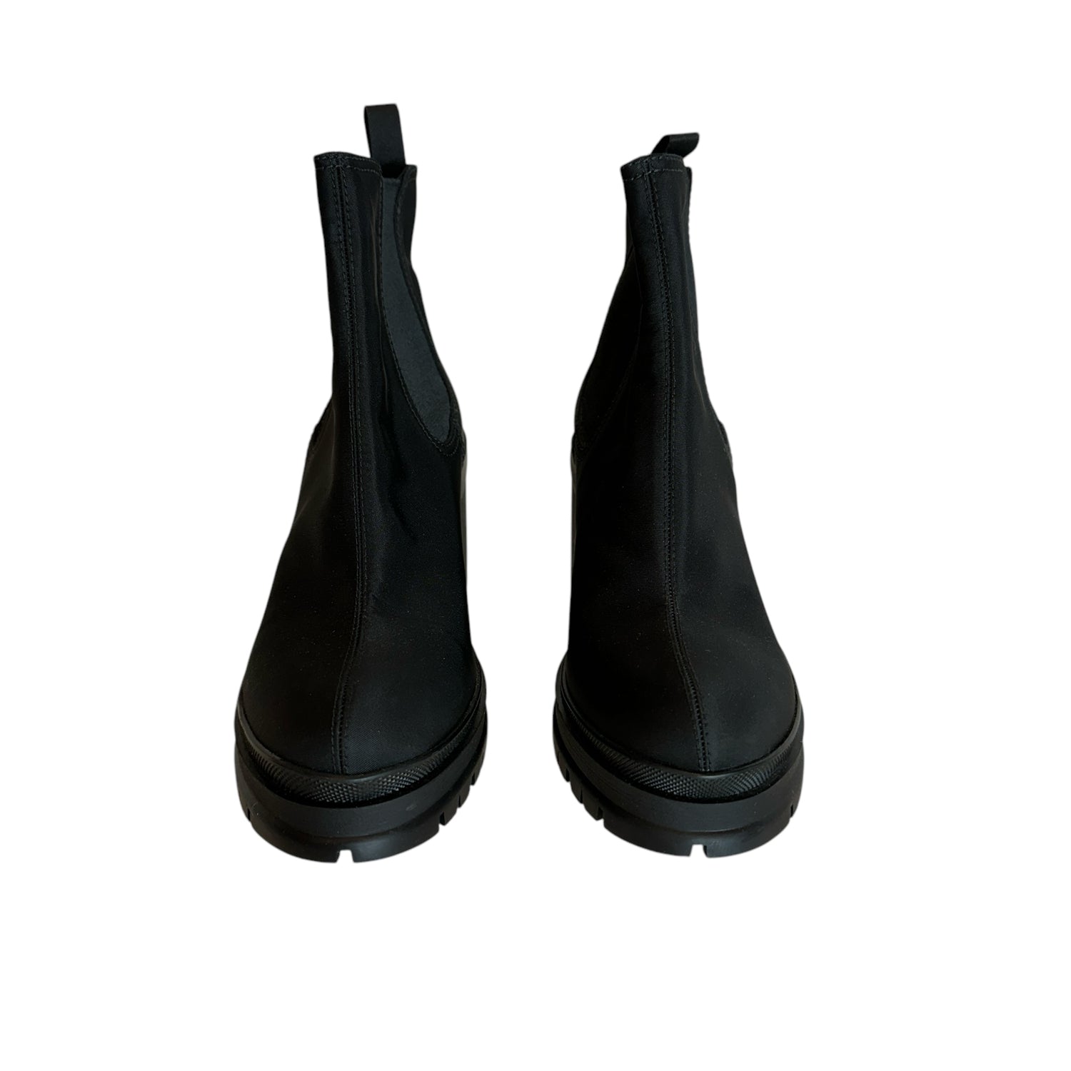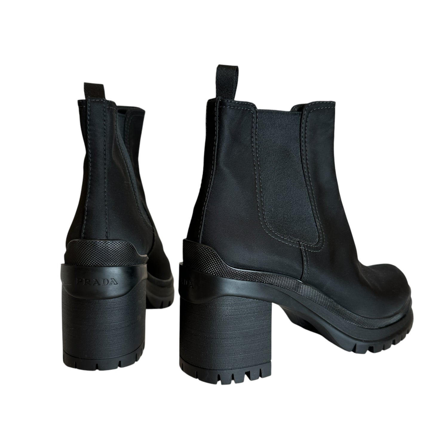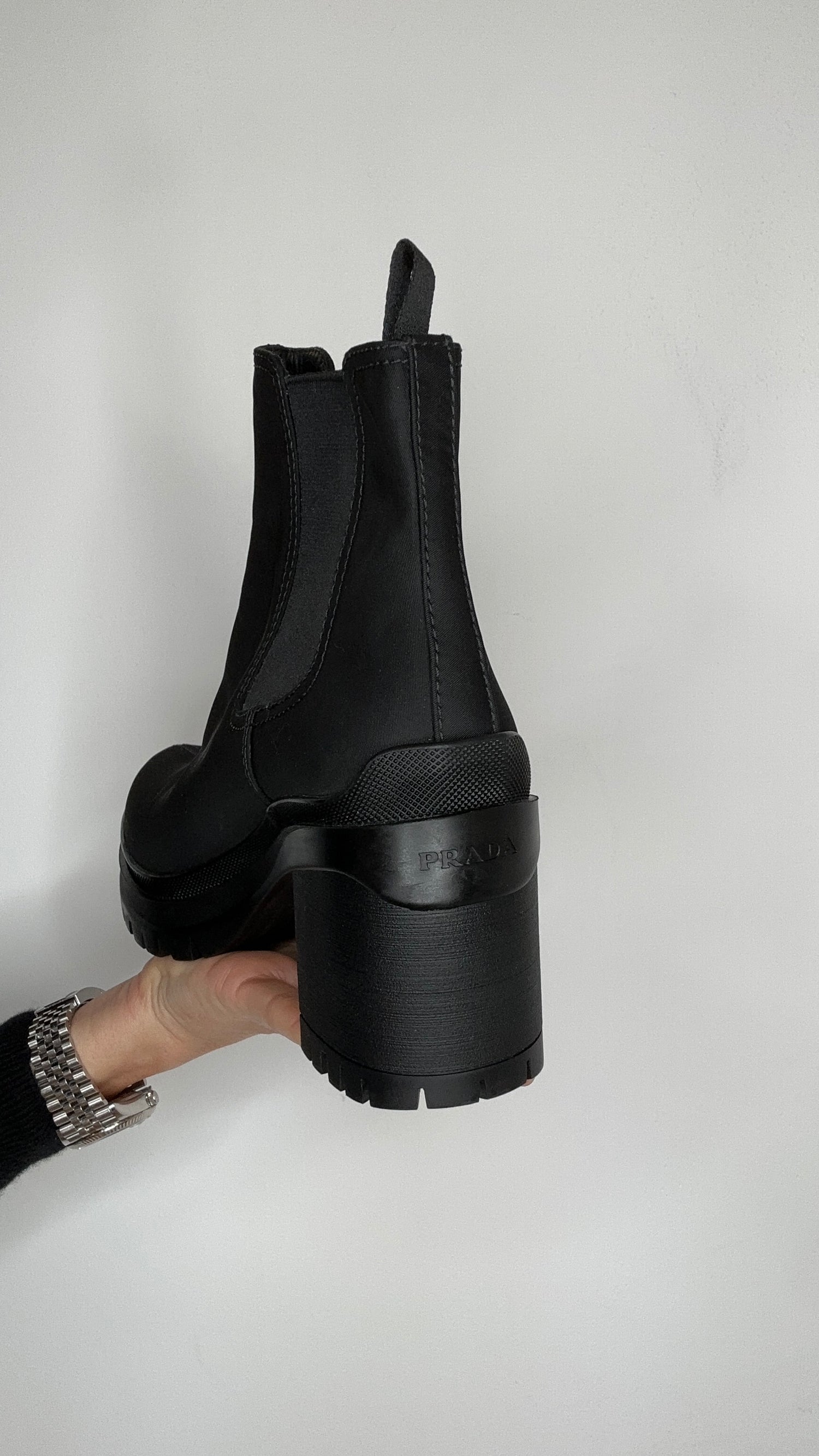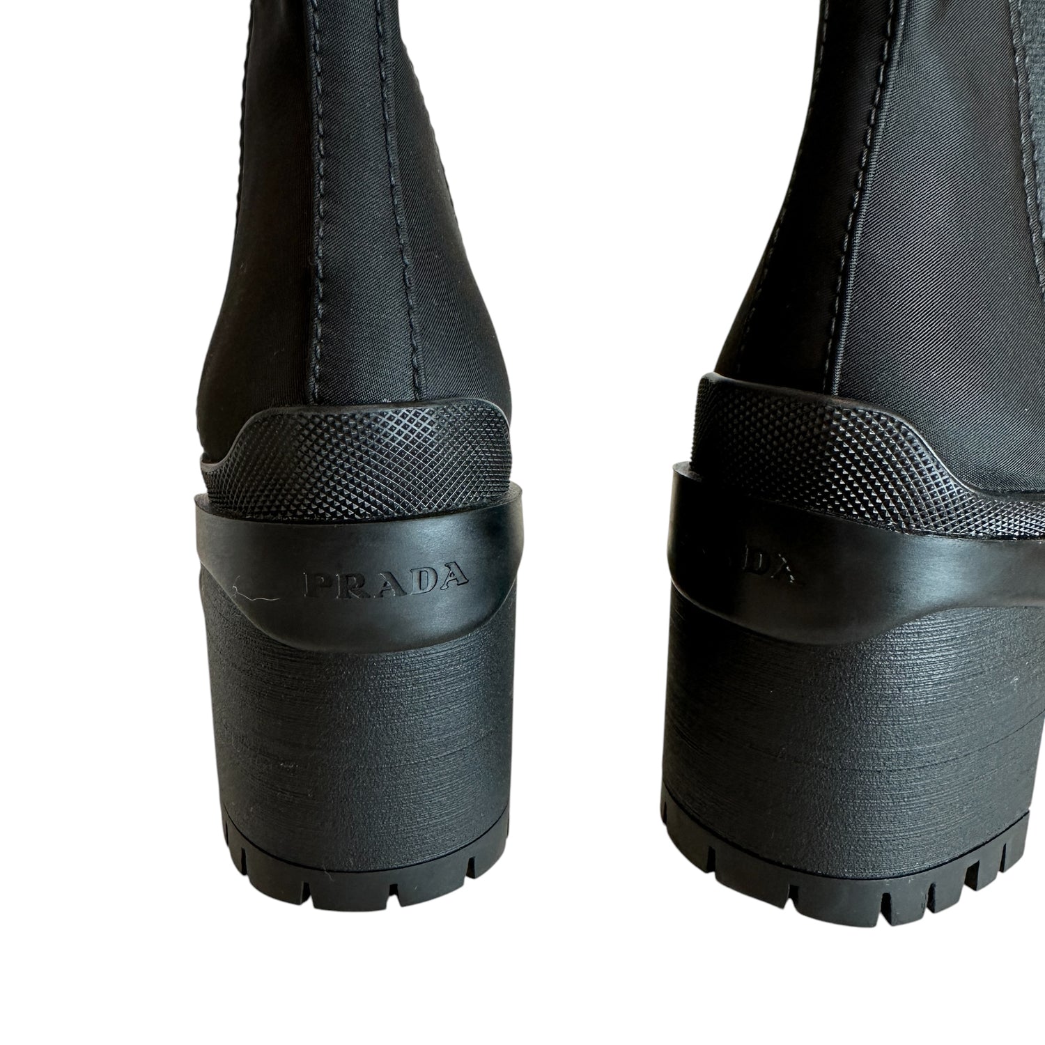 Prada black nylon boots. Chunky rubber heels with Prada logo at back. Designer size 38.5.