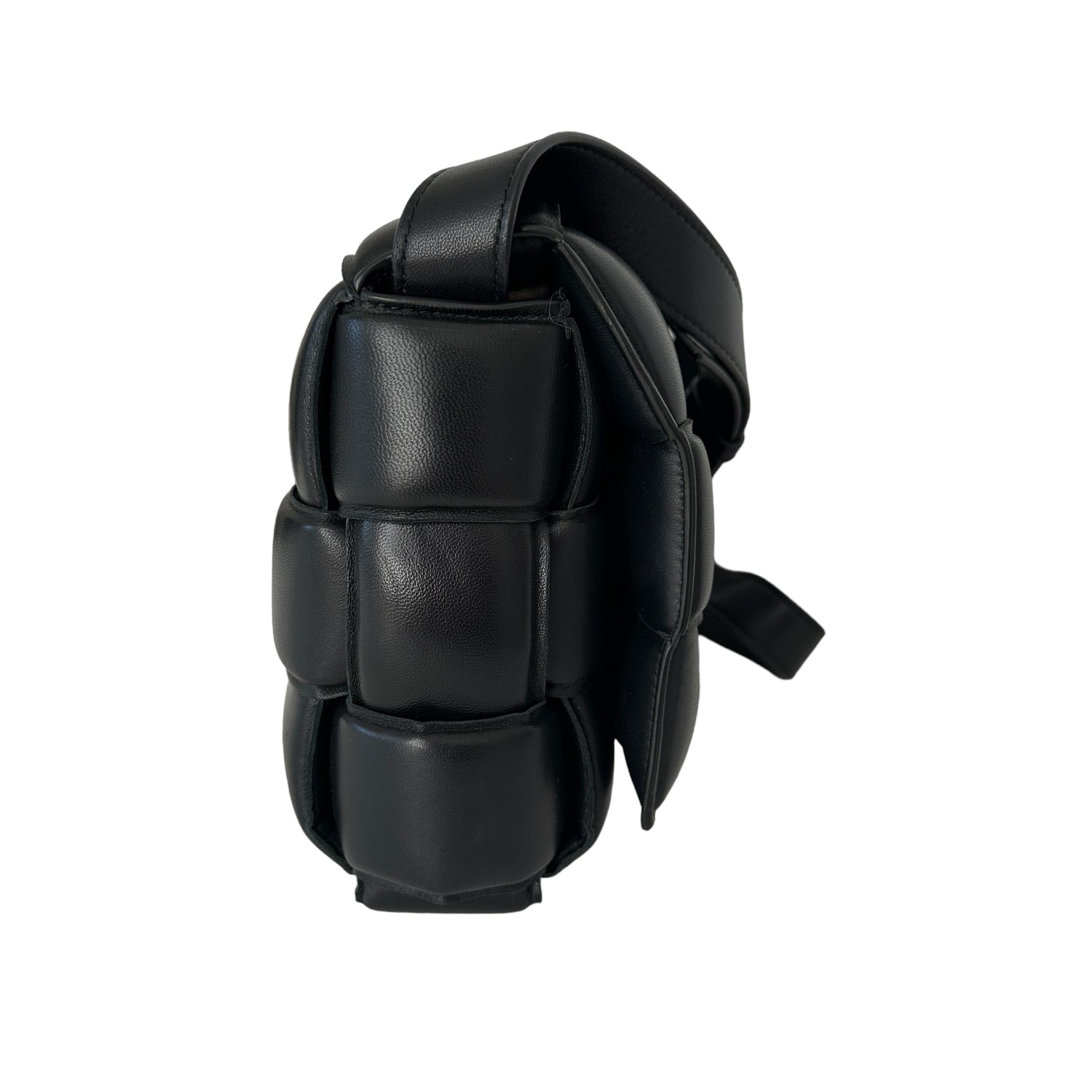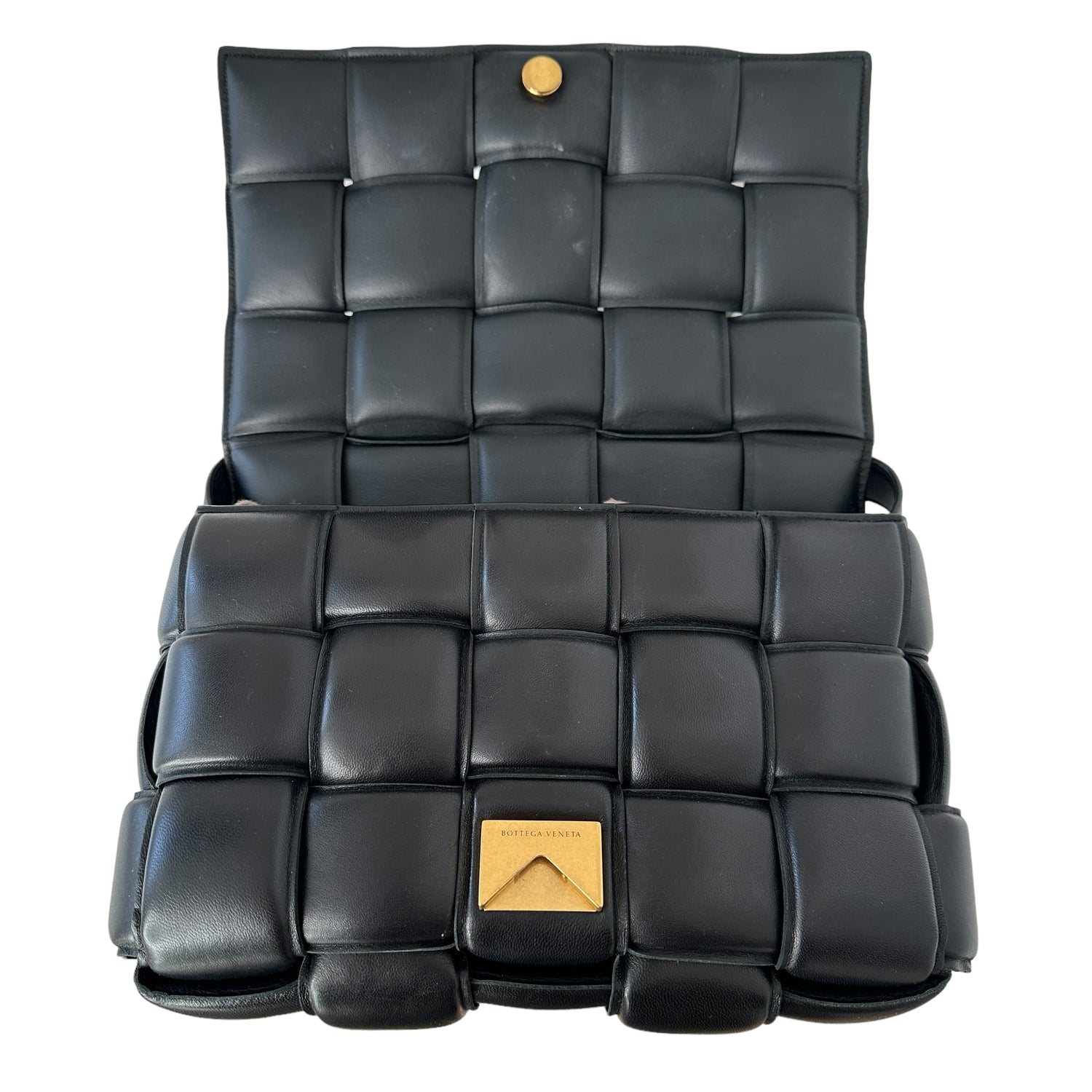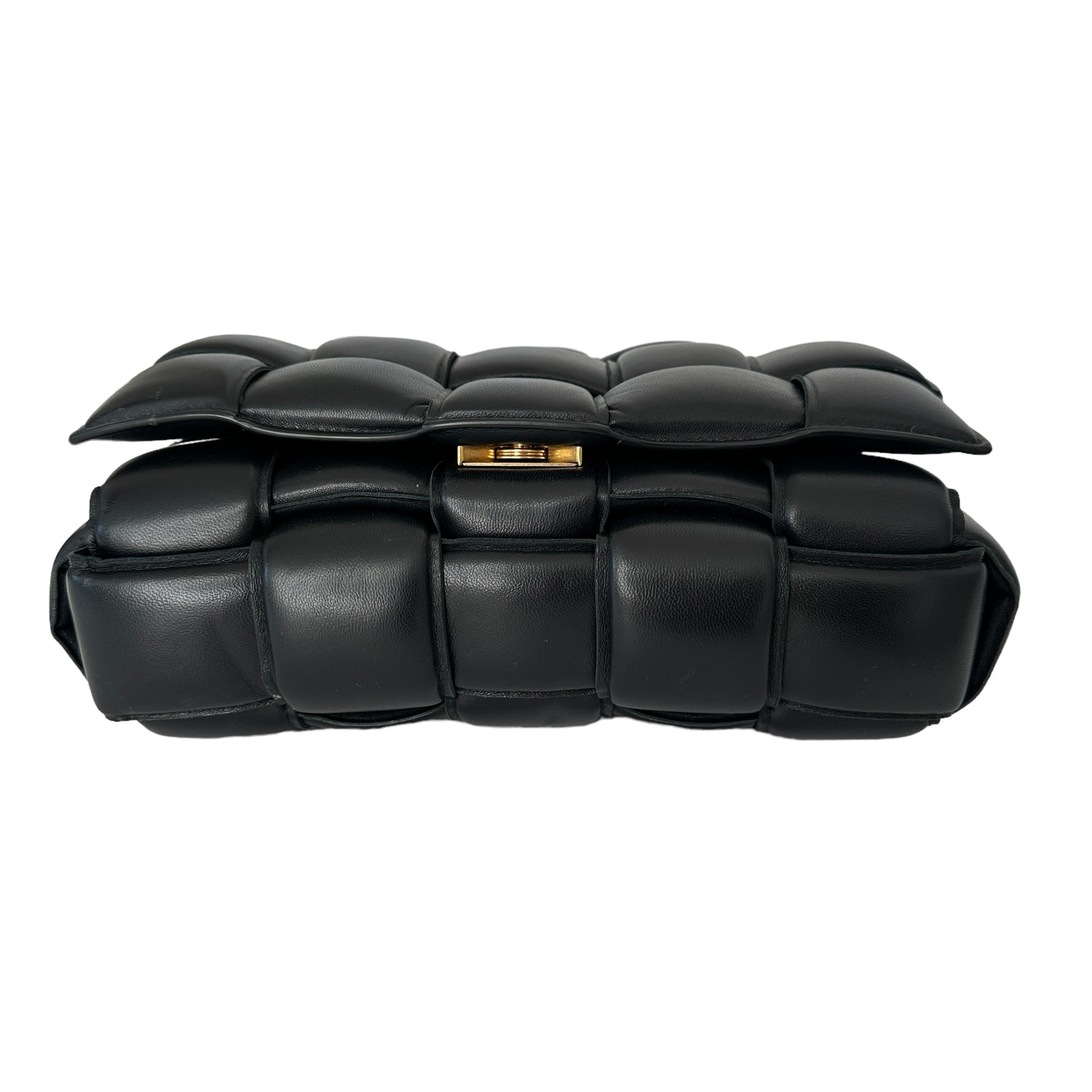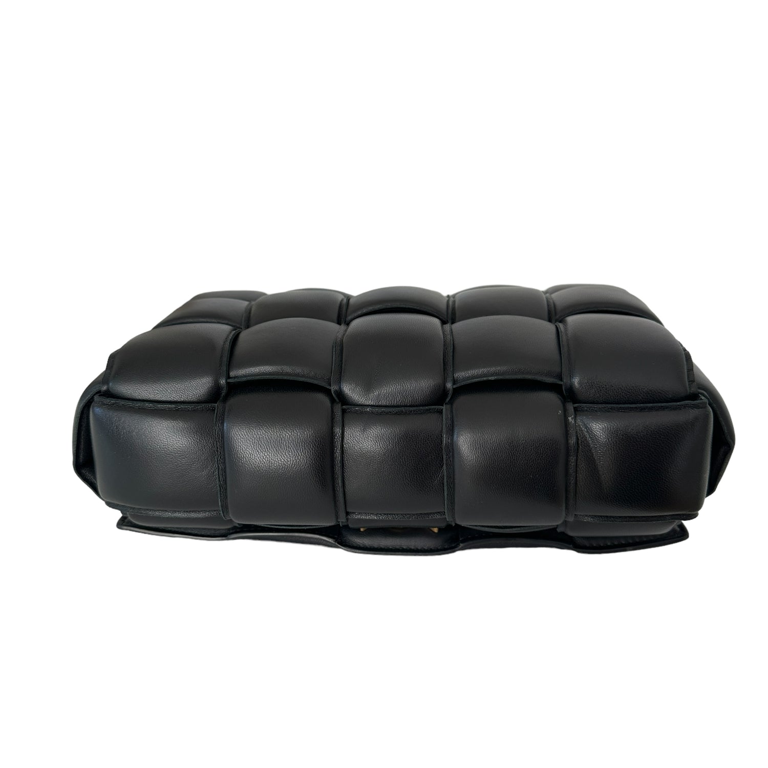 Bottega Veneta padded cassette bag. 2021 collection by Daniel Lee. Black leather. Gold-tone hardware. Puffed buttery soft lambskin leather. Adjustable strap. One zipped interior pocket.