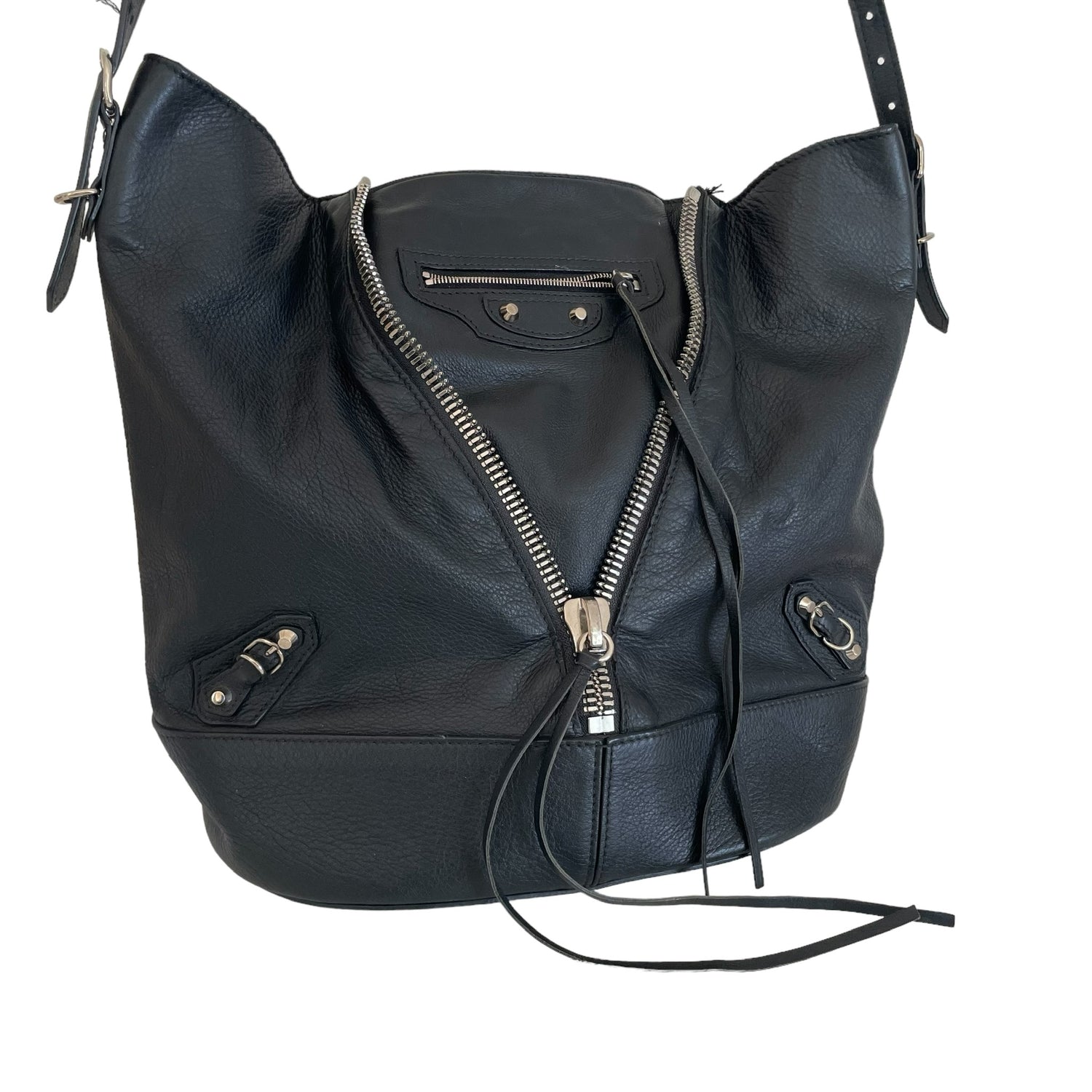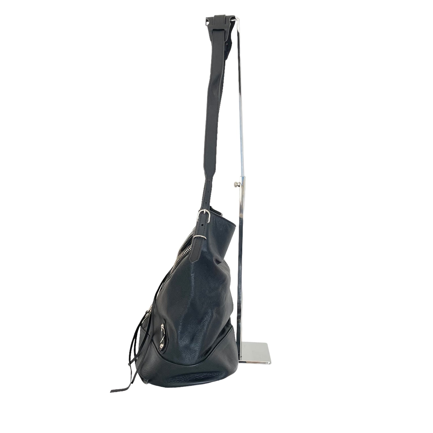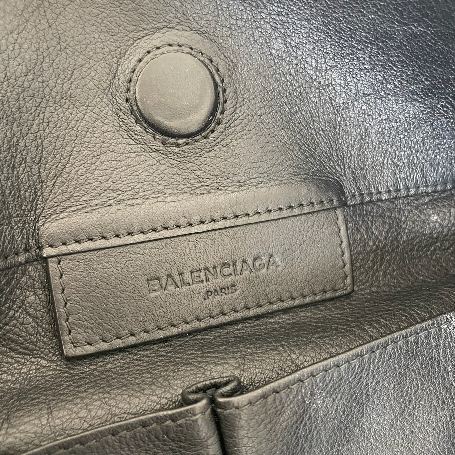 Balenciaga black Papier crossbody bag. Black leather. Silver-tone hardware. Magnetic snap closure at top. Two interior pocket. Zipper details at front with tassels.