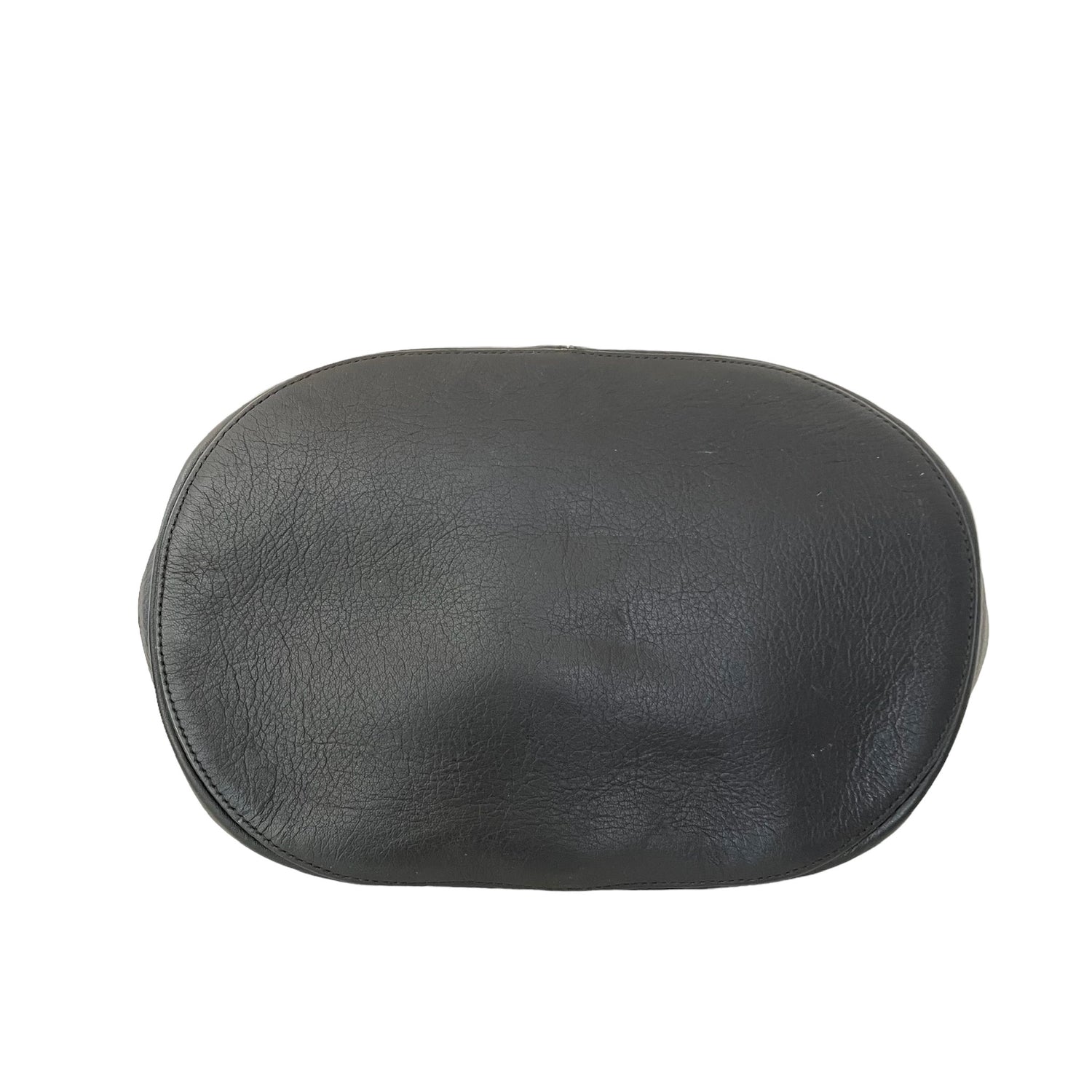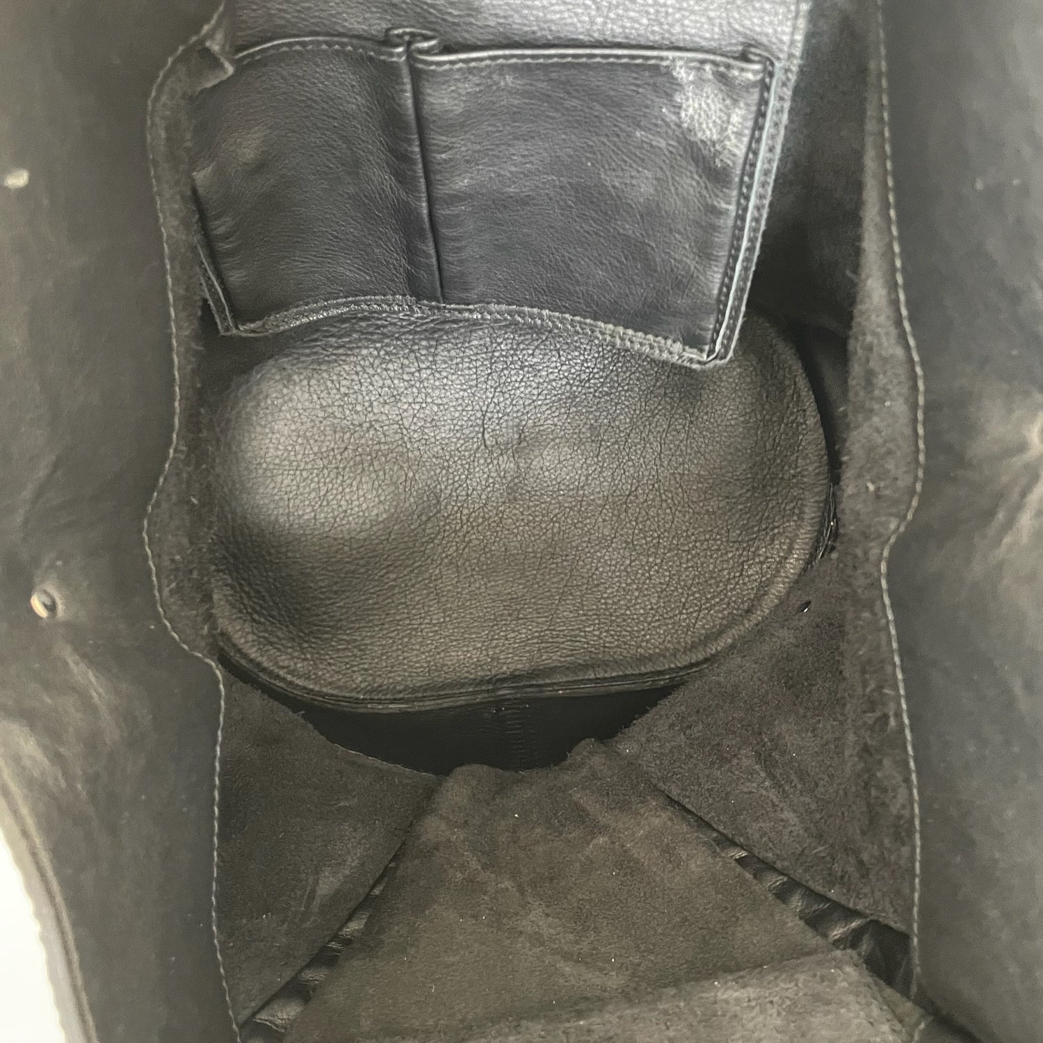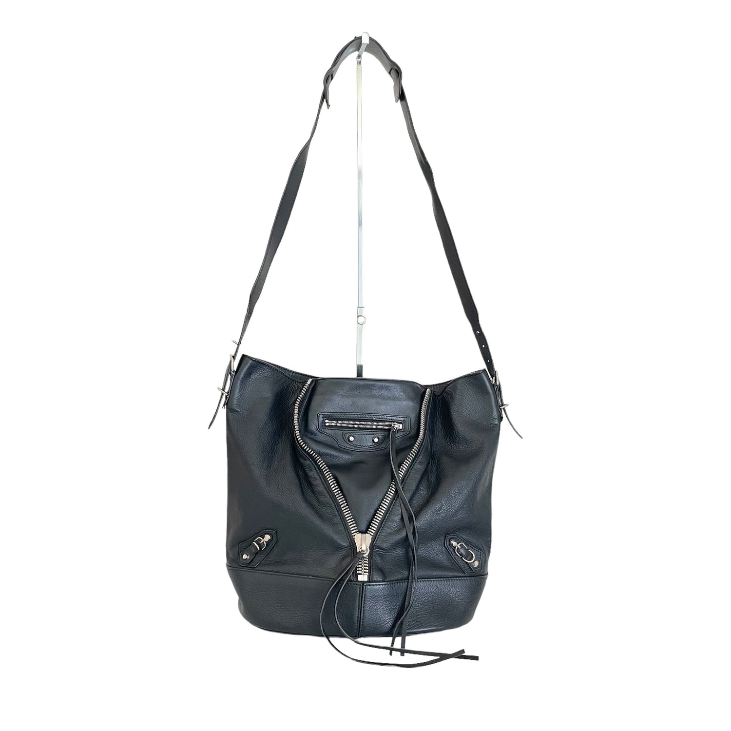 Balenciaga black Papier crossbody bag. Black leather. Silver-tone hardware. Magnetic snap closure at top. Two interior pocket. Zipper details at front with tassels.