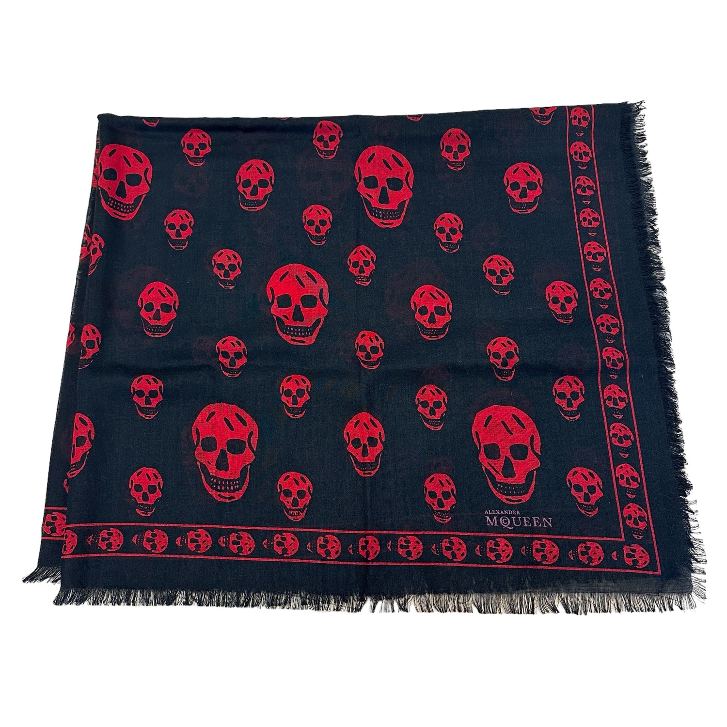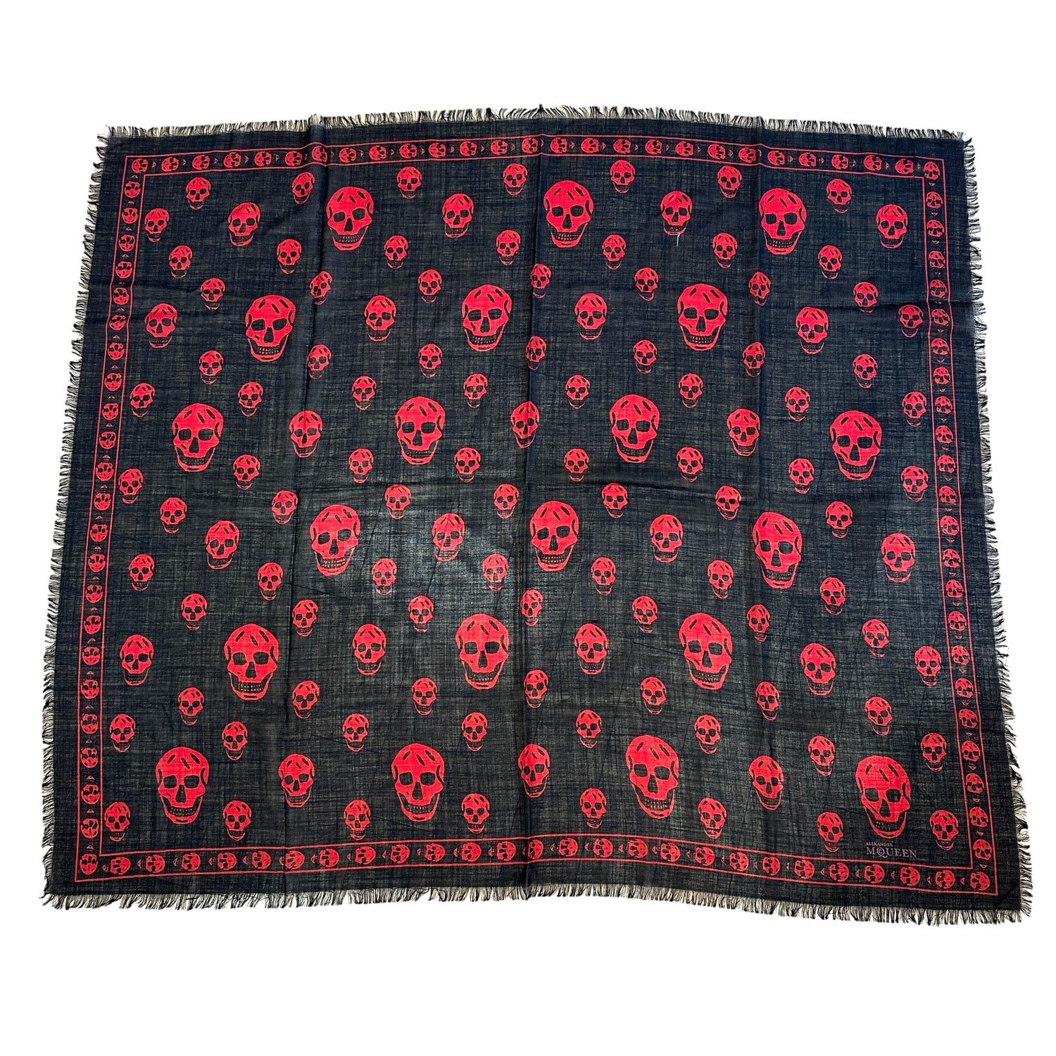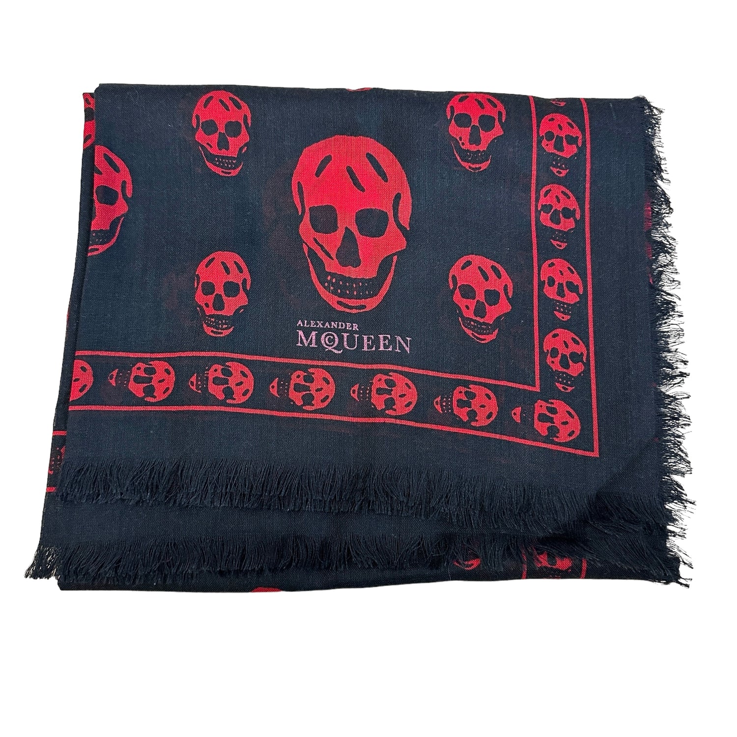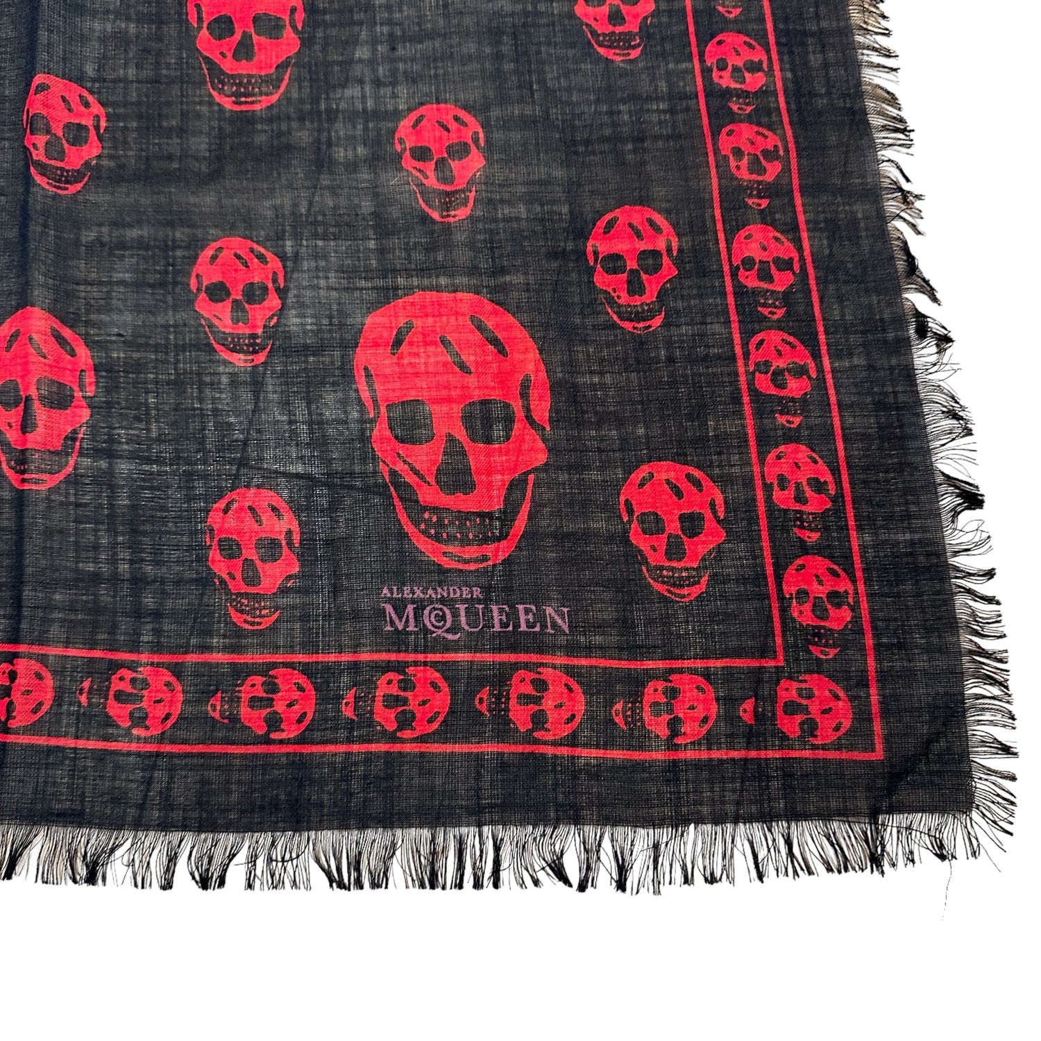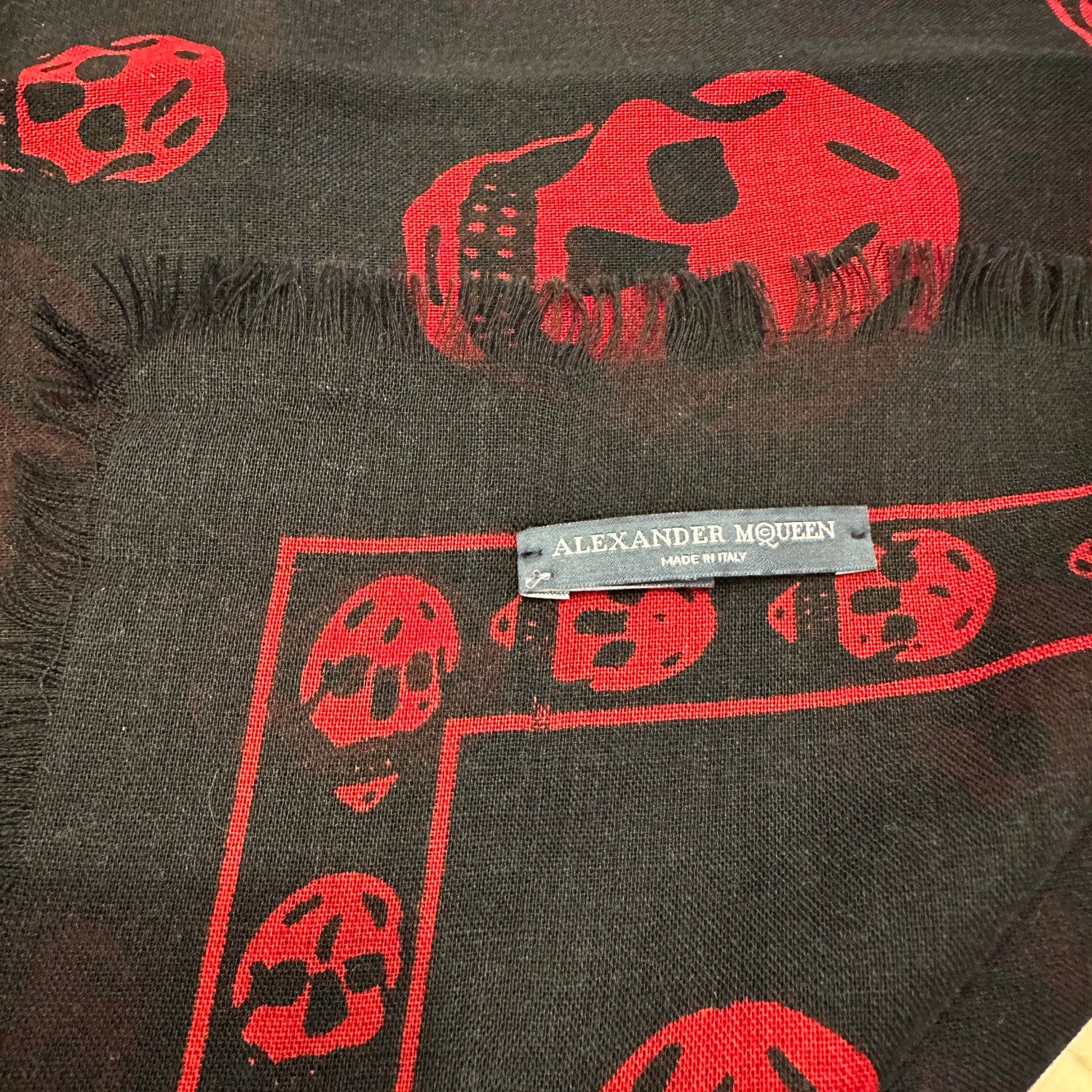 Alexander McQueen black and red scarf. Raw hem. Logo at one corner.